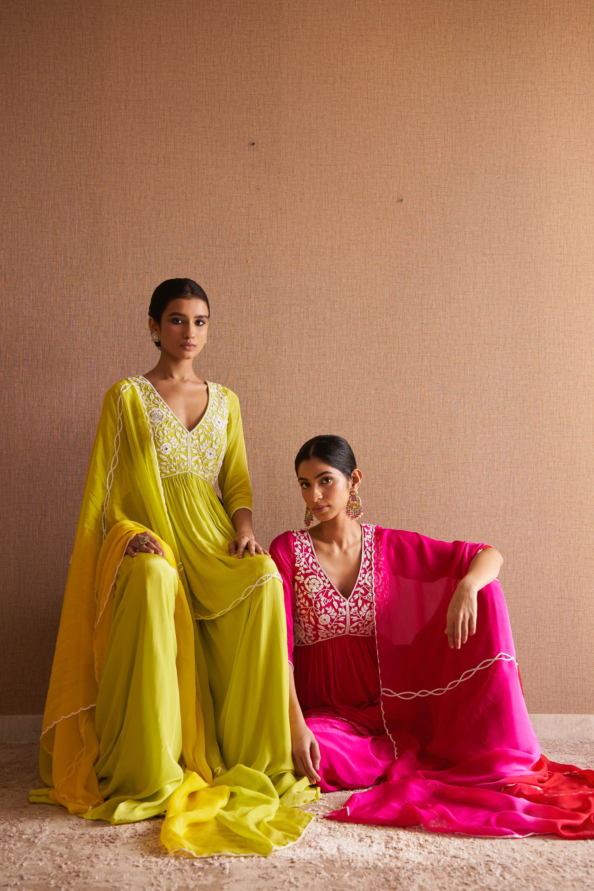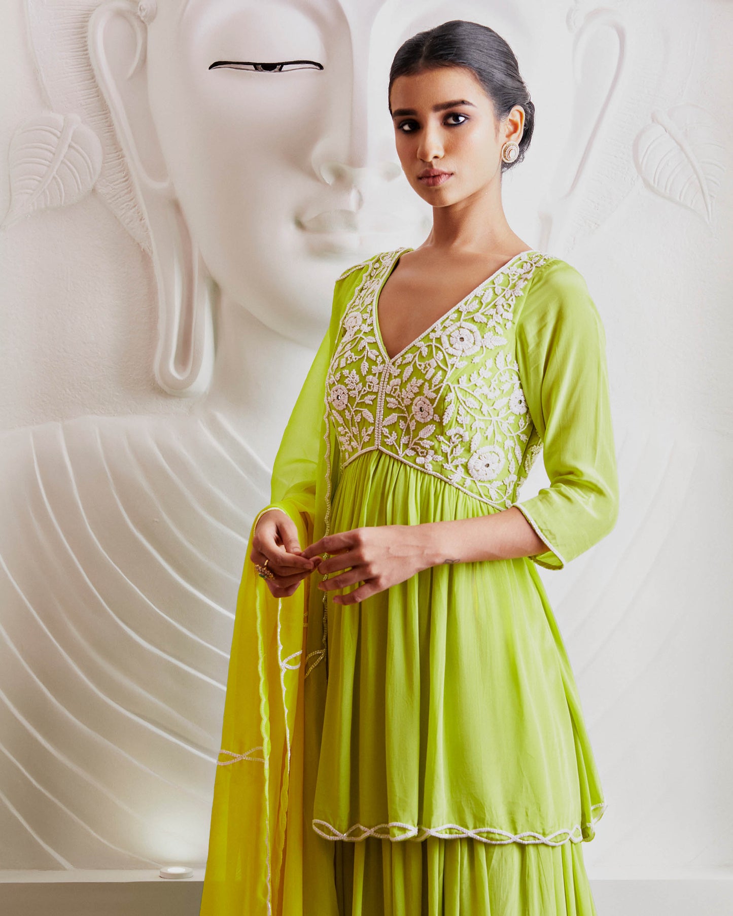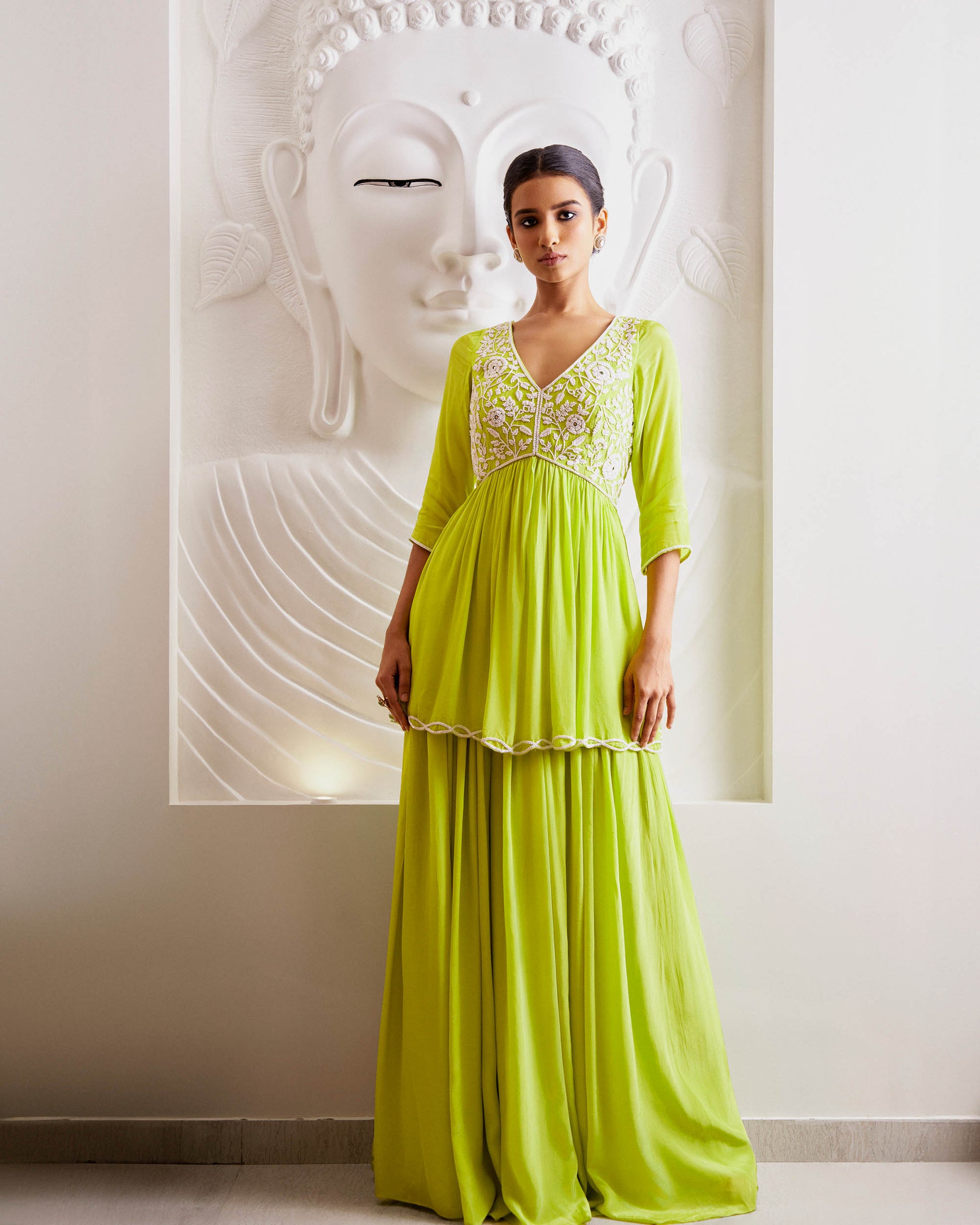 Parrot green cutdana embroidered crepe short kurti with matching pleated palazzo and embellished shaded organza dupatta.