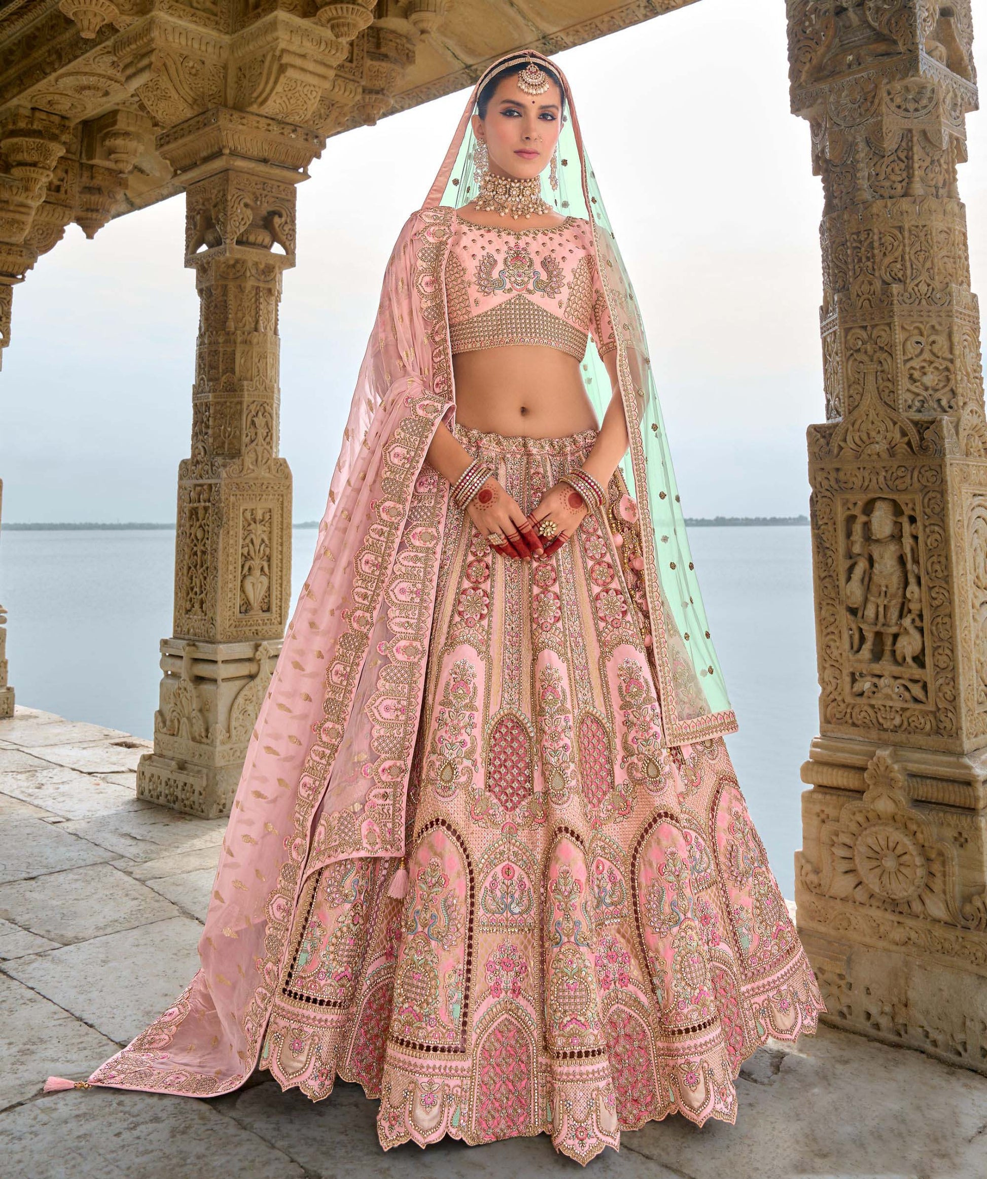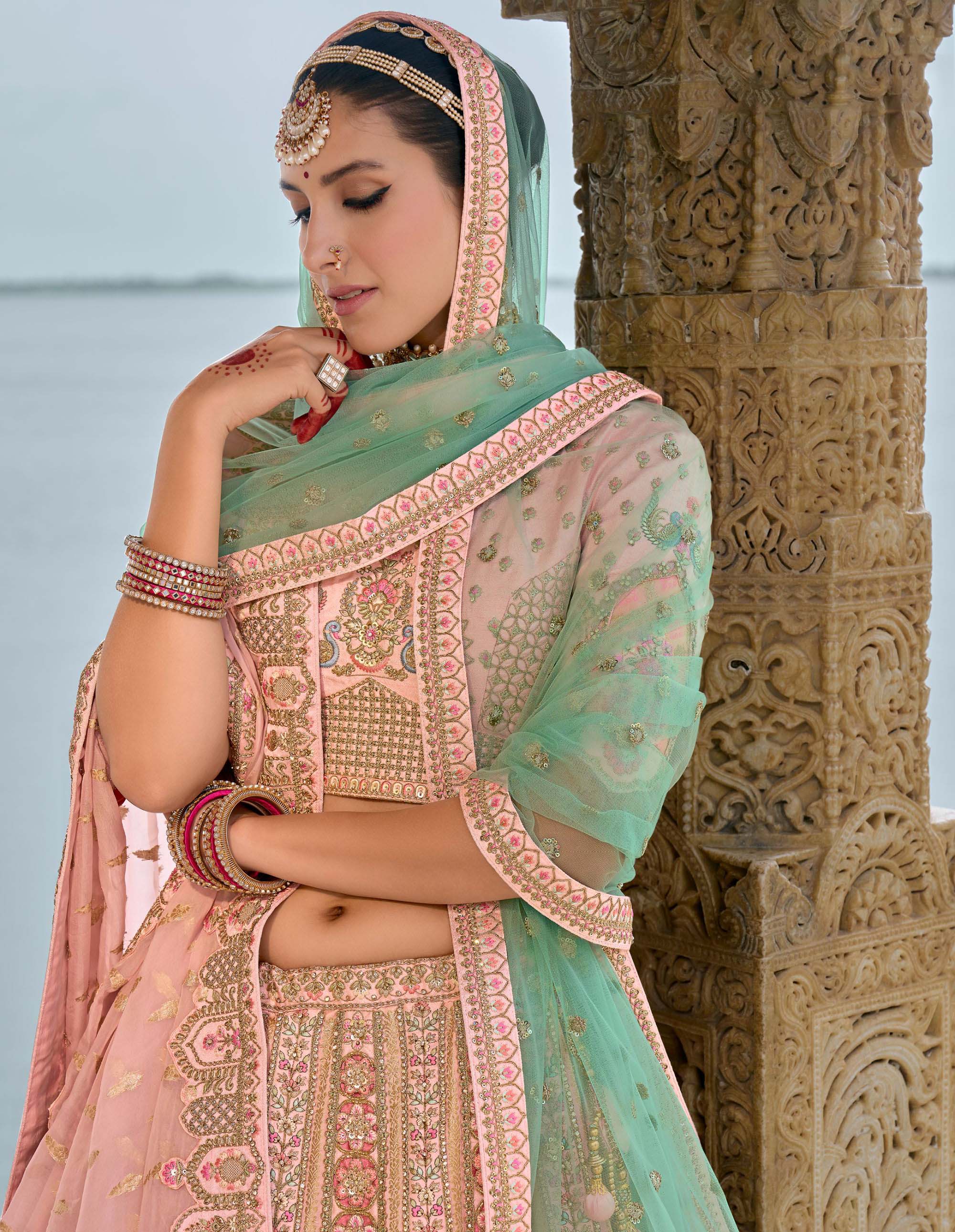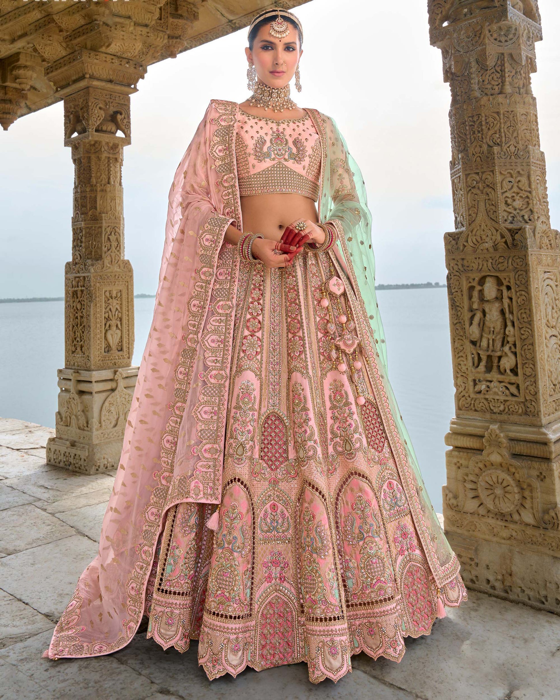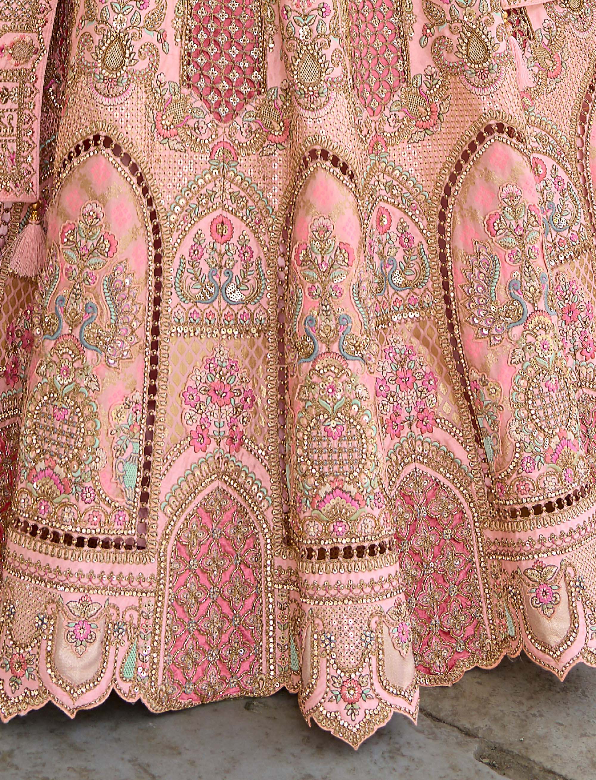 Pastel Pink Heavy Zari and Sequins Embroidery Silk Bridal Lehenga