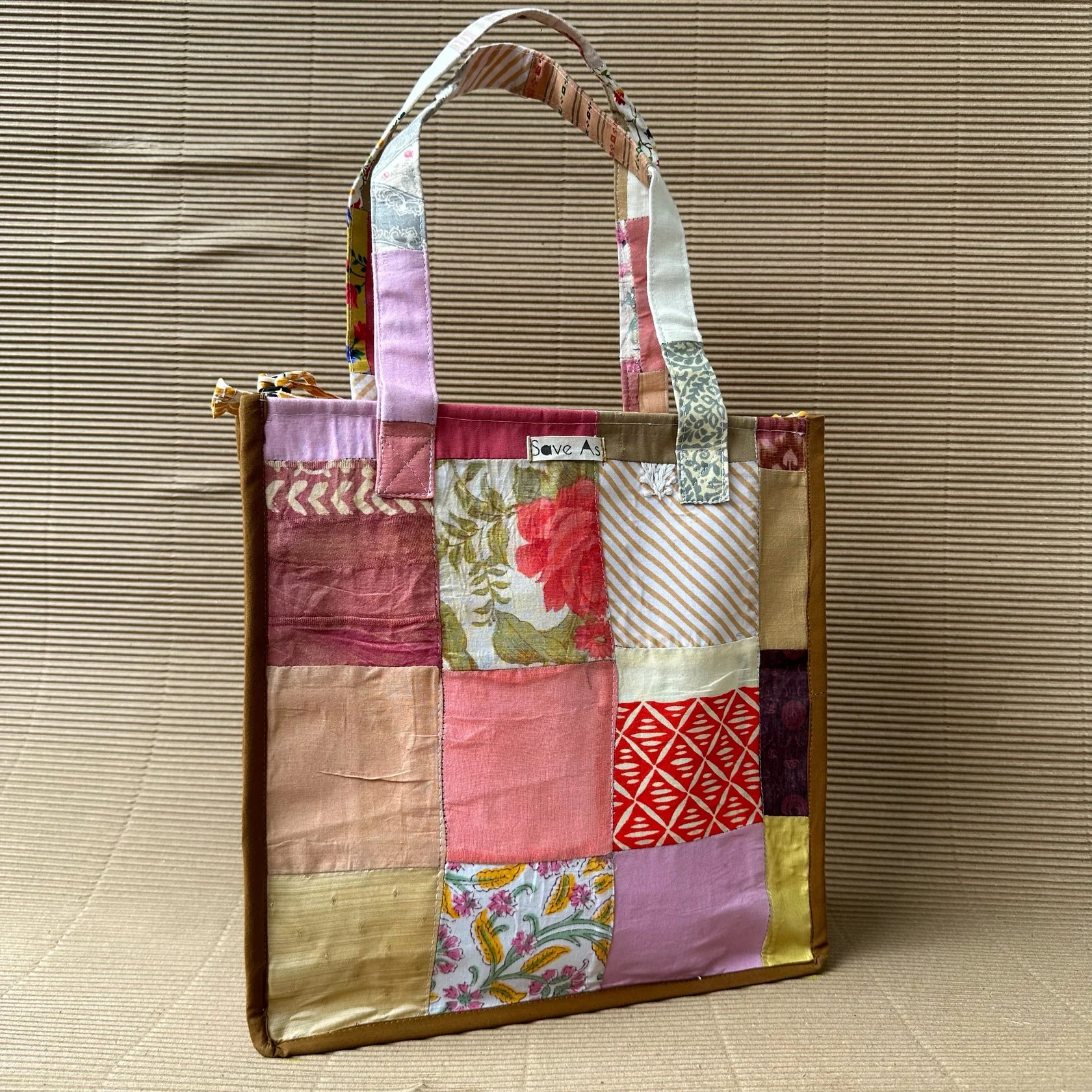 Bag made out of waste fabric pieces left out in the manufacturing process.
