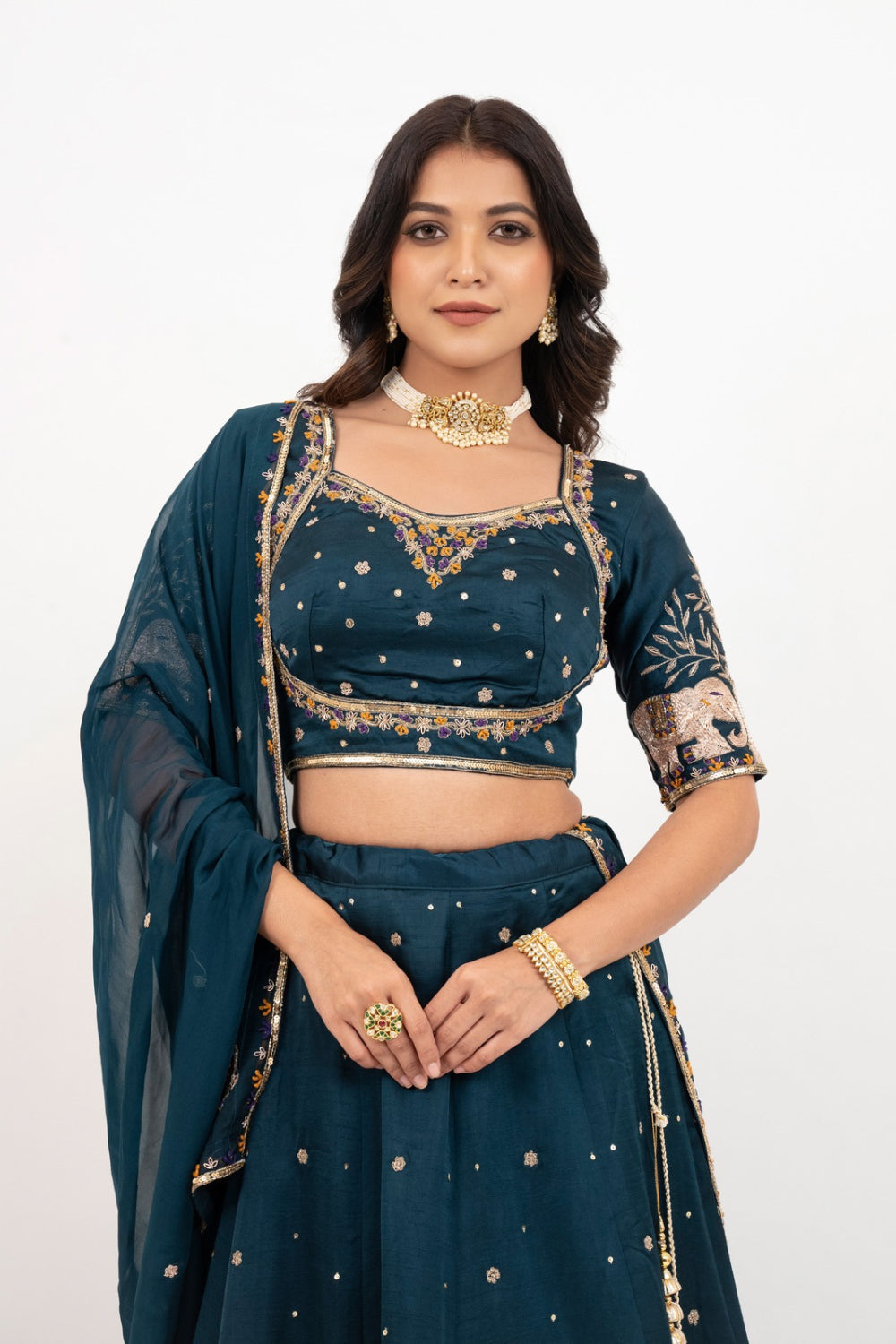 Step into the spotlight with our peacock blue soft silk lehenga choli. This exquisite ensemble features intricate zardozi embroidery and hand-cut dana work, showcasing beautiful elephant motifs complemented by delicate golden details on the lehenga. The blouse is adorned with charming floral motifs, and the look is completed with a matching dupatta that highlights the same elephant motifs.