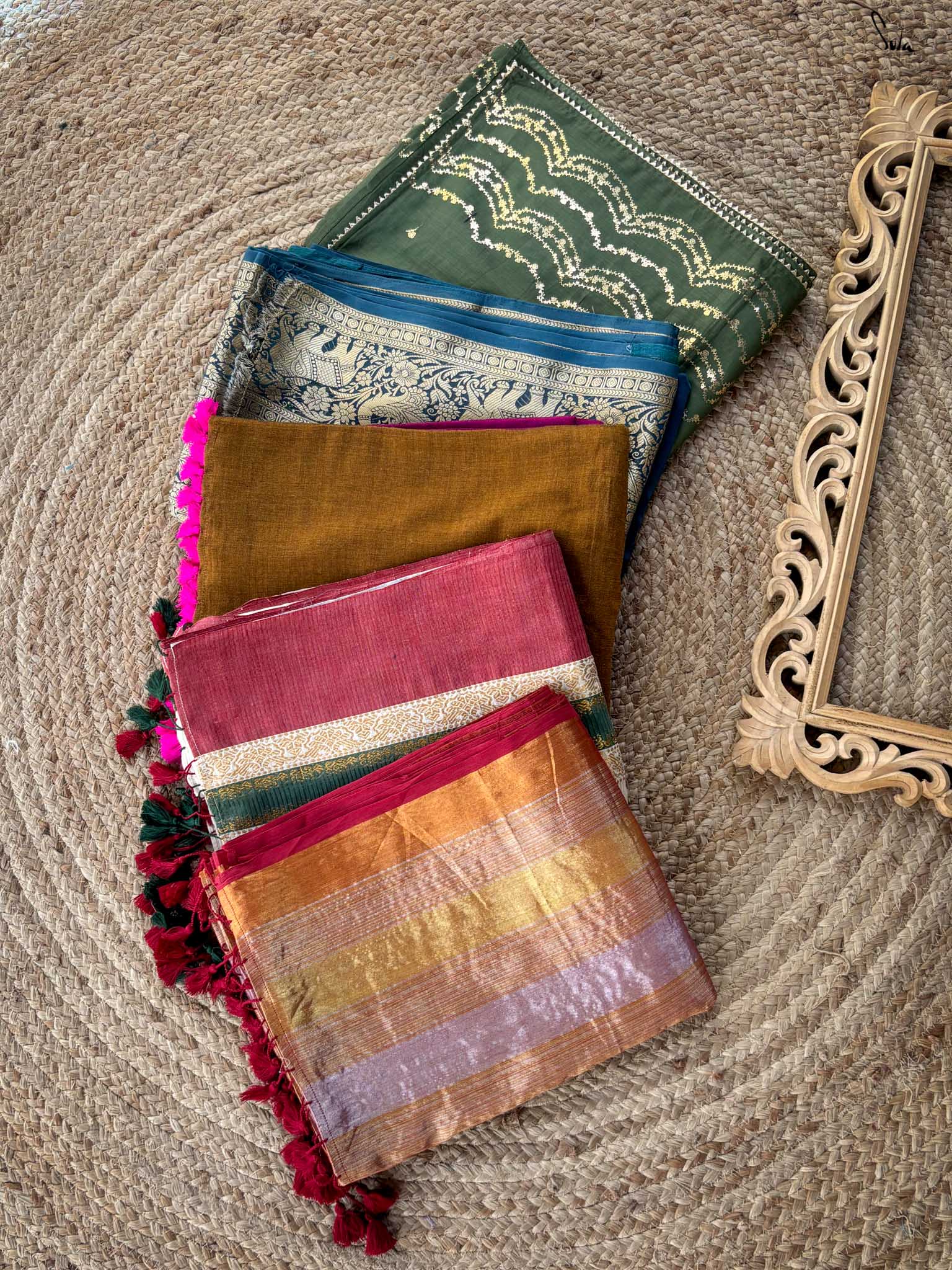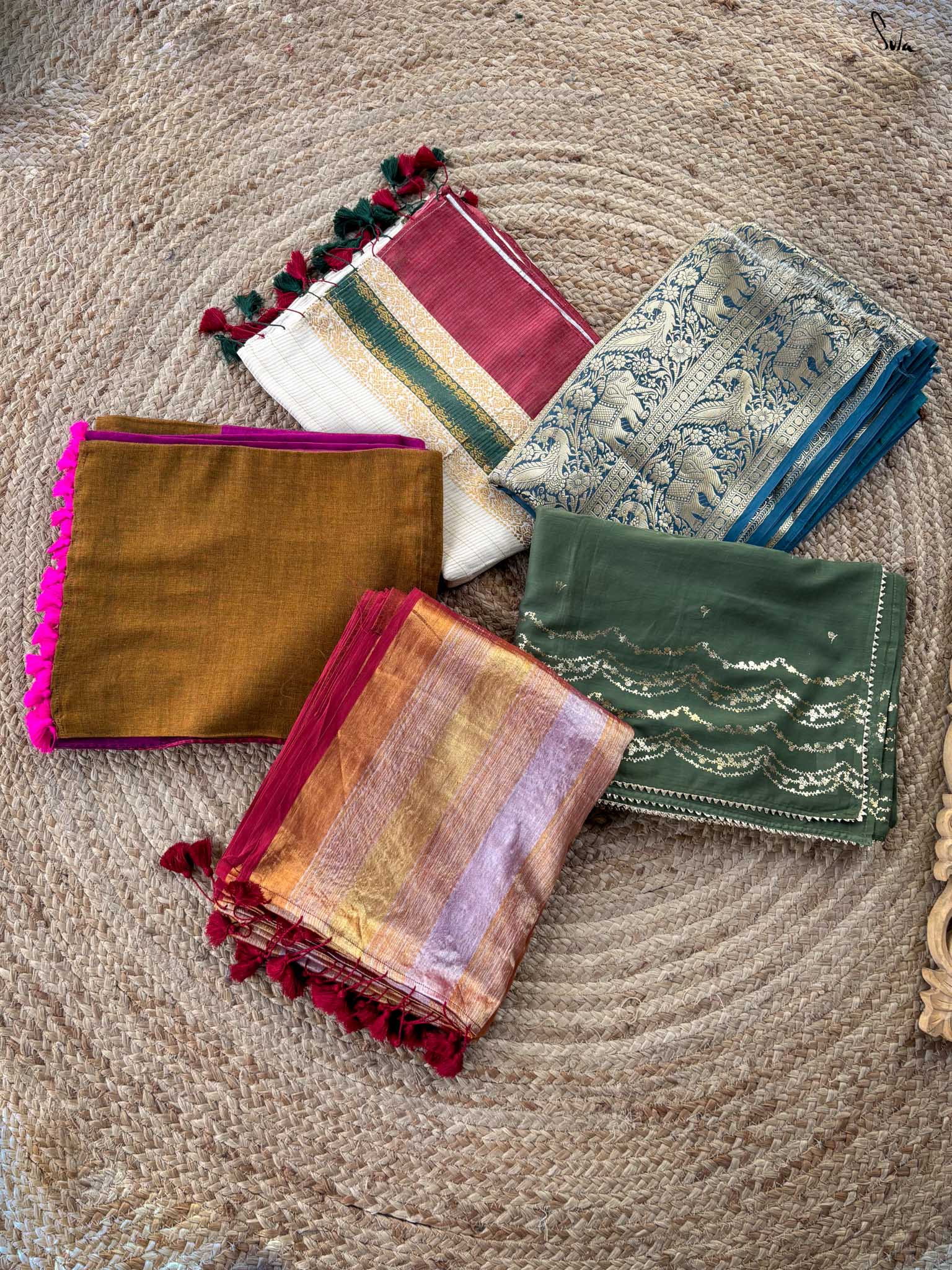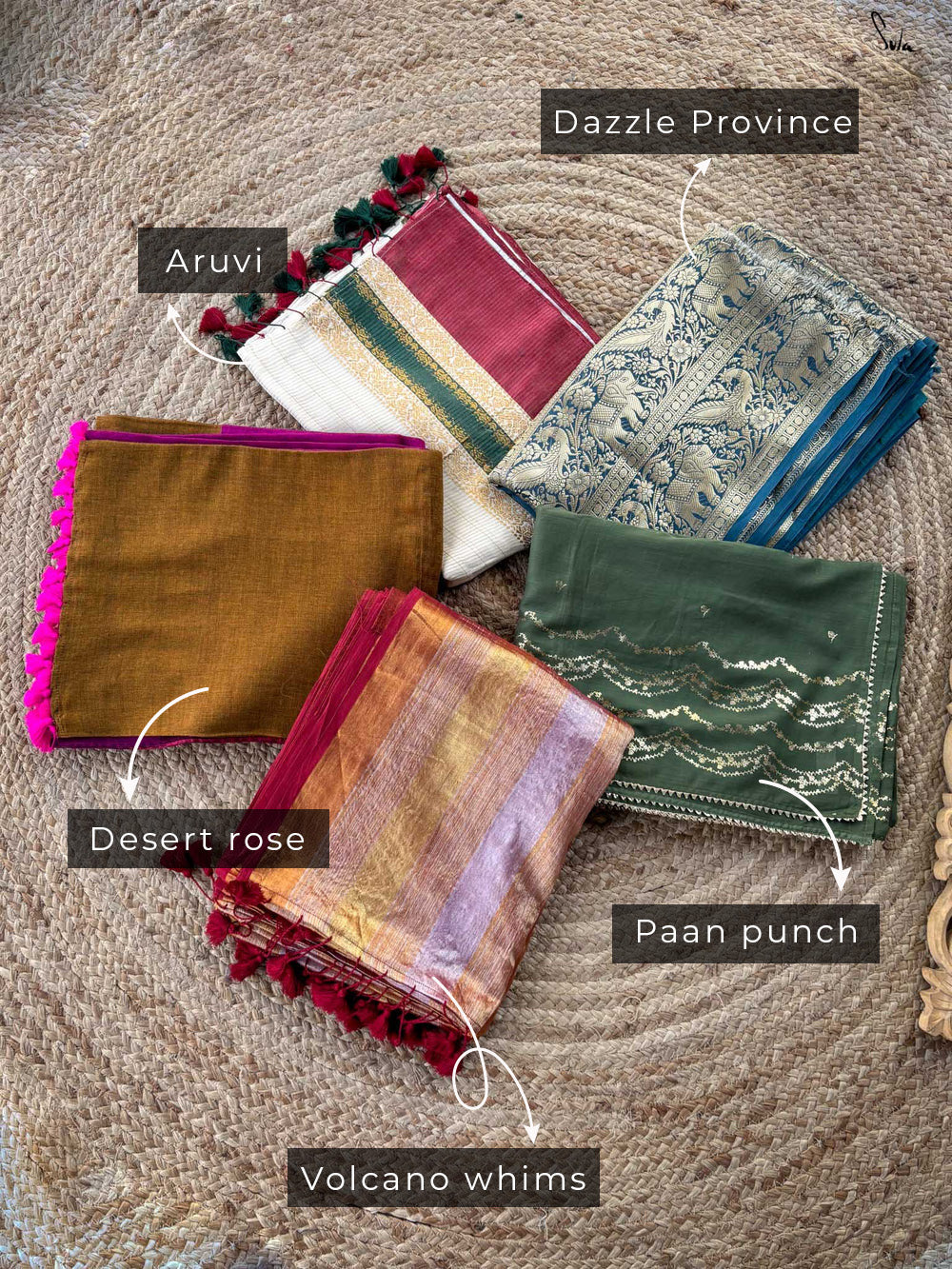 Let your colorful fashion spread its wings with our stunning "Peacock Paradise" saree combo! This exquisite collection of 5 sarees, crafted from a diverse set of fabrics, showcases unique designs and colors that evoke the majestic beauty of the peacock. Each saree is a masterpiece of versatility, inspiring the wearer to create their fashion paradise.