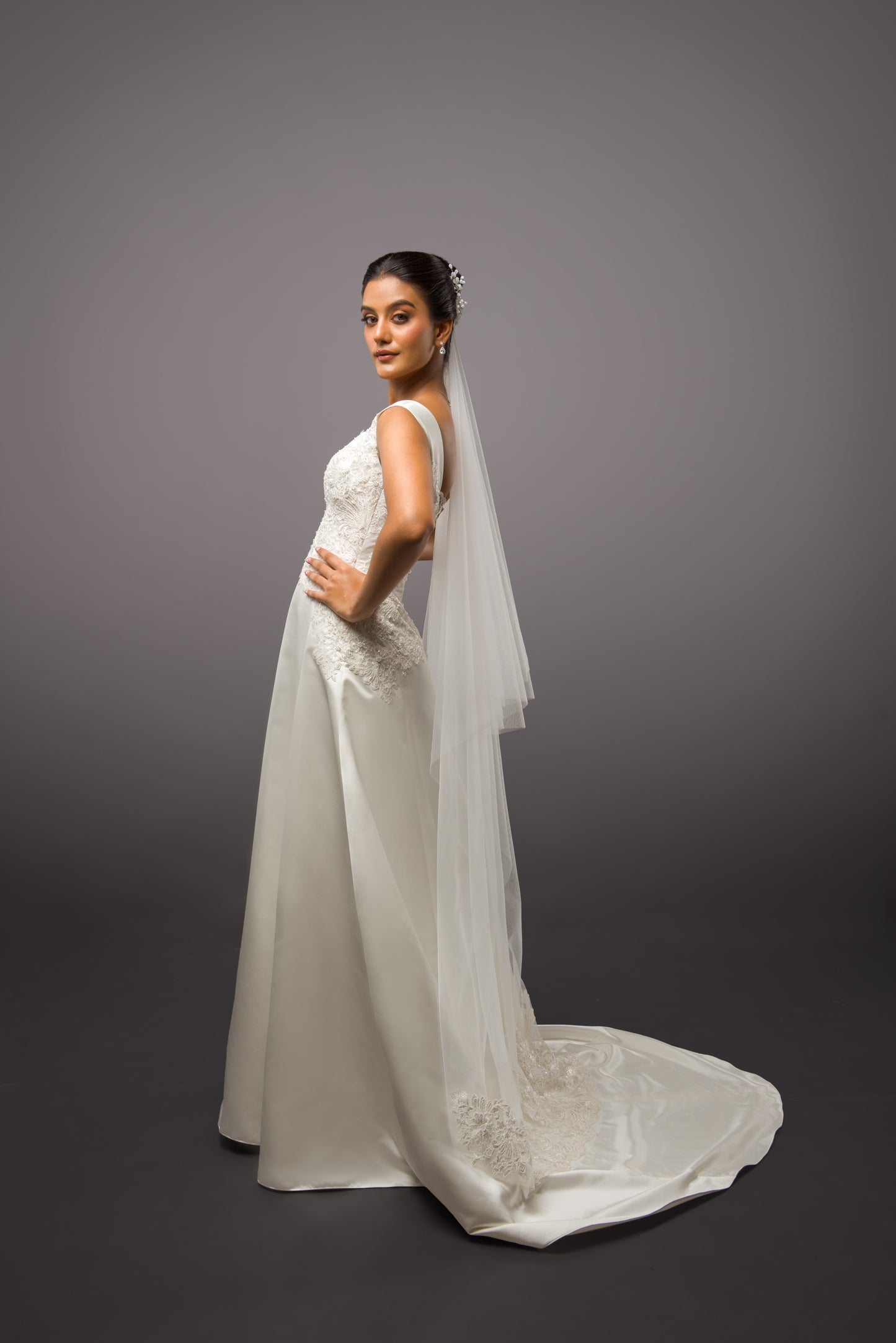 A simple, elegant, semi-fitted wedding dress with lace is a timeless and refined bridal gown that effortlessly combines classic beauty with a touch of romantic charm. With veil