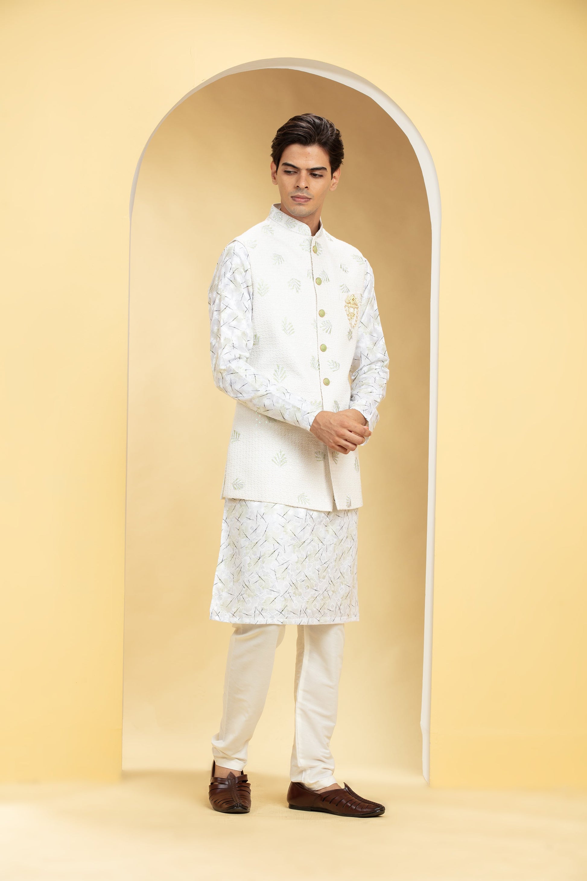 Pearl White Lucknowi kurta Jacket Set with Embellishments