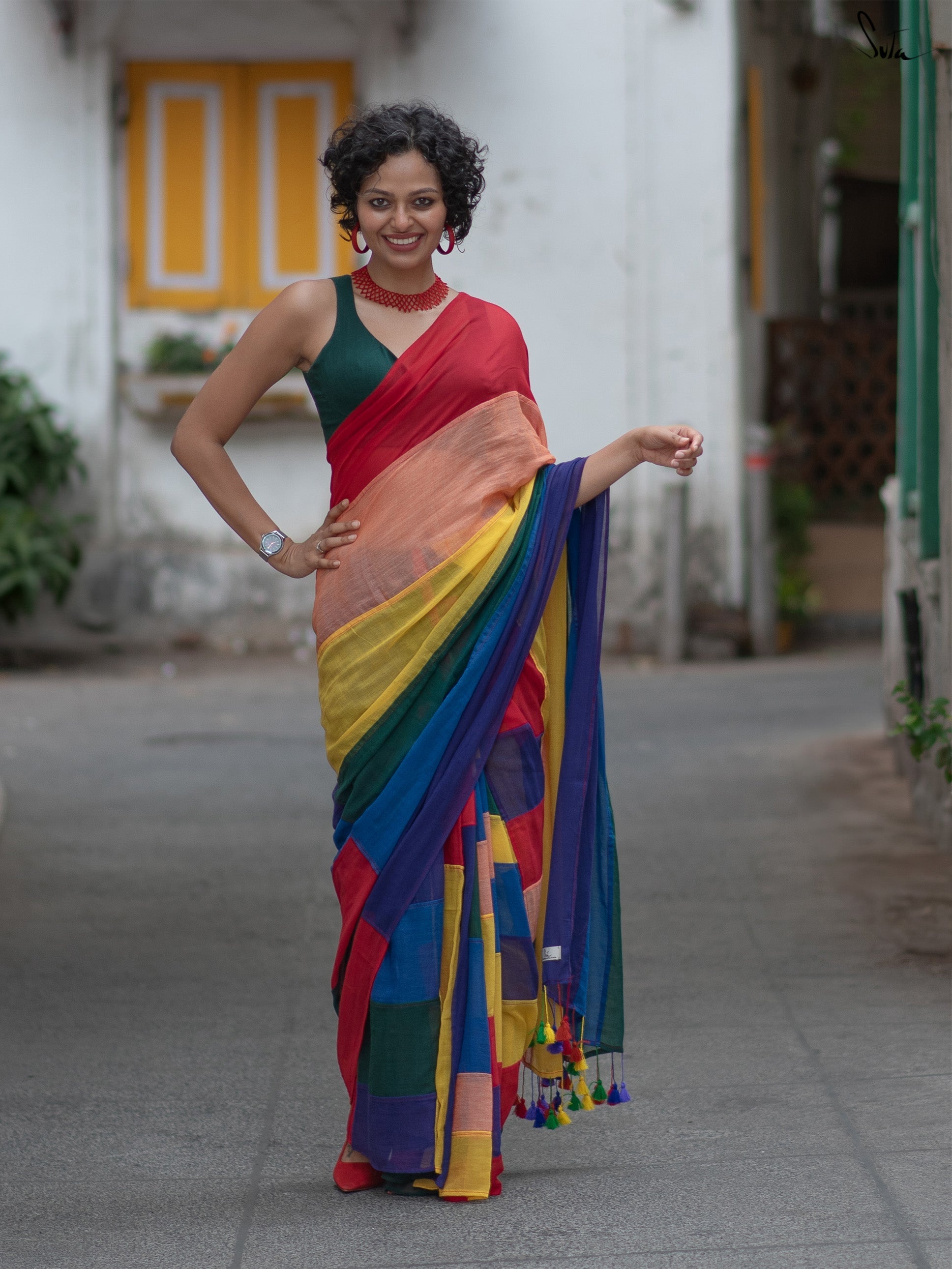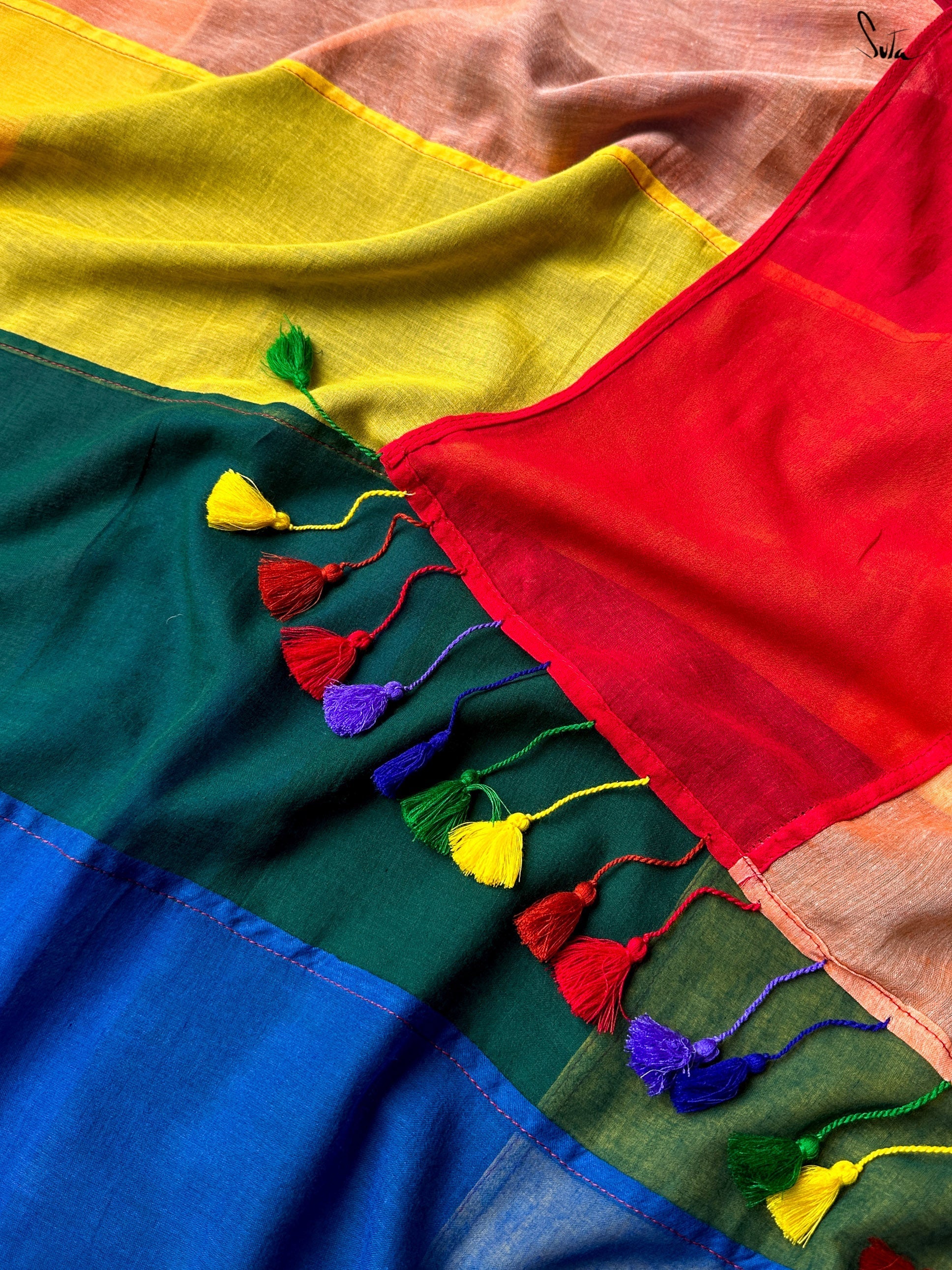 This "Perfect Patch" Mul cotton saree is a vibrant celebration of individuality and inclusivity adorned with playful dancing and dazzling tassels!