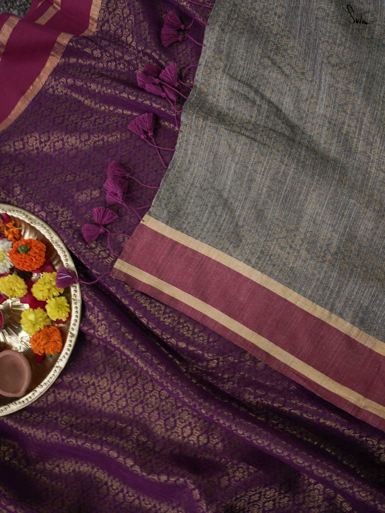 lightweight, comfortable cotton slub fabric. Adorned with a pink and gold border, this saree delves into the richness of festivities with the ‘one-of-a-kind’ style featuring intricate zari detailing throughout and a contrasting grey pallu.