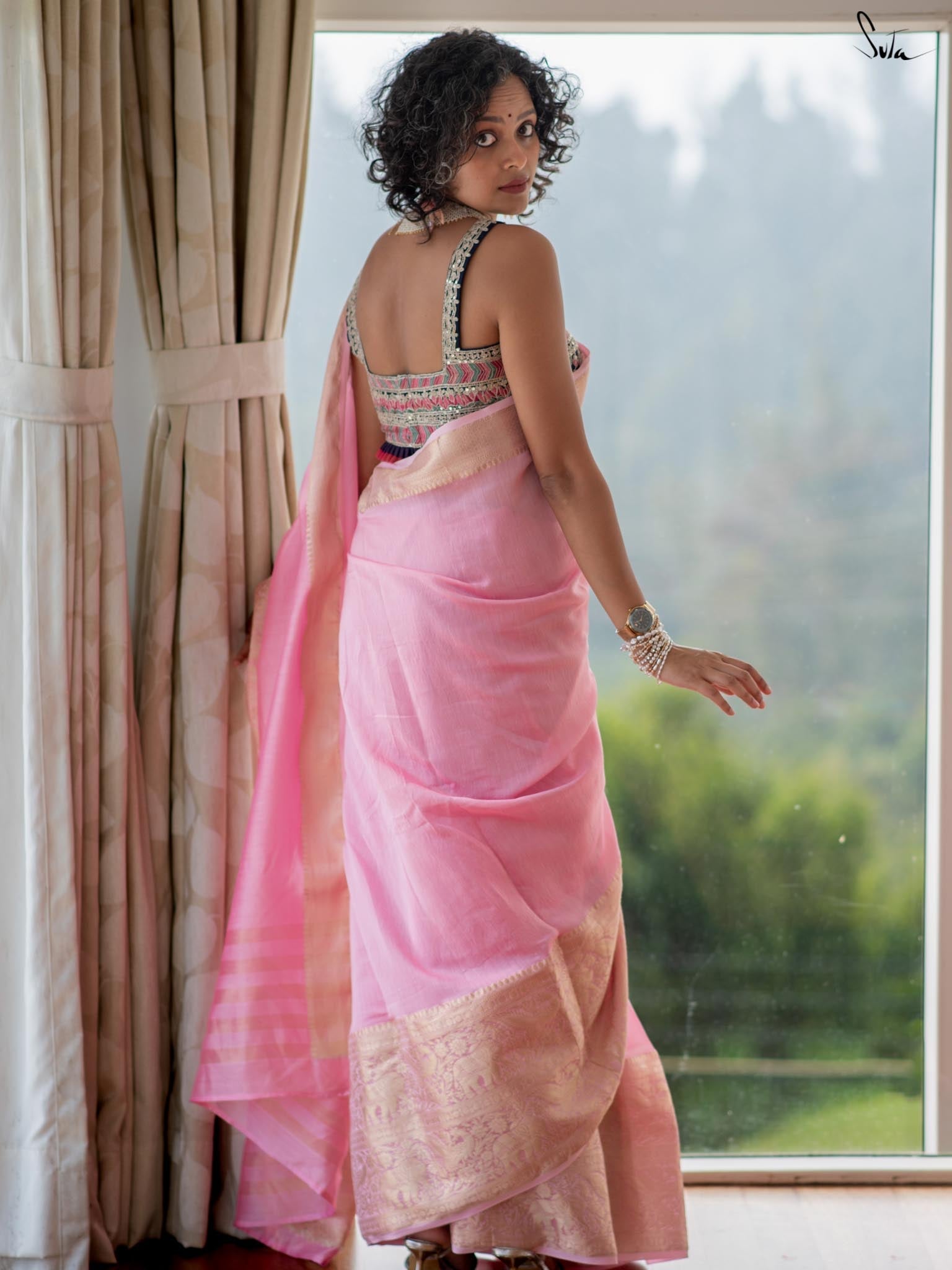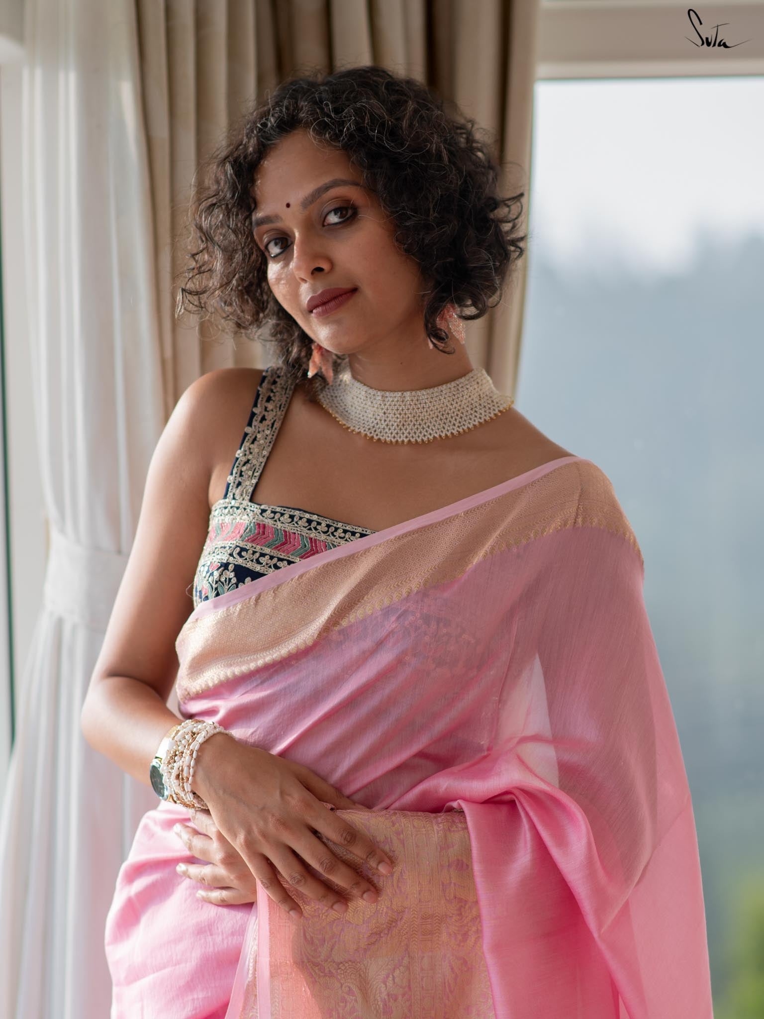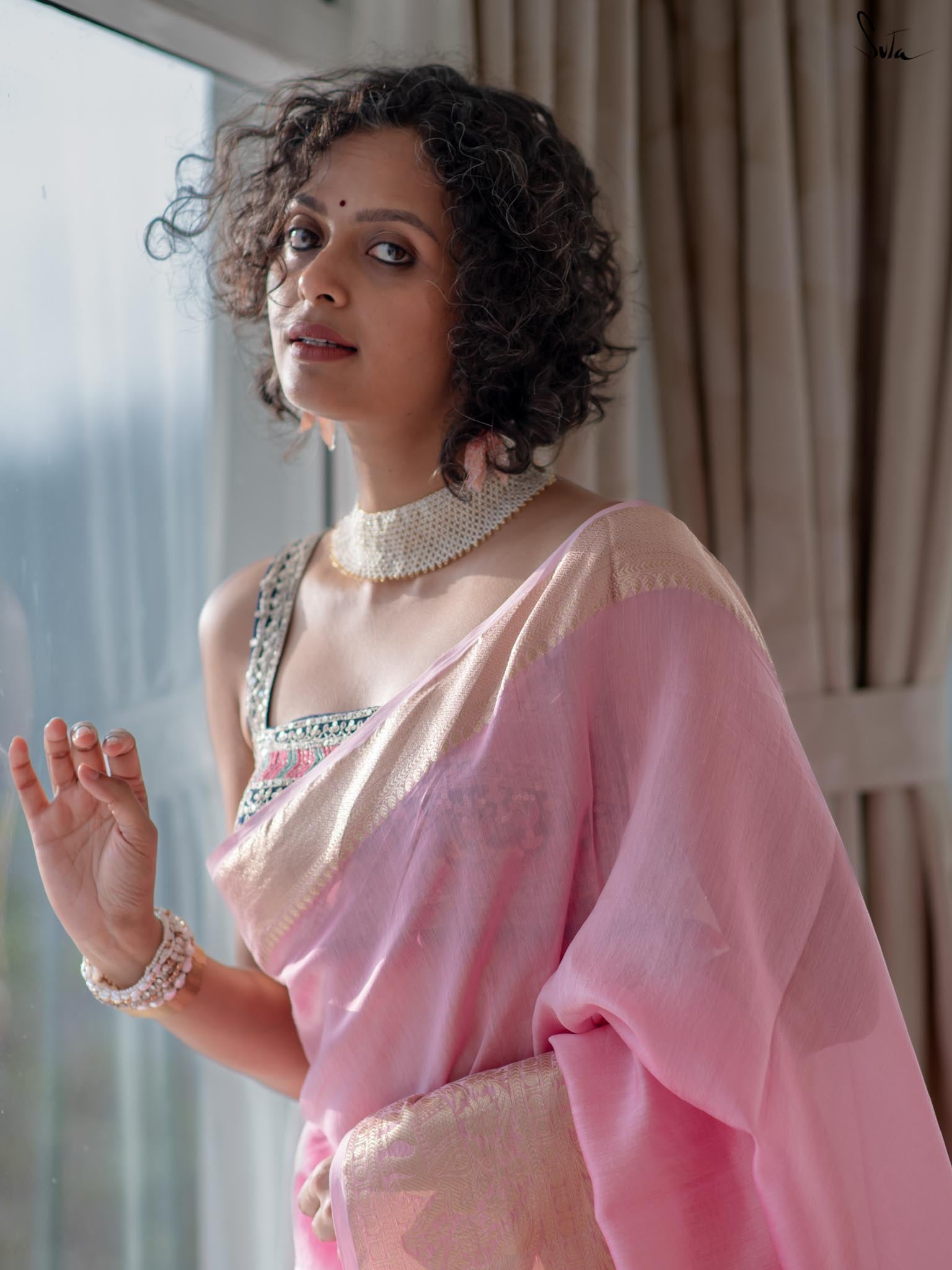 Imagine a field of colorful blooms surrounding you, painting your soul with positivity and beauty! The 'Phoolon Ki Lori' saree is a testament to that same feeling! Made up of cotton polyester fabric, this baby pink saree is woven with animal motifs, making it a must-have special ensemble for your wedding wardrobe!