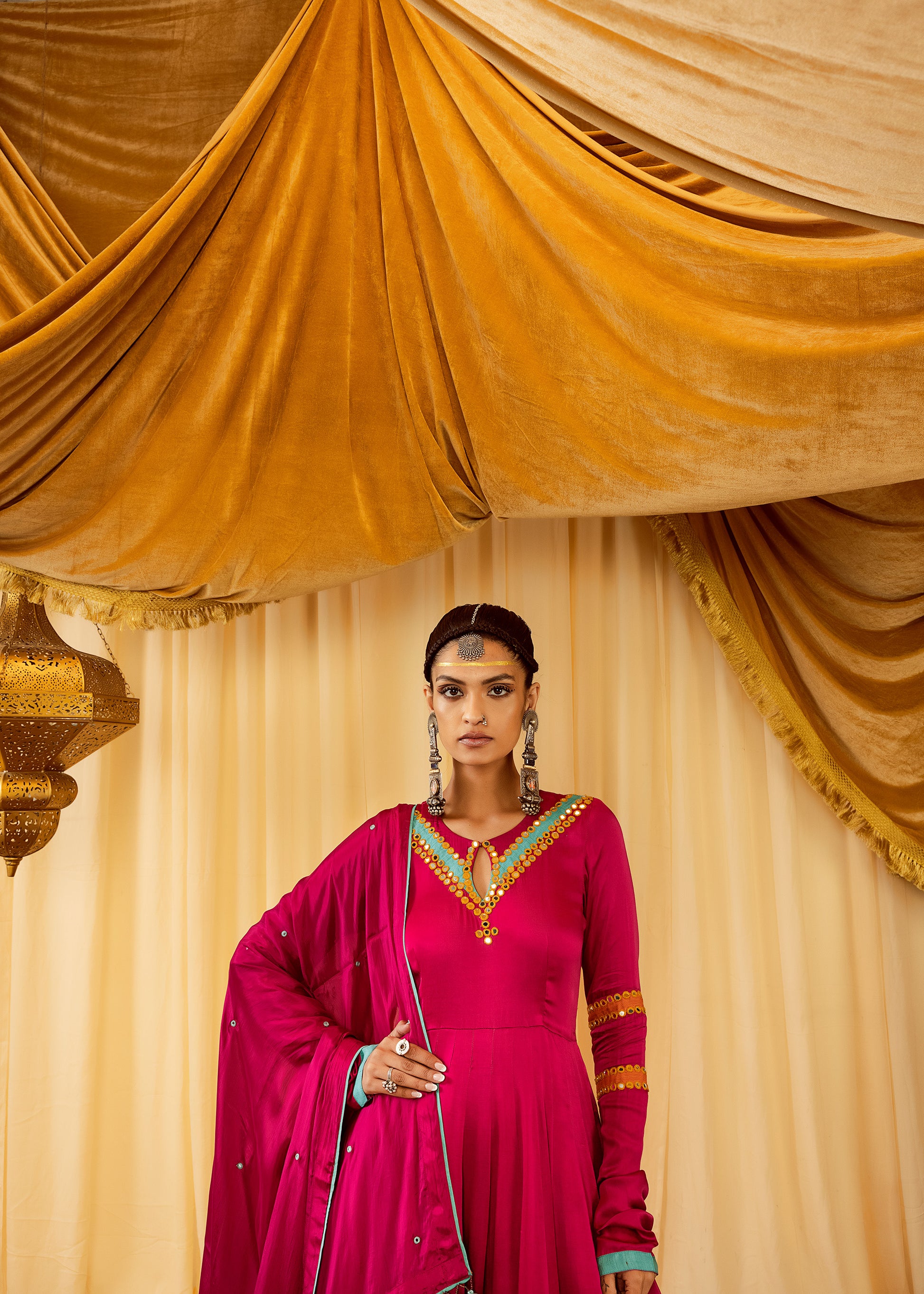 This is a Anarkali set that features patch working on the borders with mirror work on contrast border. The contrast patch work is also a part of the neckline to accentuated the look. Paired up with pink colored duppatta with contrast borders & mirror work..