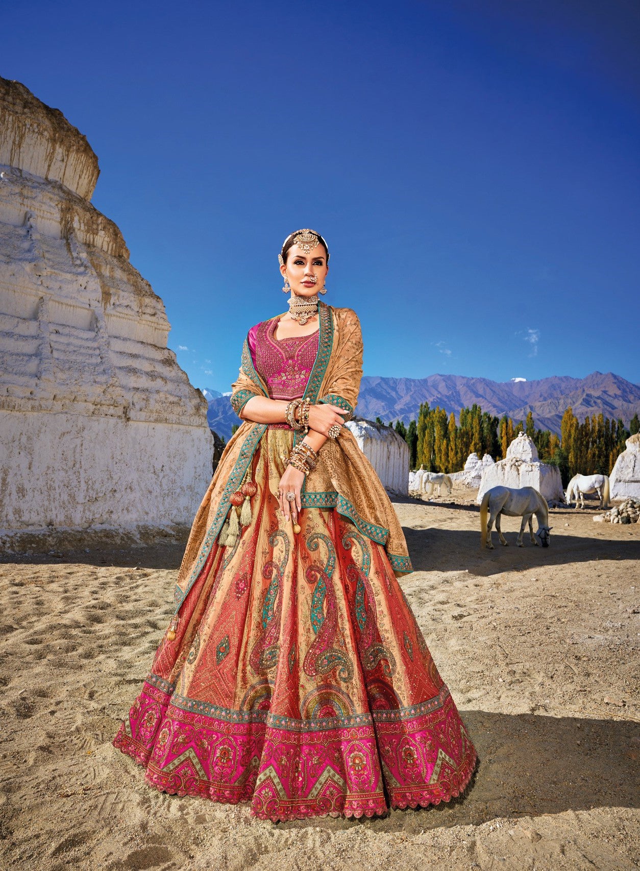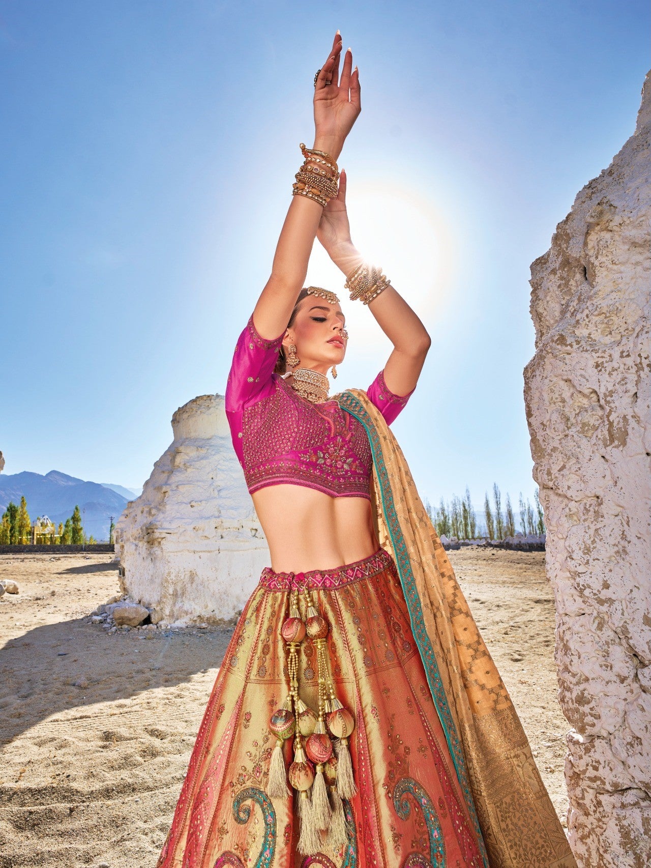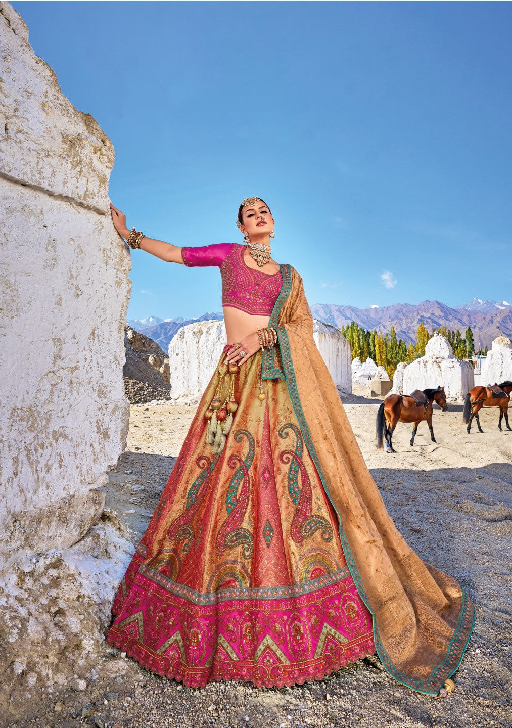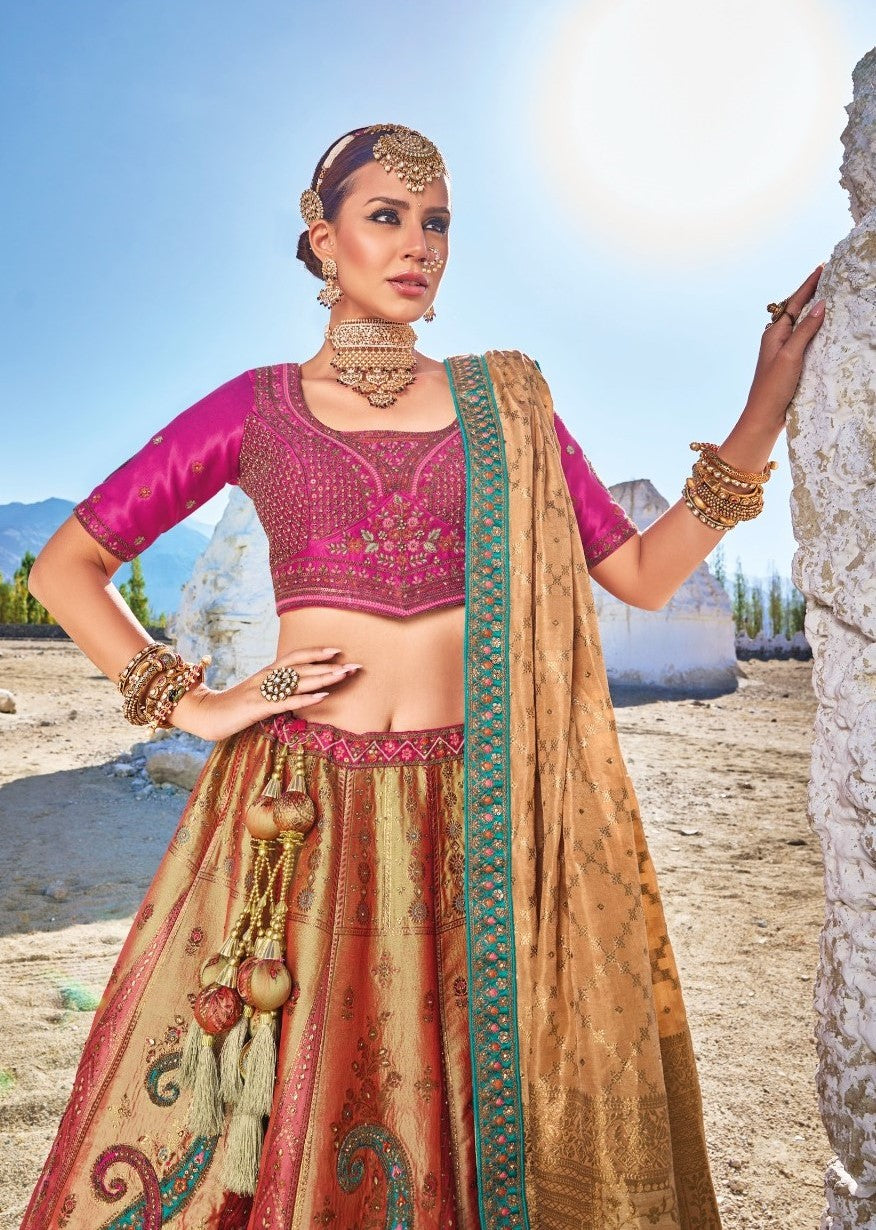 Pink and Light Orange Sequins Embroidered Banaras Silk Bridal Lehenga