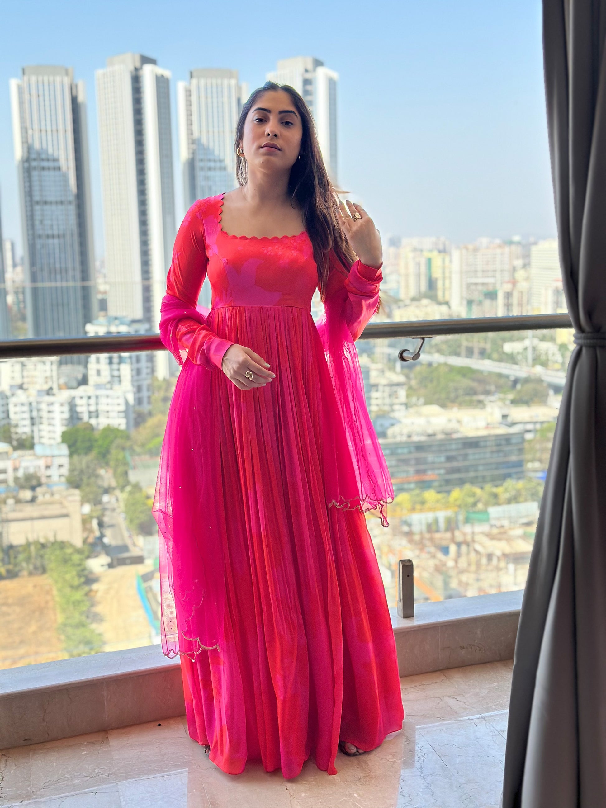 Pink/red self scallop anarkali with matching net scallop embroidered and sequin chinta on dupatta.