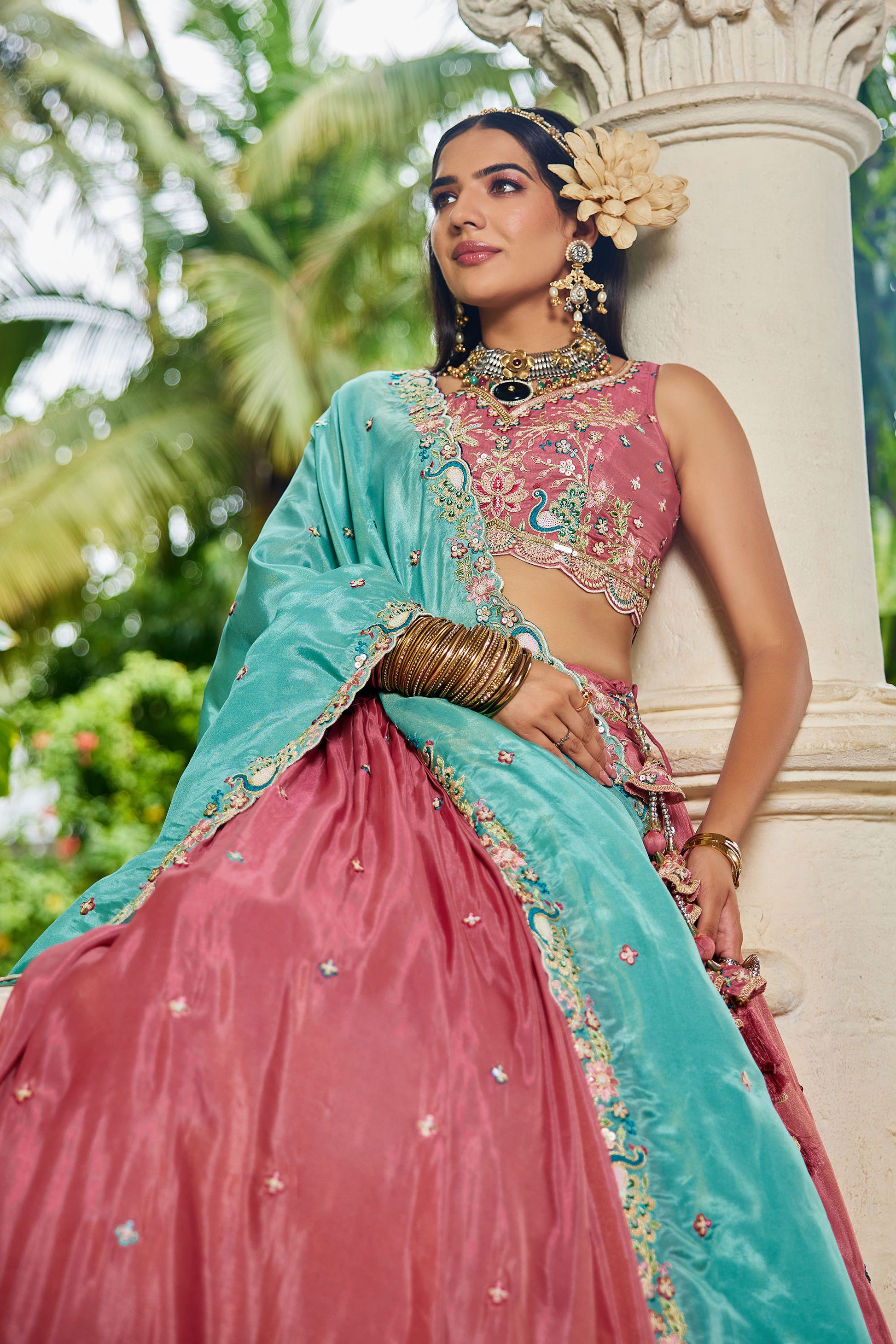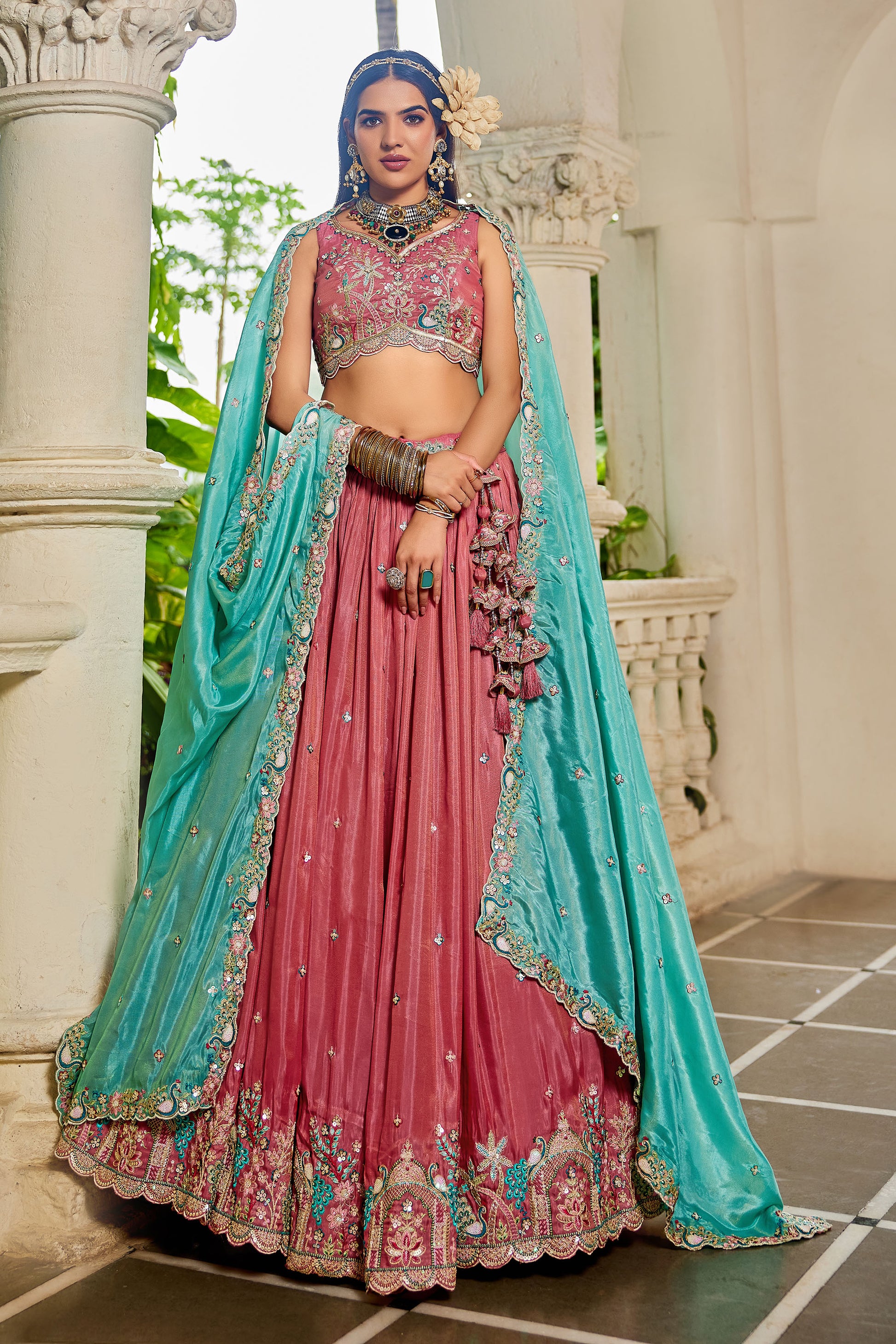 • Lehenga:- Made of premium quality Pink Colour Golden Satin fabric Full Flaire Lehenga With Sequins and Coding work has a thread Embroidery work. Has a thread cutwork border on the hemline.