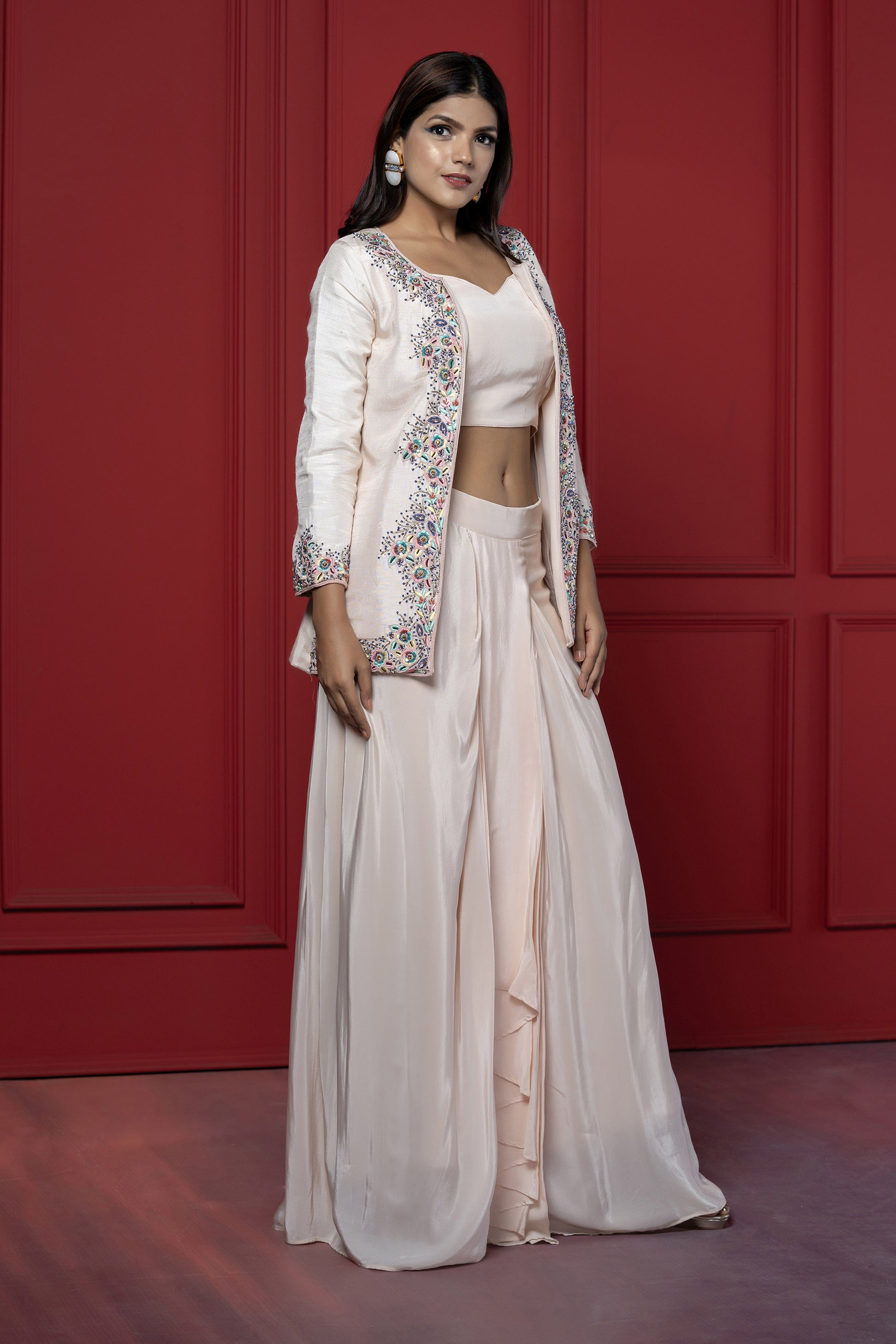 Embroidered front panel Blazer with plain spaghetti & Dhoti style skirt
