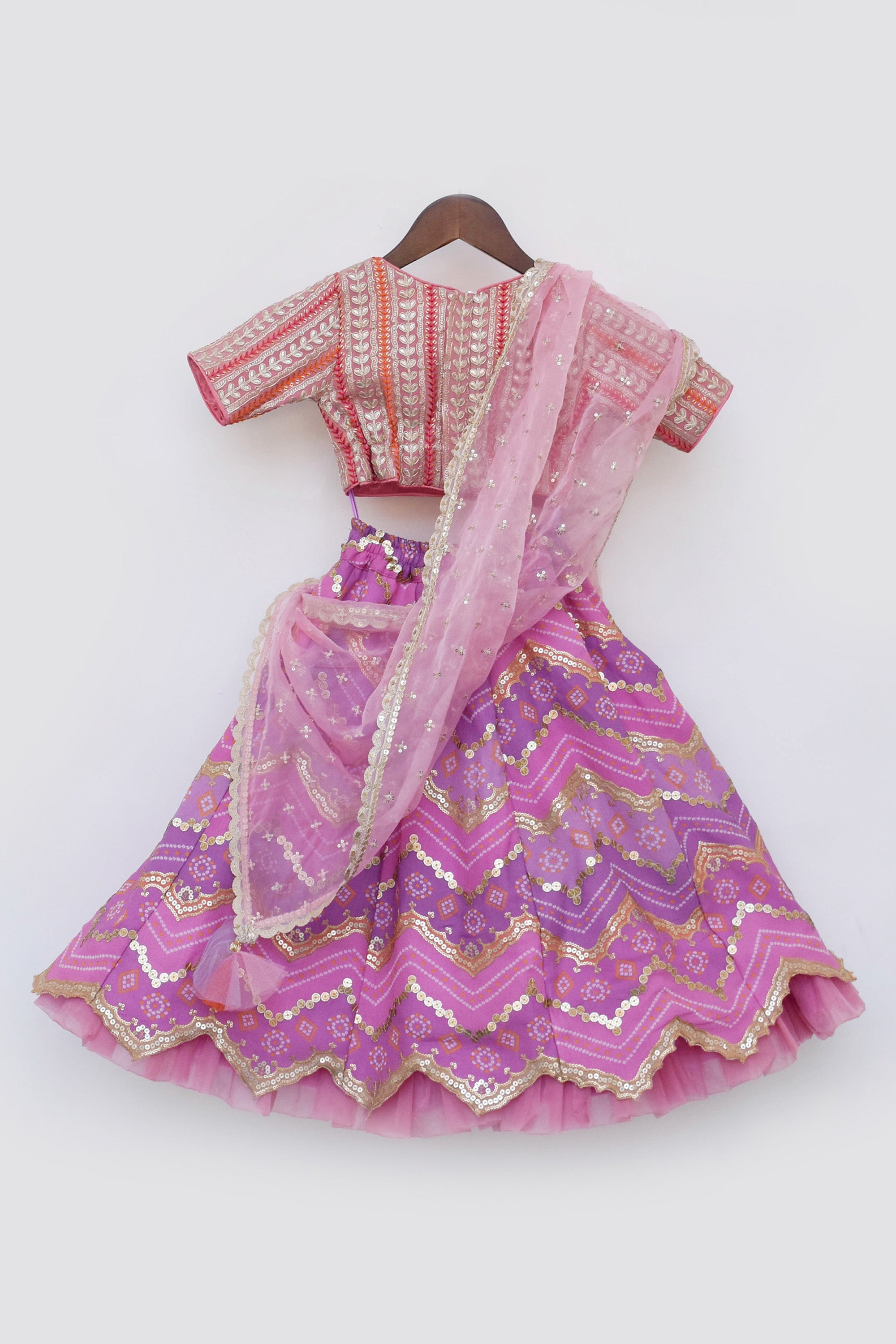 Adorn your little one in elegance with our Pink Embroidered Choli paired with a Purple Lehenga, featuring intricate Gotta Patti work on the choli, soft lining with a convenient back zip, a chevron Bandhej embroidered lehenga with tassels attached on the waist, and a soft lining for added comfort. Complete the look with the embroidered organza dupatta, adding a touch of grace and sophistication. This ensemble is perfect for weddings, festive celebrations, and any special occasion where your child deserves to shine in a blend of traditional charm and contemporary style.