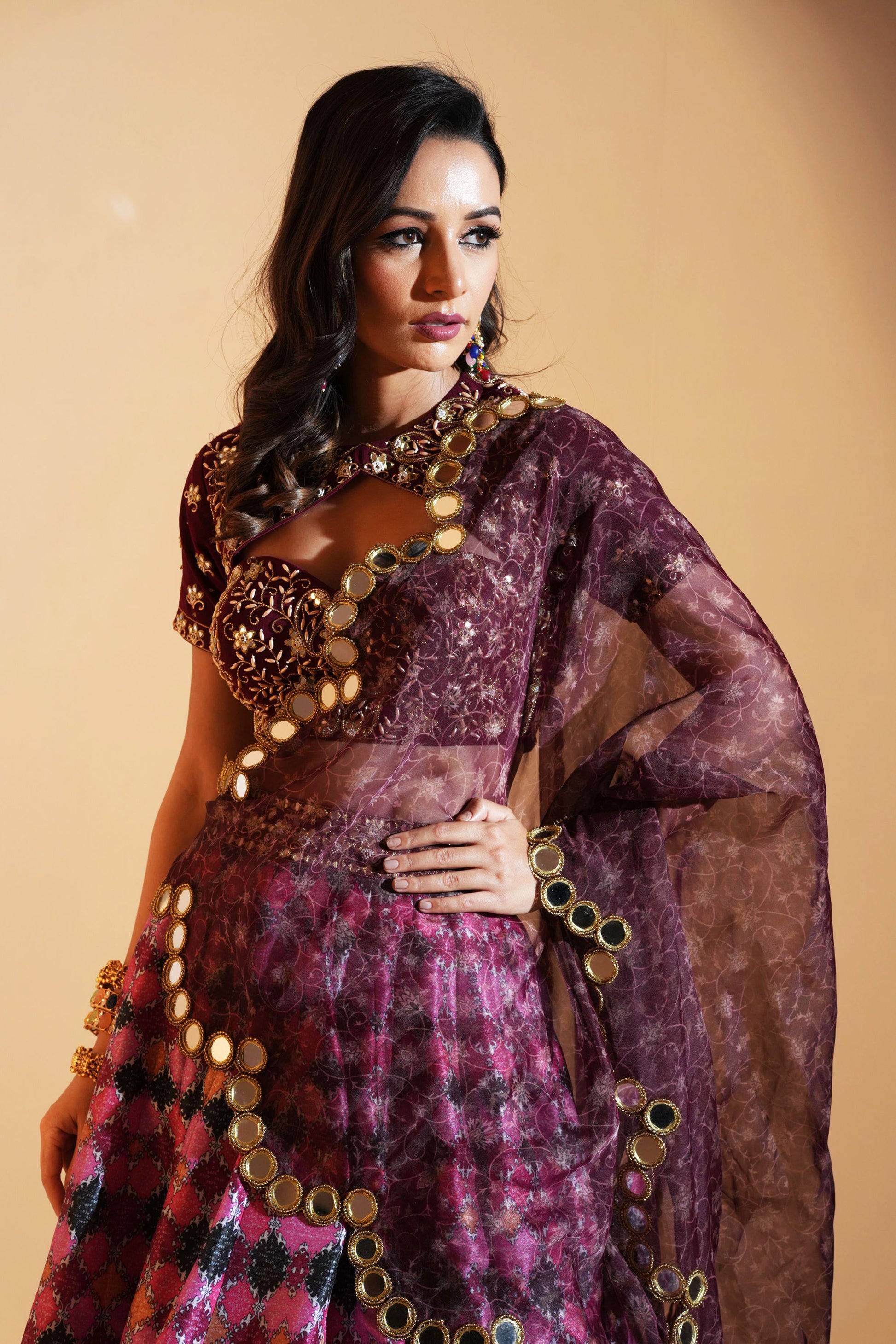 Multi Colored printed silk lehenga paired with maroon hand embroidered blouse and scalloped organza dupatta