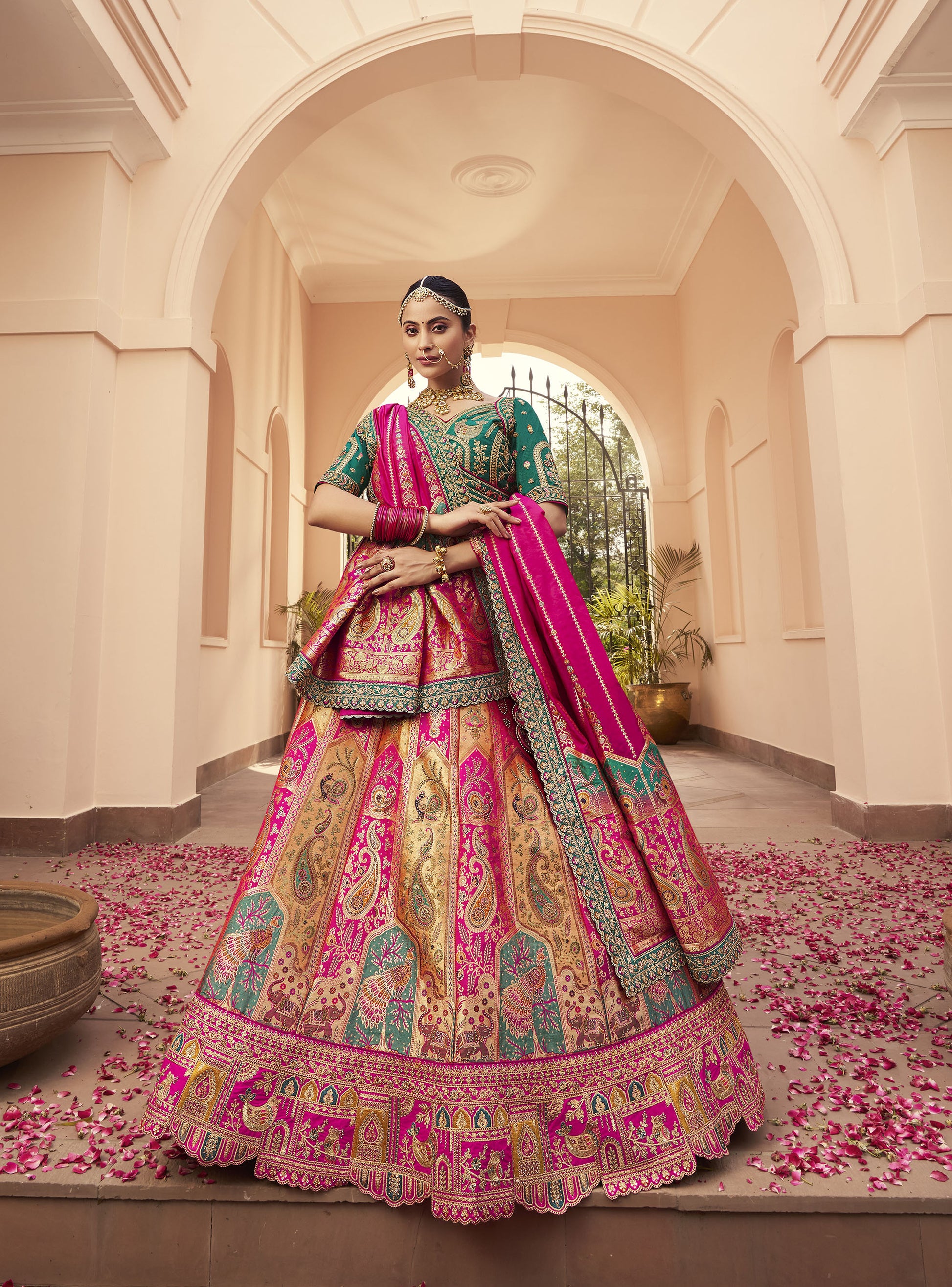Pink & Green Zari Embroidered Banarasi Silk Bridal Lehenga