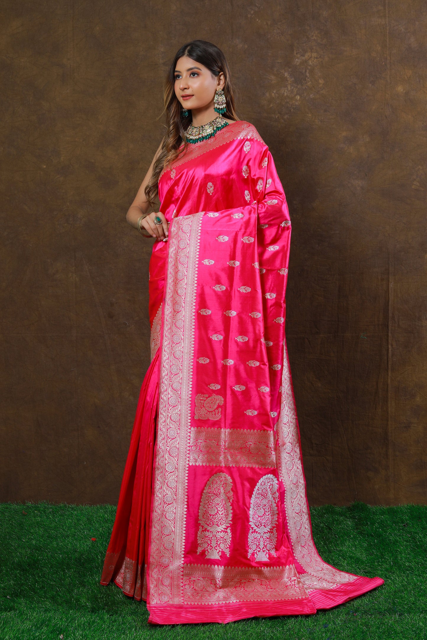 Product Description: The Pink Handwoven Kadwa Katan Silk Saree is a testament to the rich traditions of Banaras and the artistry of handloom Banarasi weaving. This saree features intricate booti designs in lustrous gold zari, beautifully complemented by the traditional konia pattern. It's a celebration of timeless elegance and sustainable fashion.