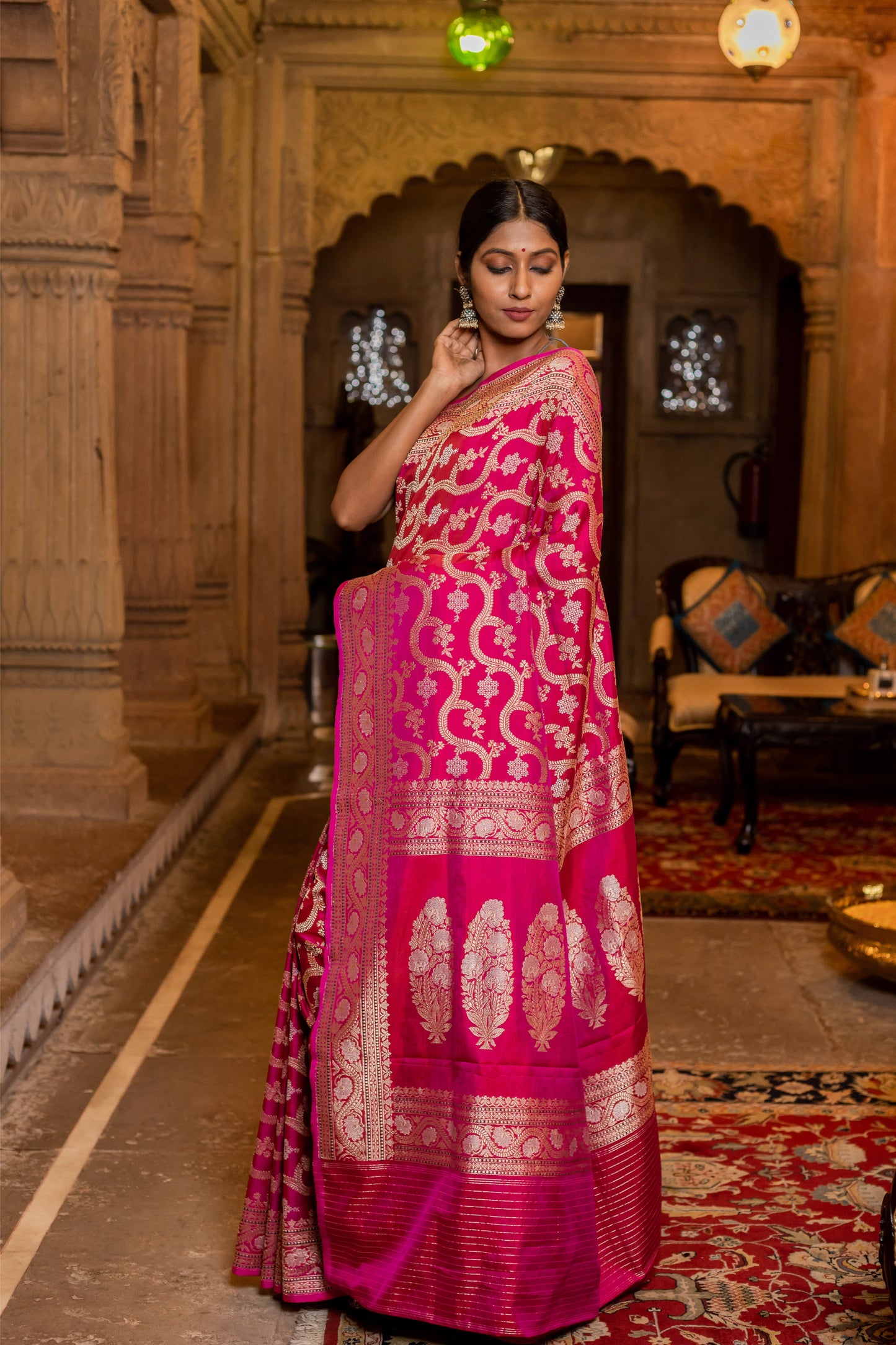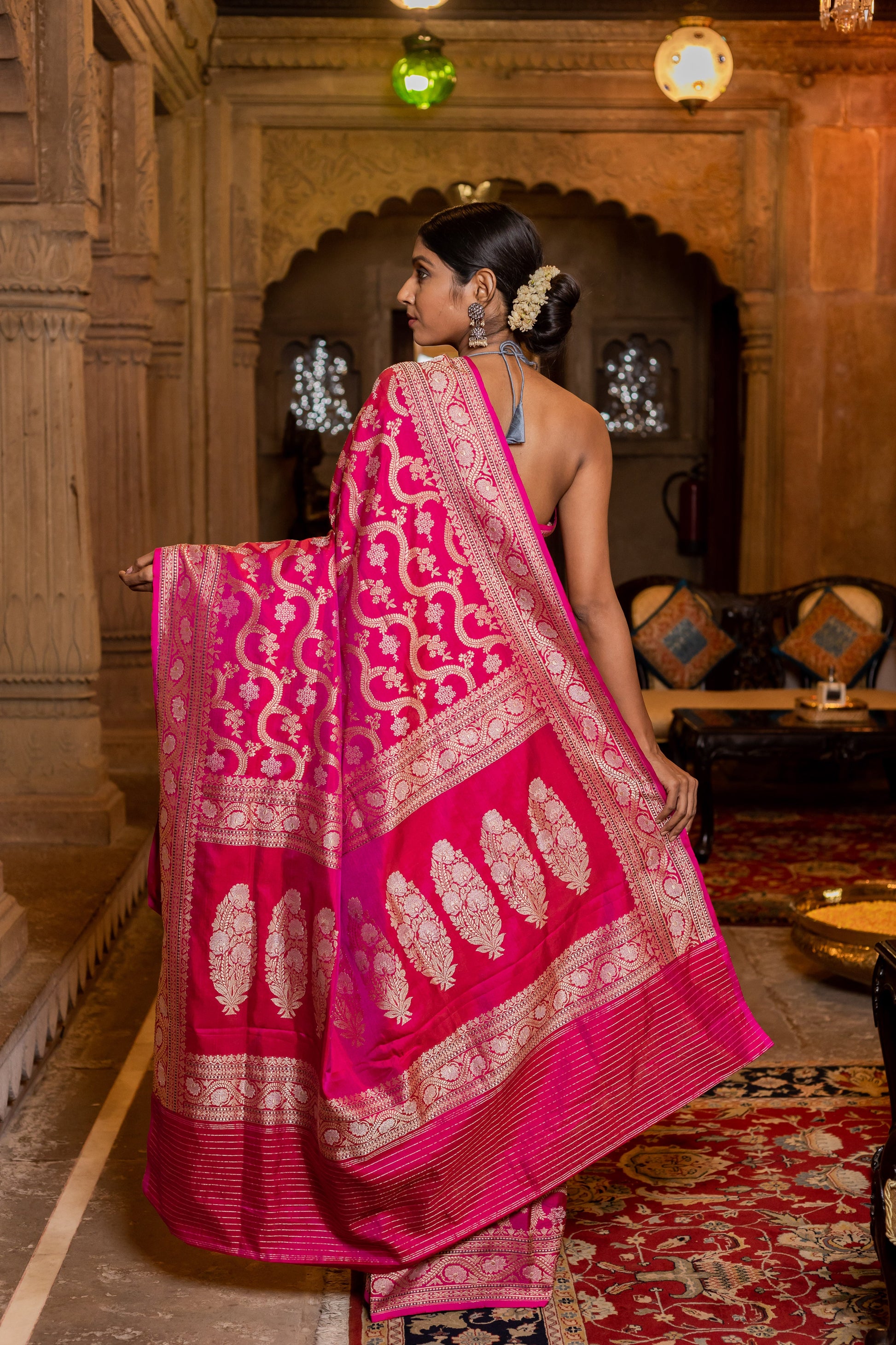 Product Description: The Pink Handwoven Kadwa Katan Silk Saree features an intricate Gojjar Design in sona roopa zari, elegantly contrasted with muthra. This exquisite saree is a testament to the timeless traditions of Banaras, showcasing the artistry of handloom Banarasi weaving and is a symbol of elegant and sustainable fashion.