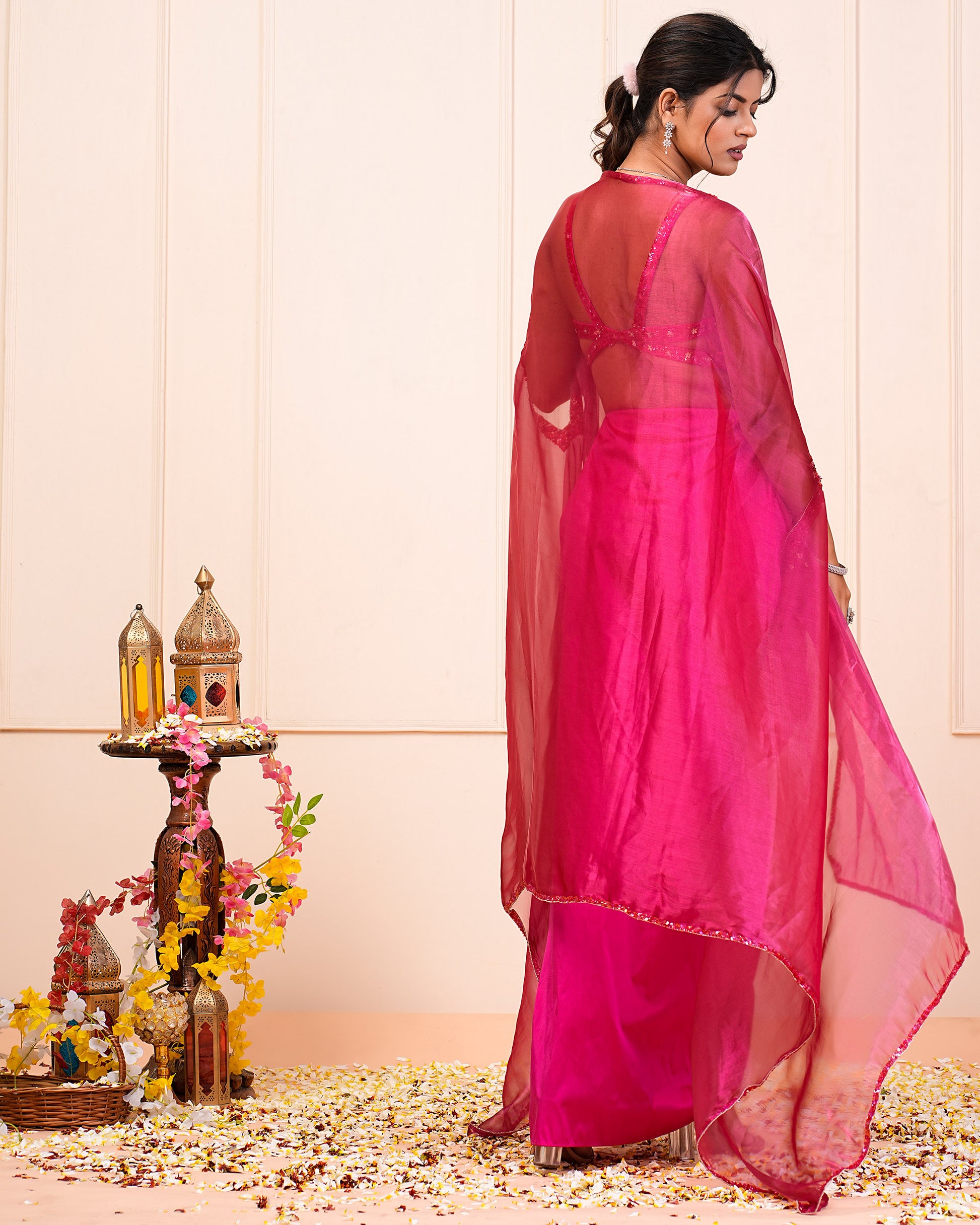 Pink Heavy Embroidered Choli With Drape Skirt And Cape Set