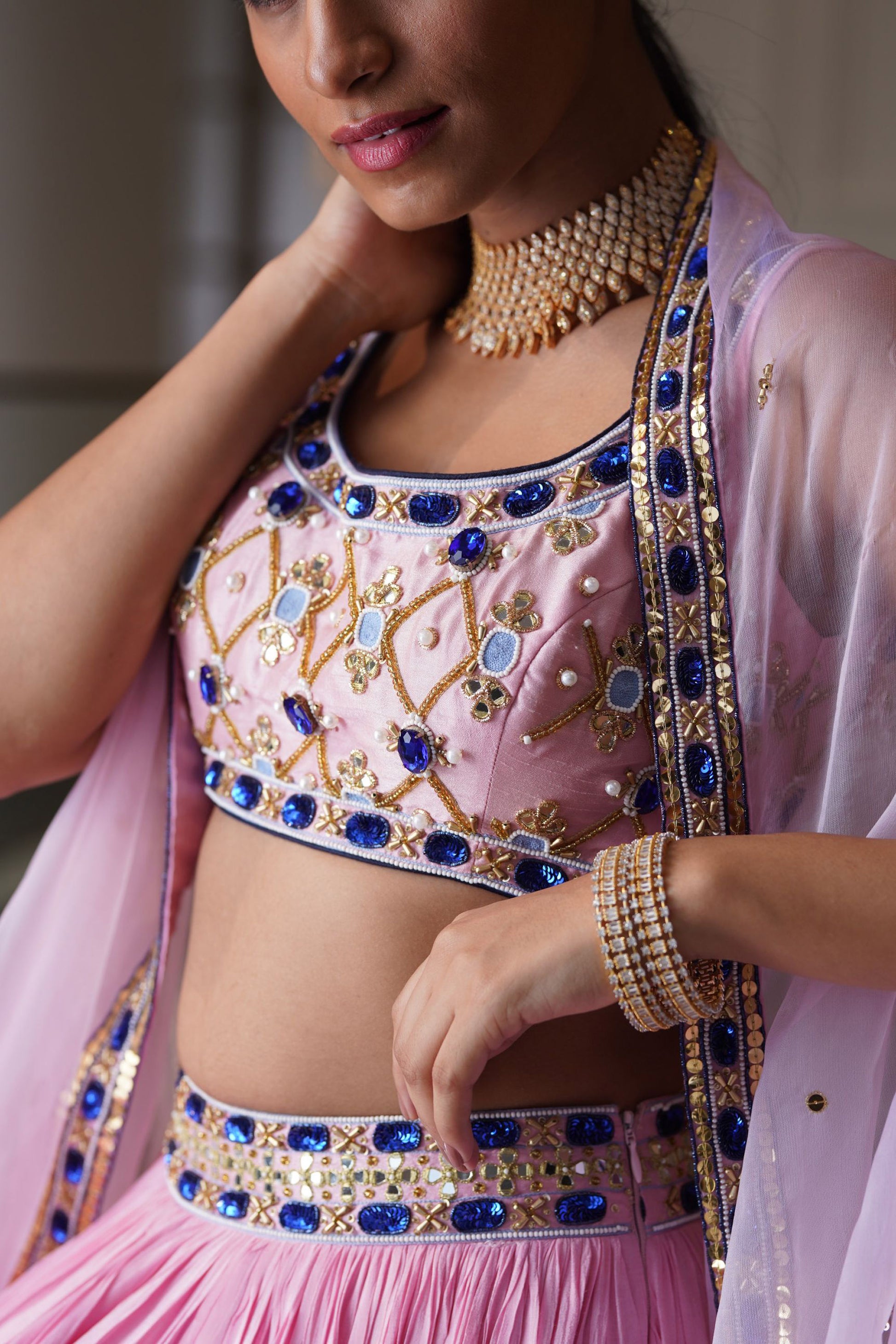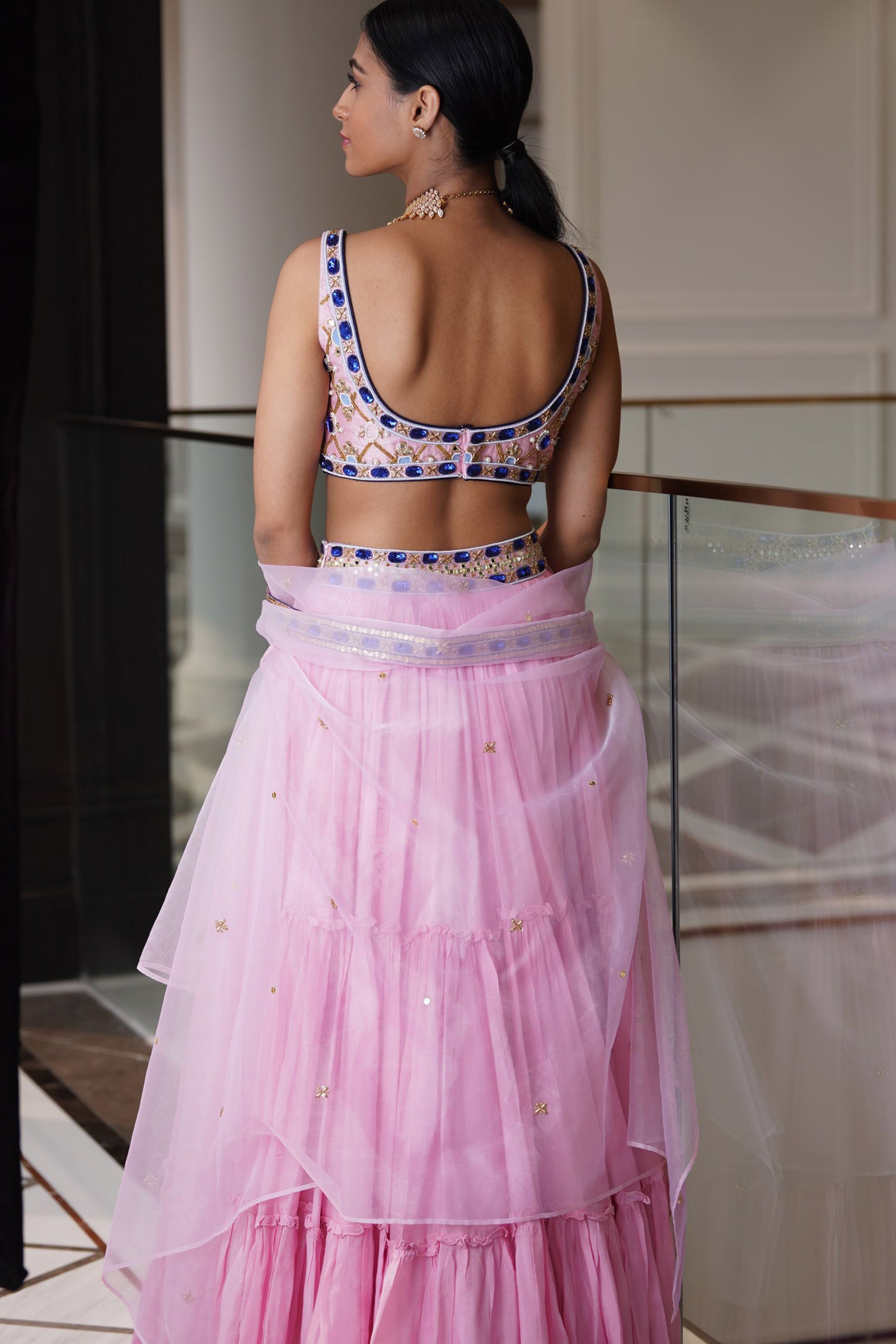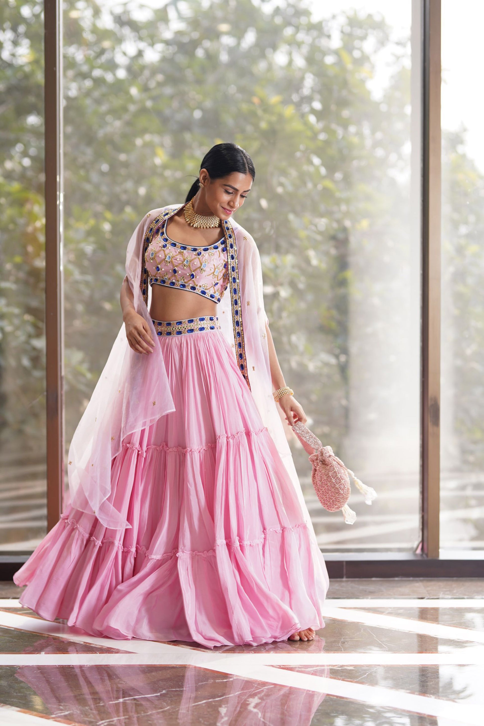 Blush Pink Croma Silk Embroidered blouse paired with tiered chiffon pleated lehenga with silk organza cape dupatta