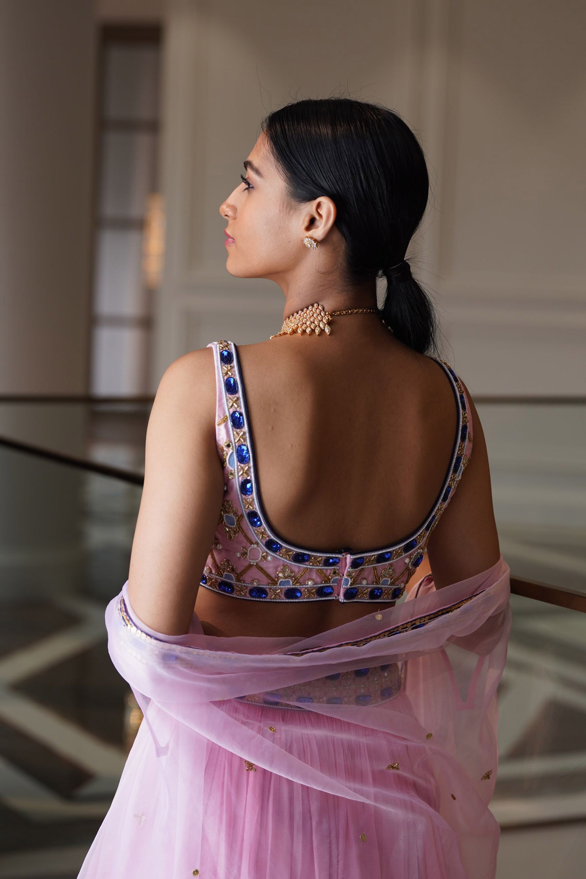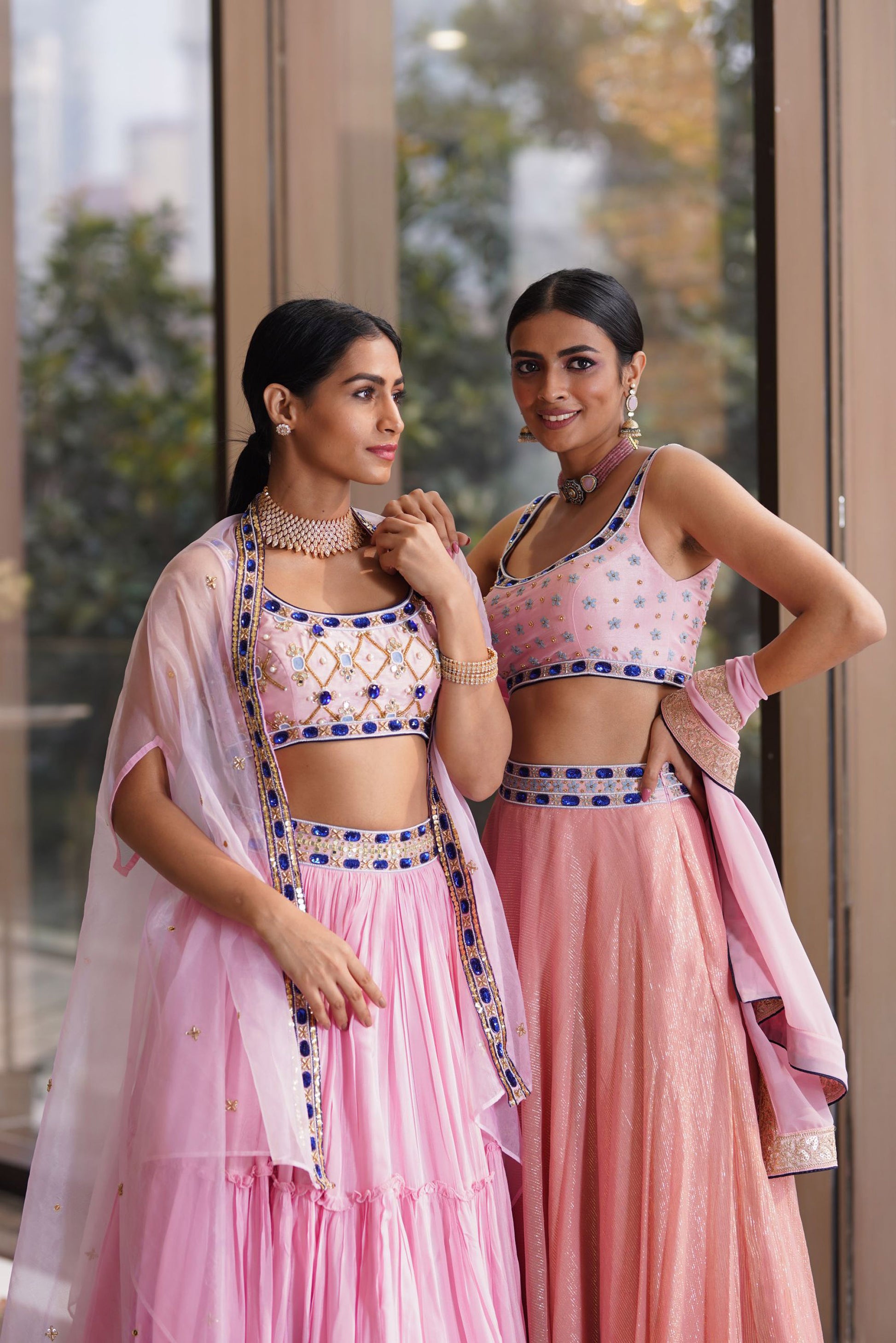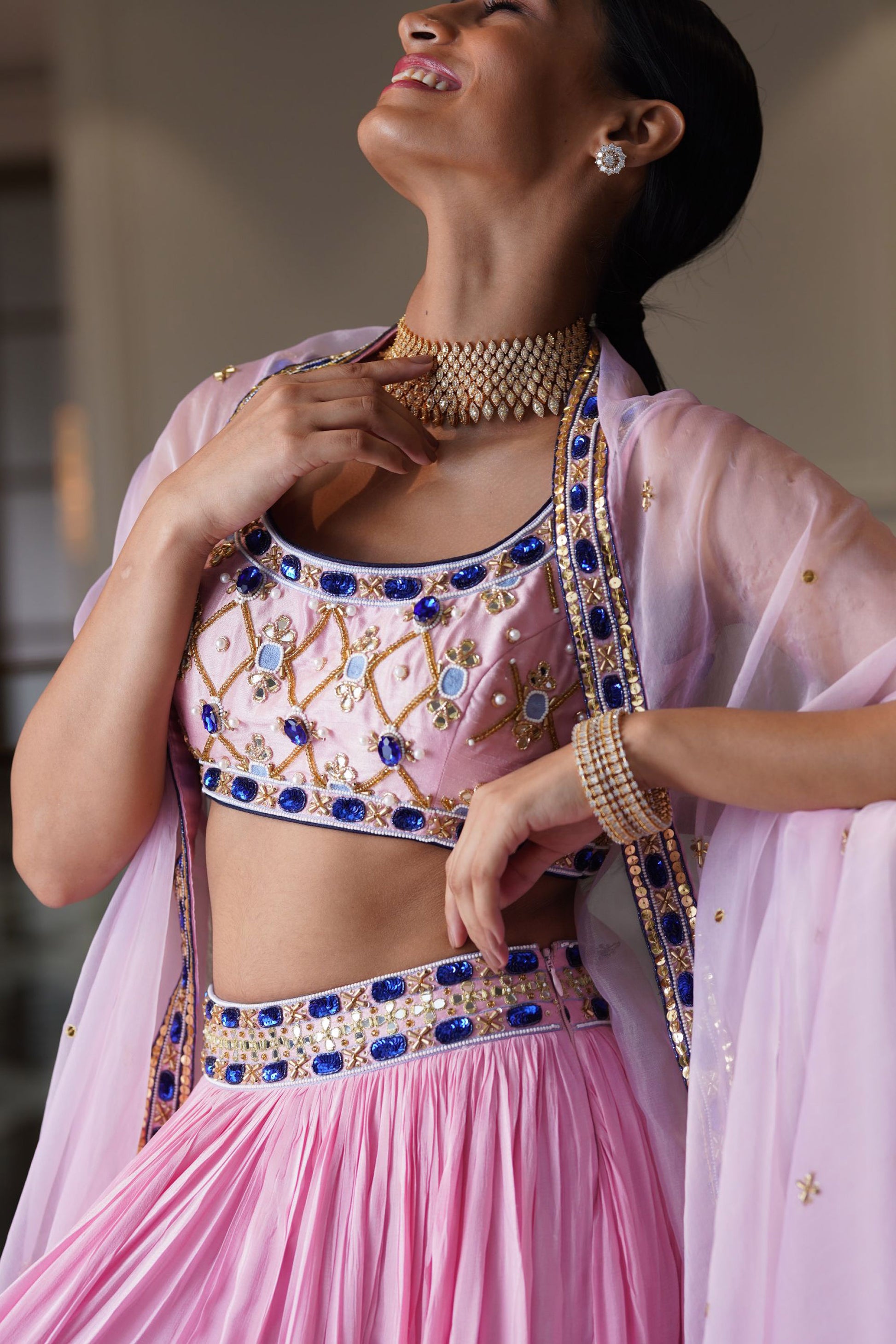 Blush Pink Croma Silk Embroidered blouse paired with tiered chiffon pleated lehenga with silk organza cape dupatta