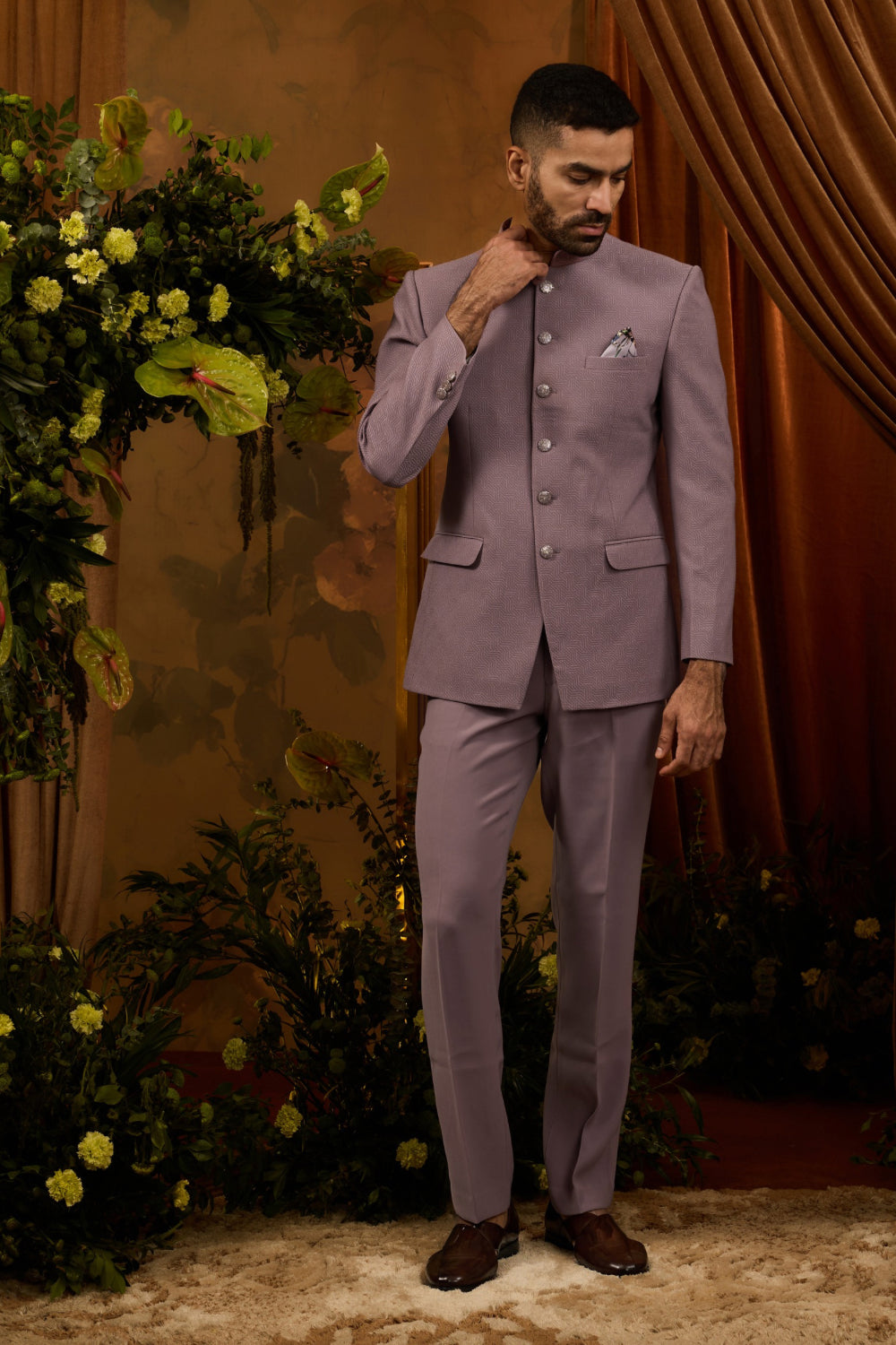 This elegant pink silk Jodhpuri suit is adorned with intricate white thread work, combining traditional regal charm with modern sophistication. Perfect for weddings and festive occasions, it offers a refined and stylish look for the discerning gentleman.