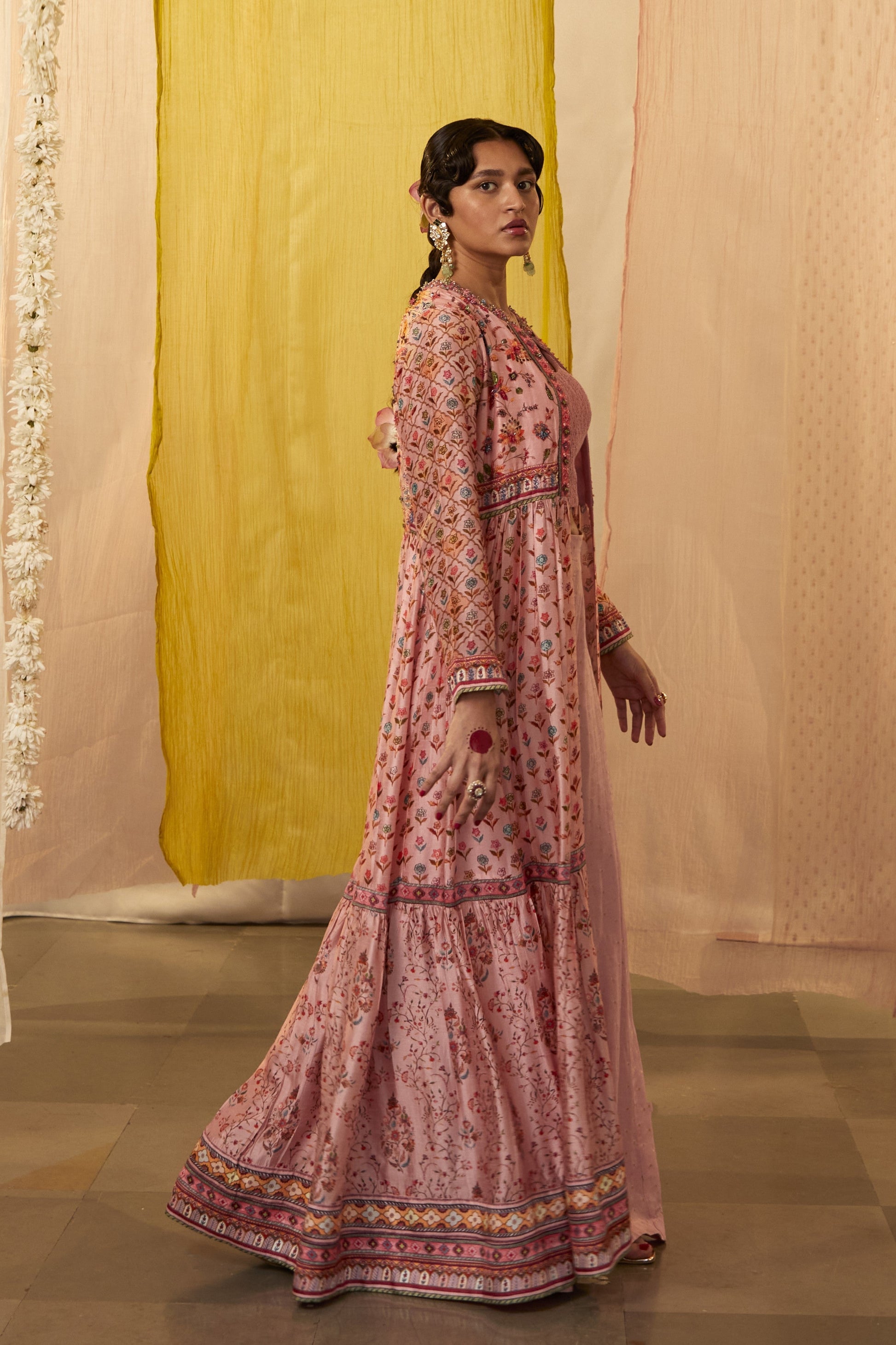 Blush pink long jacket with all over contrast varied floral print, tiered panels, contrast beads, cut dana, thread & sequin embroidered highlights. Paired with gold polka dot pattern palazzo & thread work blouse