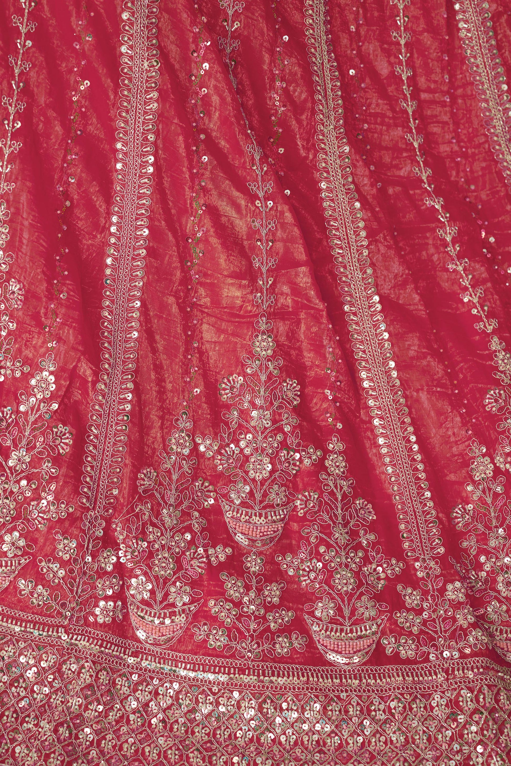 This traditional Pink lehenga is made with rich Jimmy Choo fabric and features intricate paisley Motifs with embroidered silk patches all over the skirt  and hand work detailing, The ensemble is completed by a matching  net dupatta with a Zari work at border.