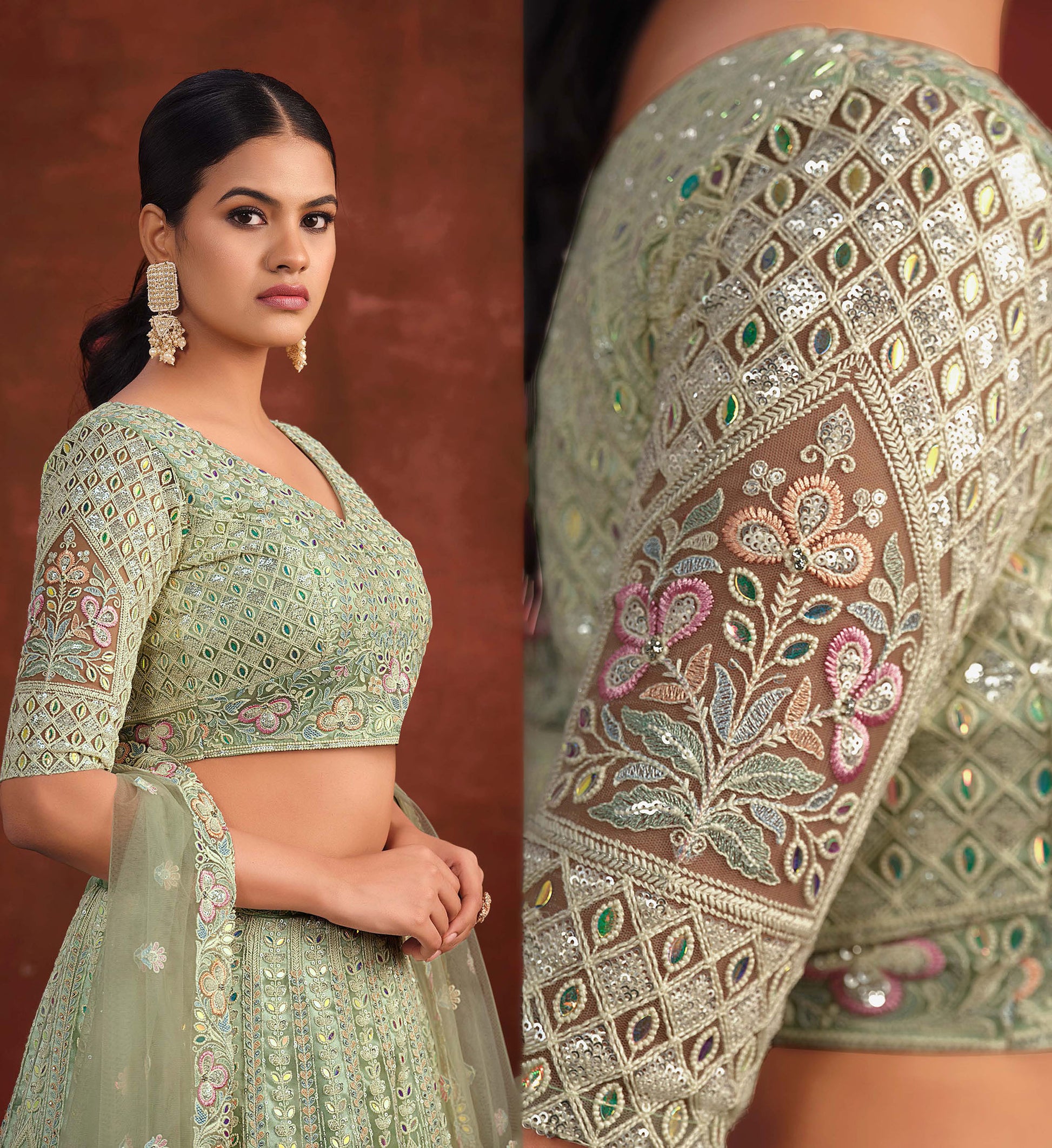 Pista Green Heavy Hand Work & Cutwork Net Mehendi Lehenga