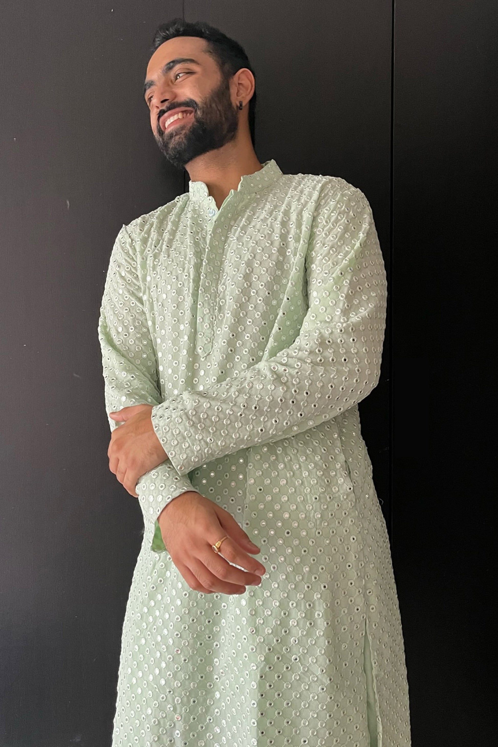 Featuring  a pista green colored kurta with sparkling mirror work.Mirror work always make you stand out from the rest and Shine.Pair it up with contrasting white coloured chudi pants or pyjama pants to Complete the look.