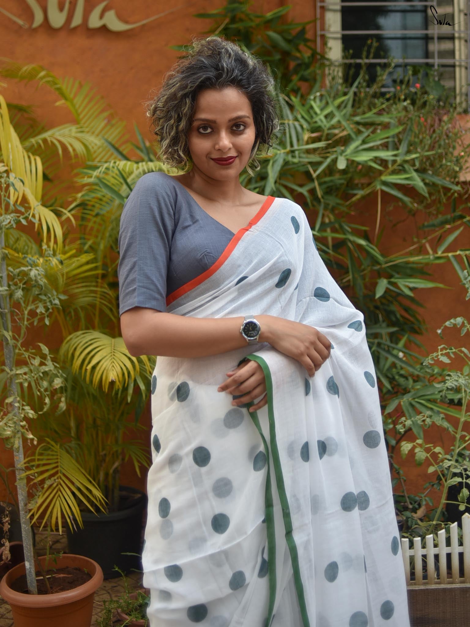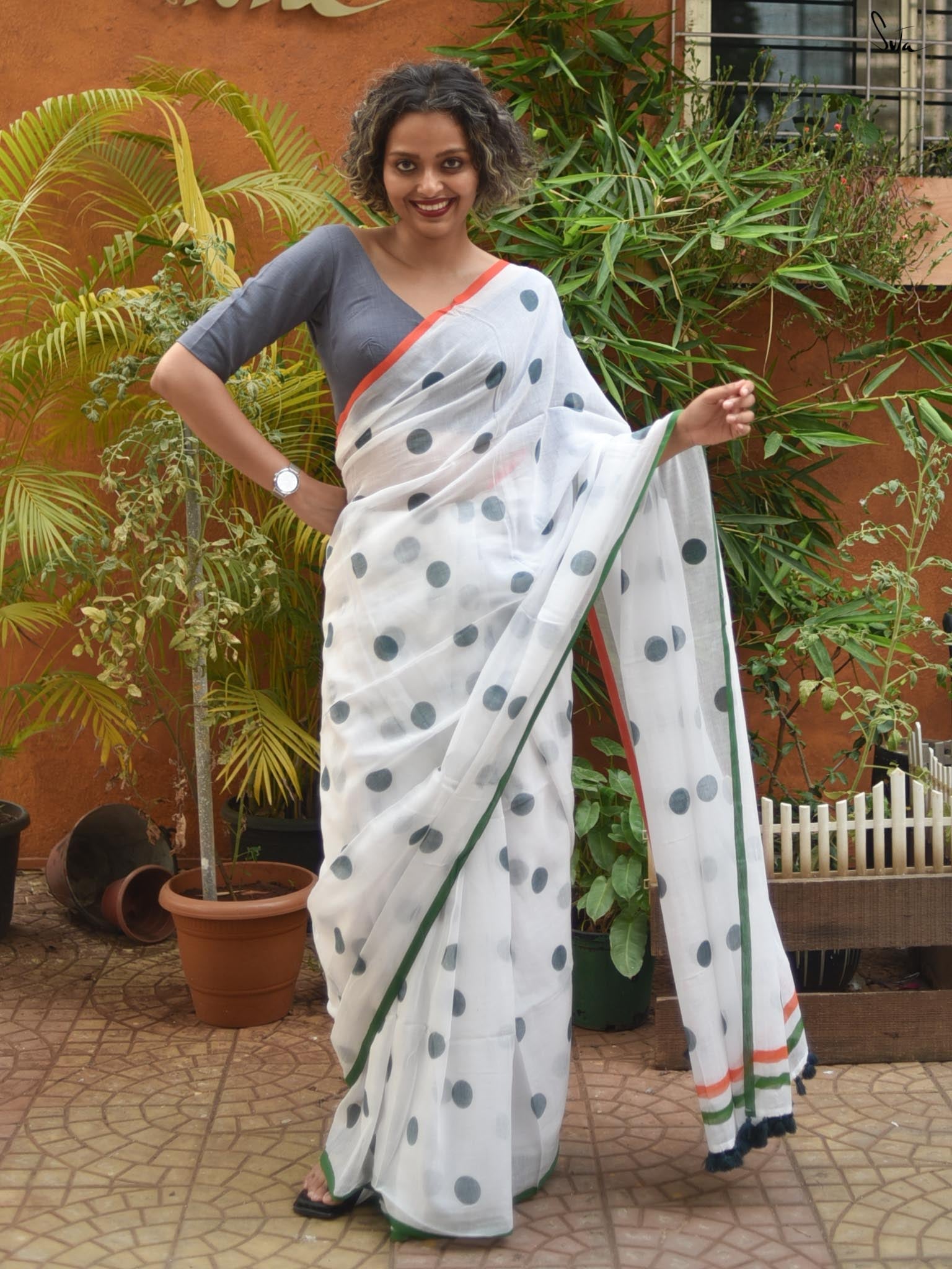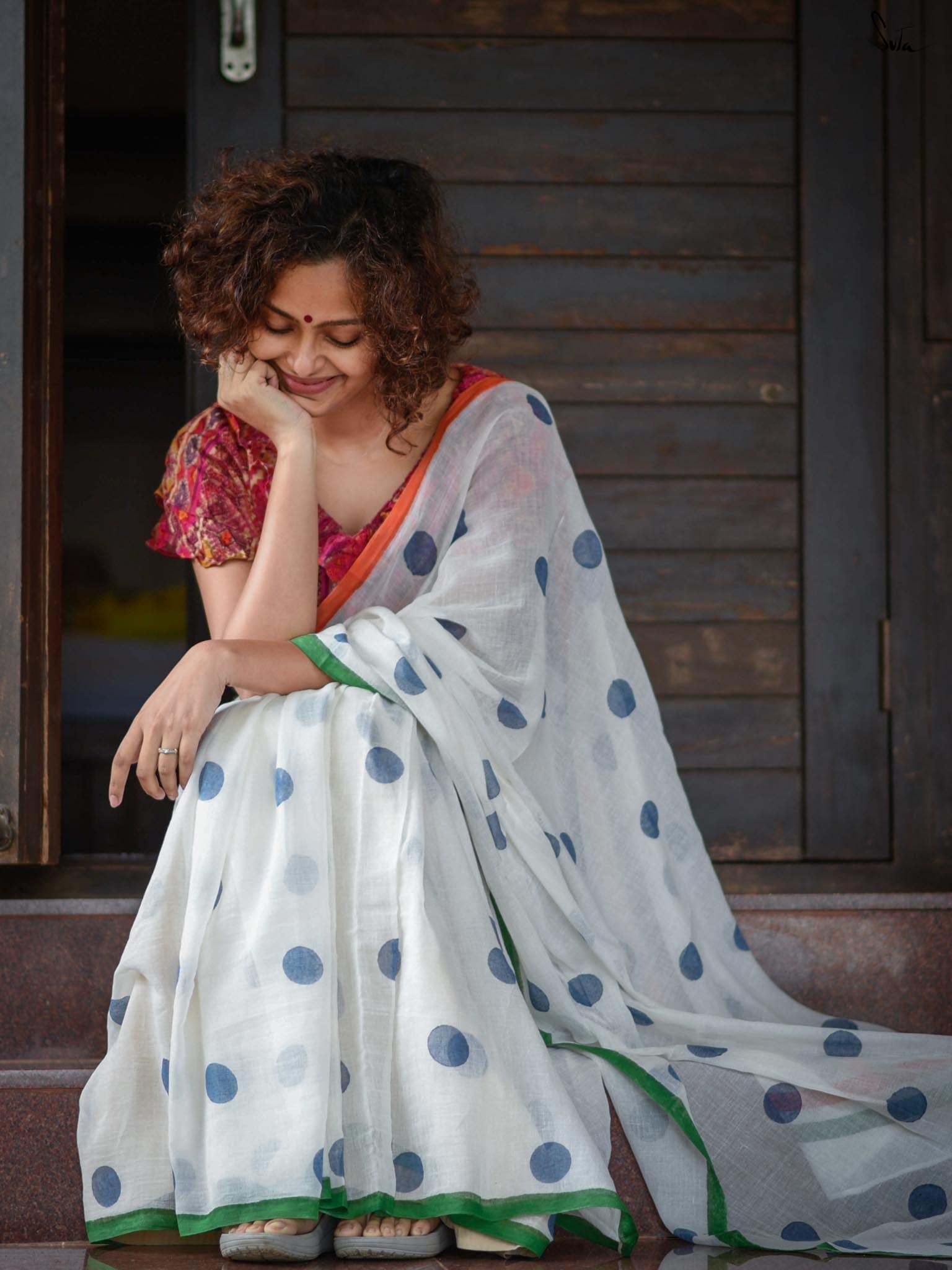 Drape this stylish polka dots saree that feels lighter than air. Comfort and fashion surely come together in this made-in-heaven mul saree.