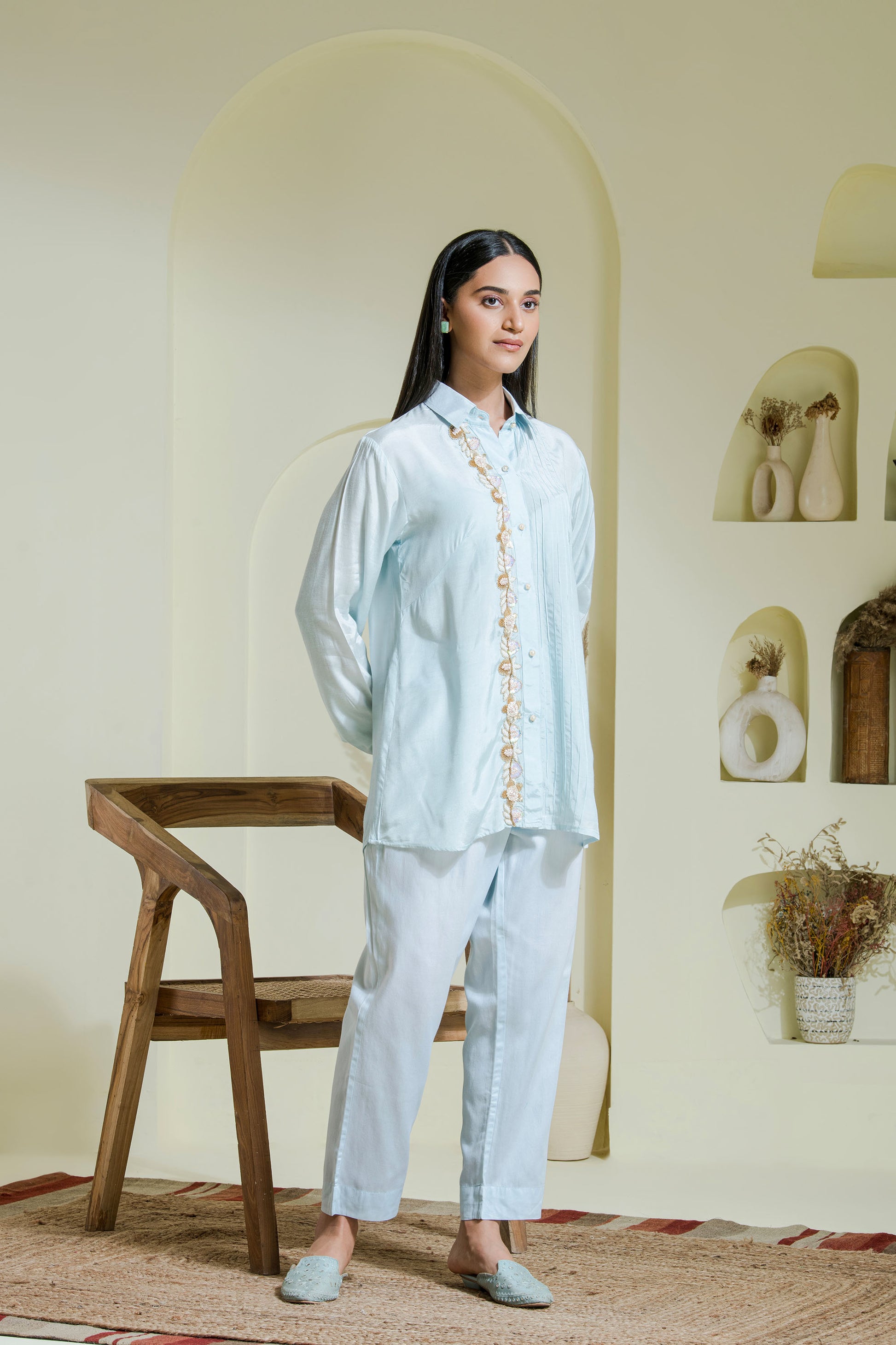 Delicate hand embroidered floral pattern with pintucks and pearl buttons on shirt paired with straight plain pants.A perfect outfit for your casual outings or a party.