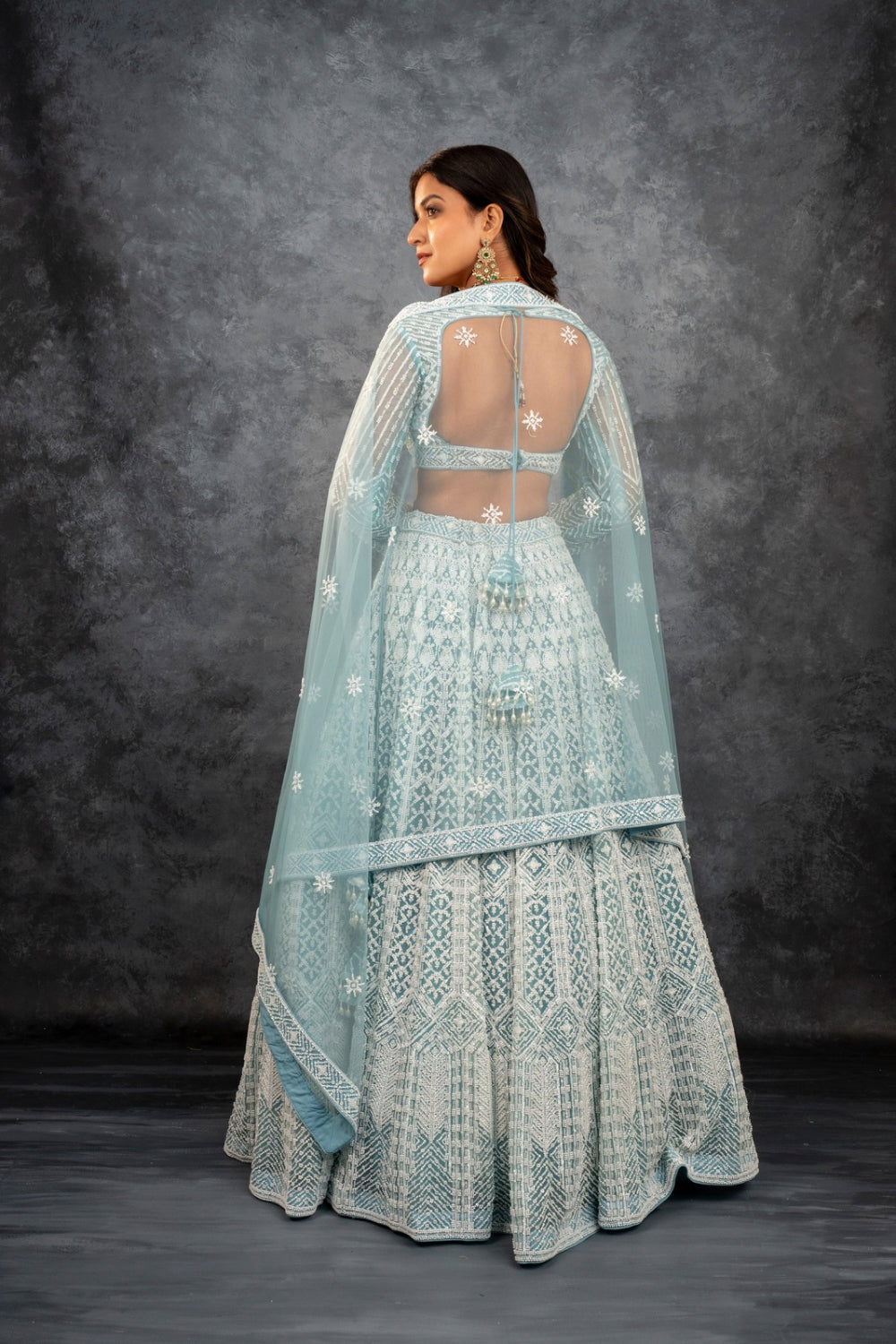 Powder blue net lehenga choli with sequins work, cut dana work and pearls