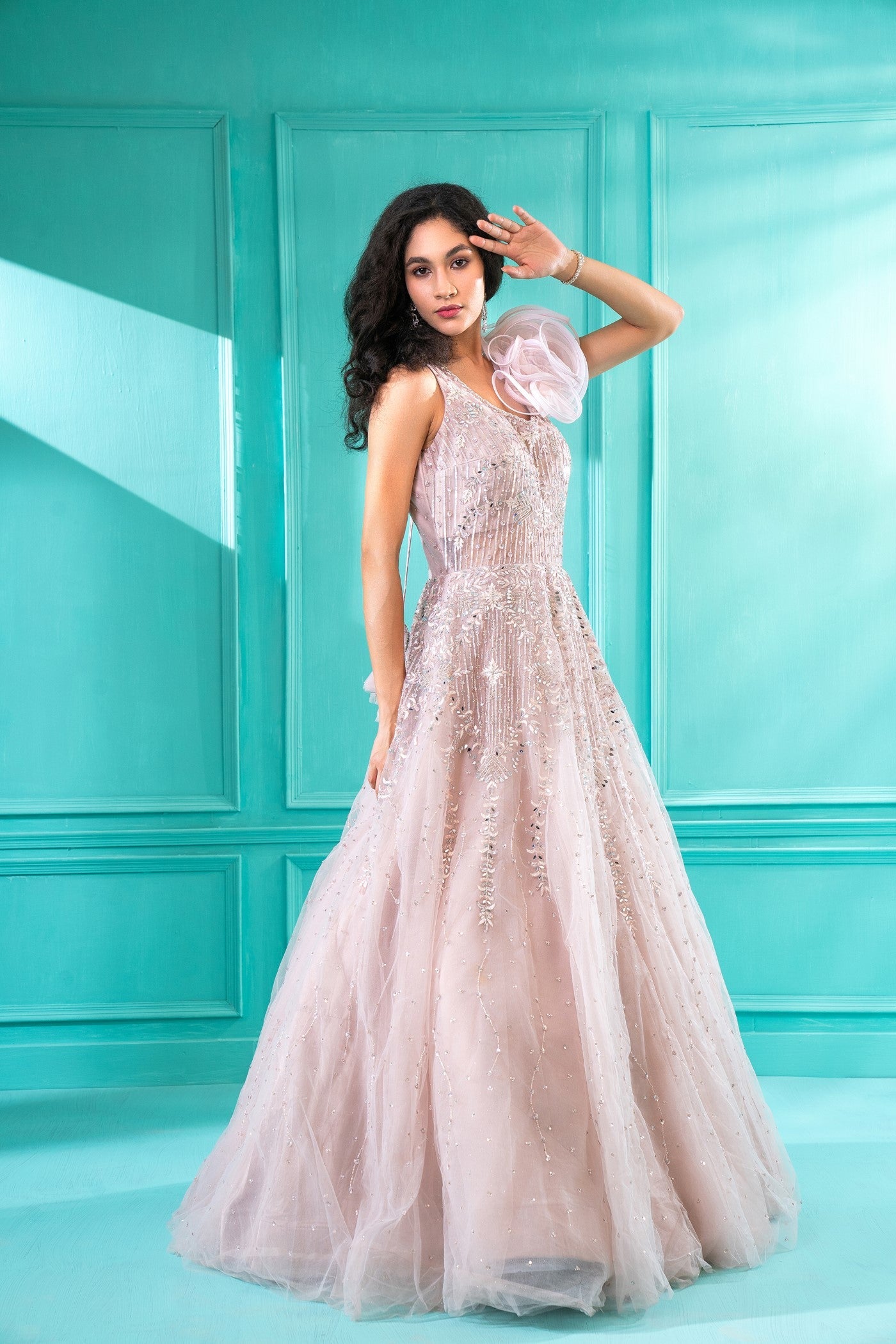 Powder Pink Fully Embroidered Tulle Flared Gown