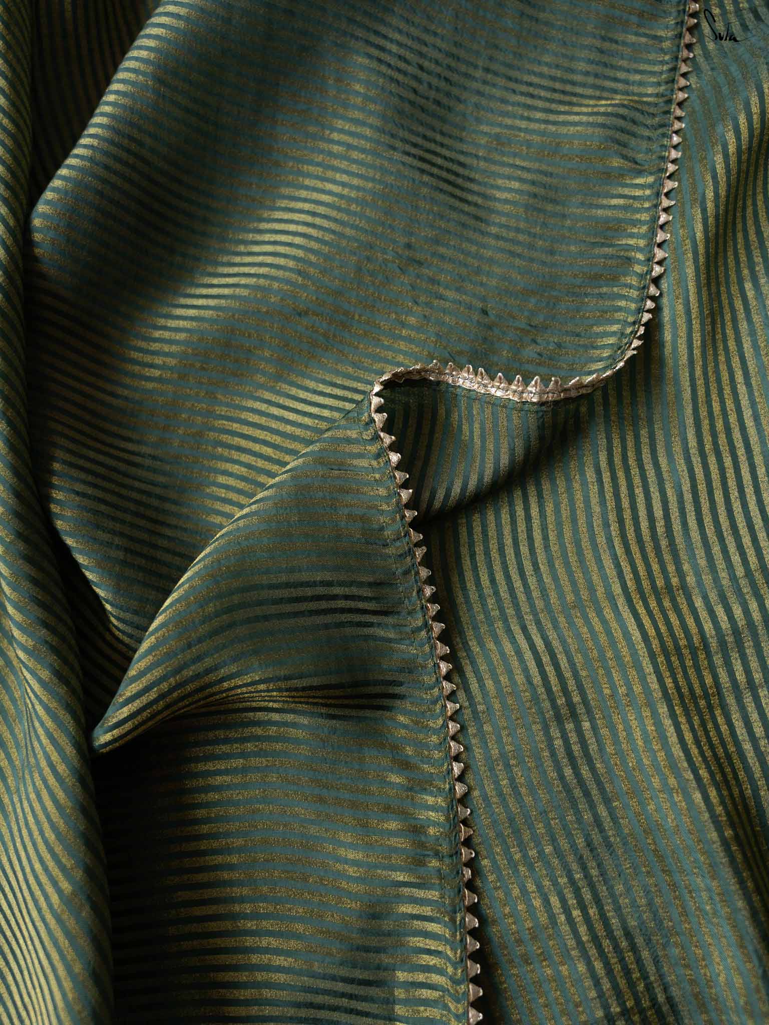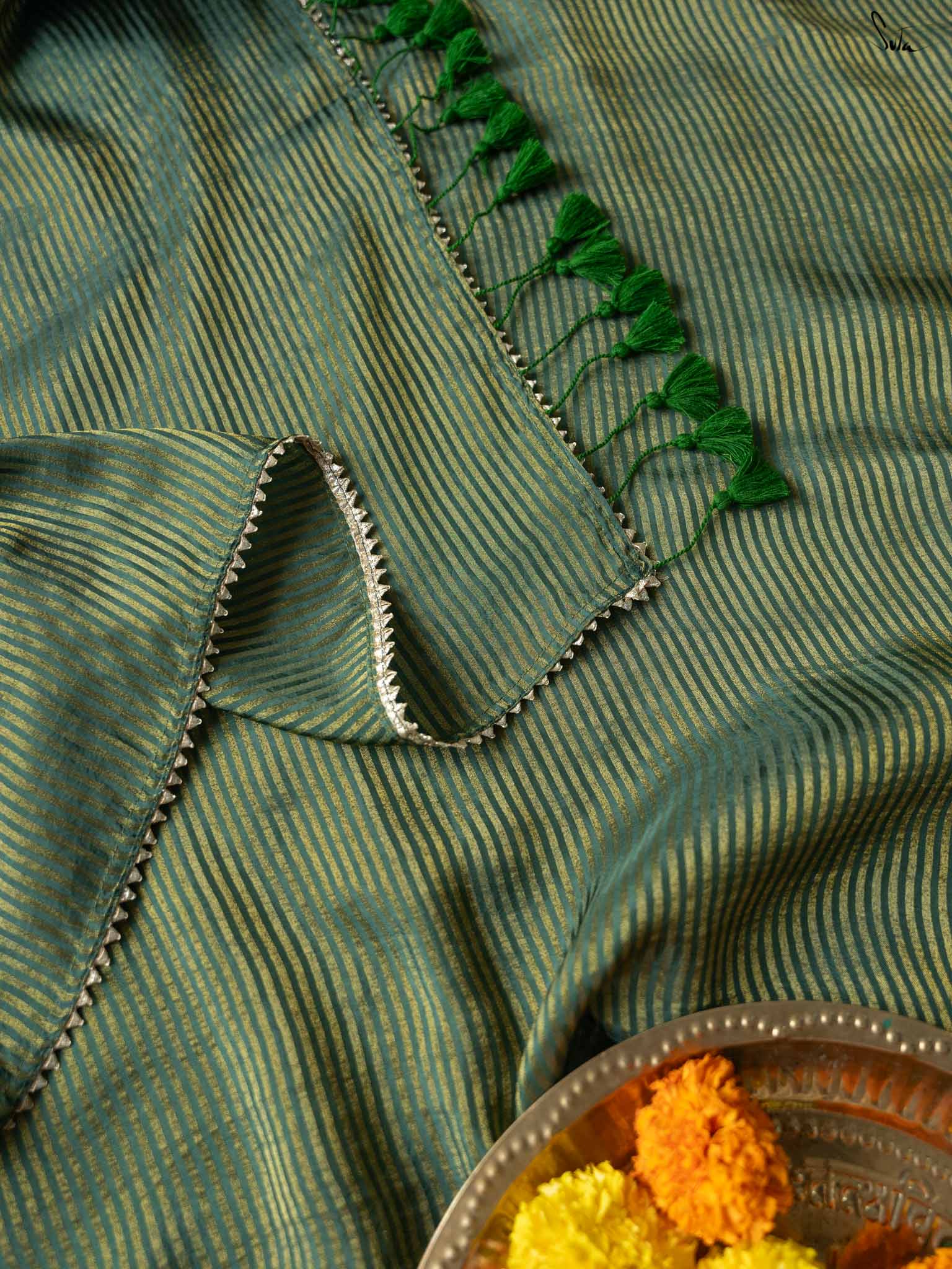 A lively green saree crafted from viscose, featuring zari stripes and a gota border with green tassels. It’s a graceful saree that radiates charm and confidence.