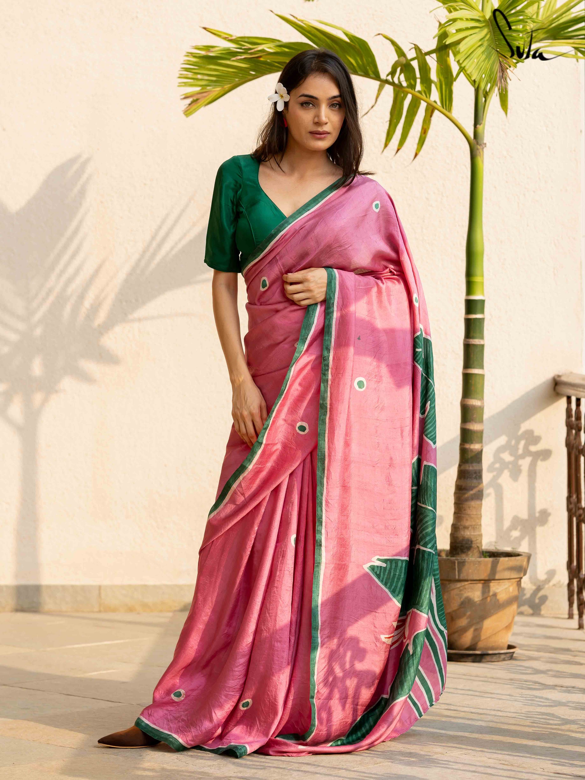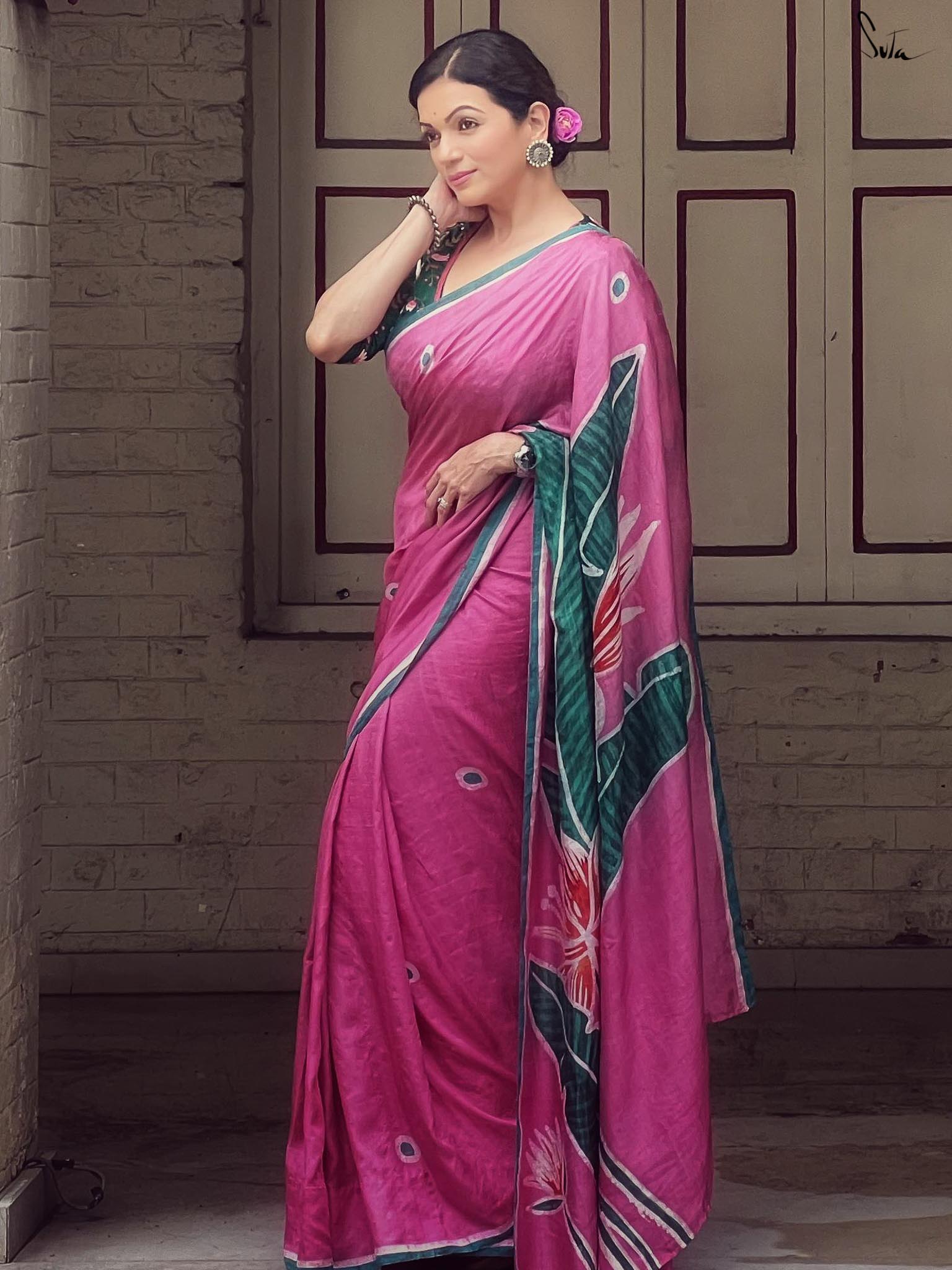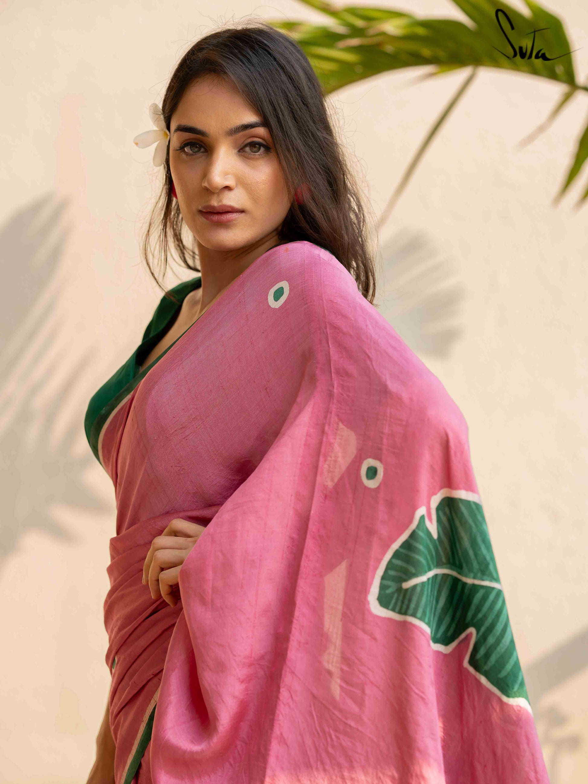 This is a stunning pink handcrafted batik saree in soft handloom mulberry silk.