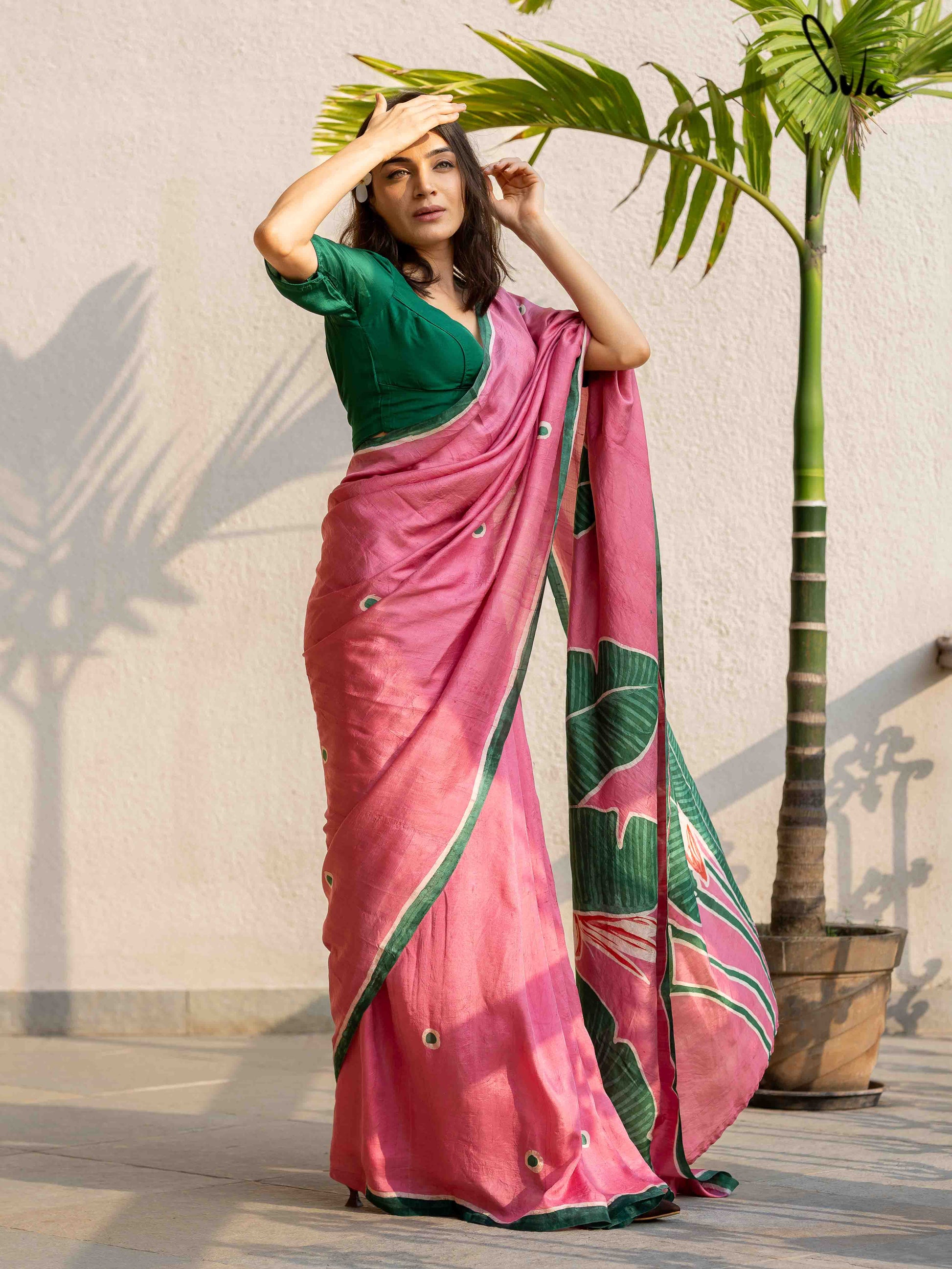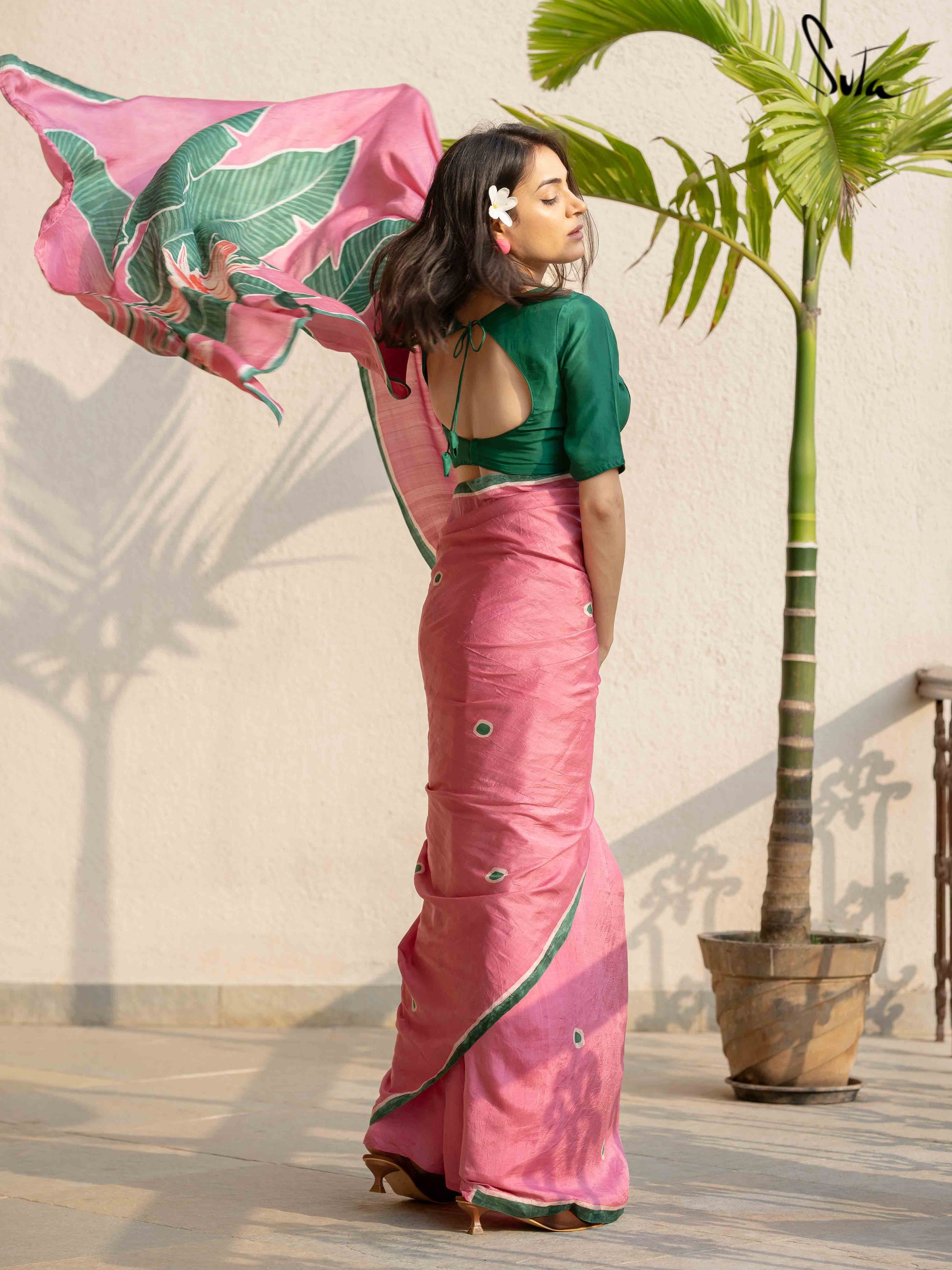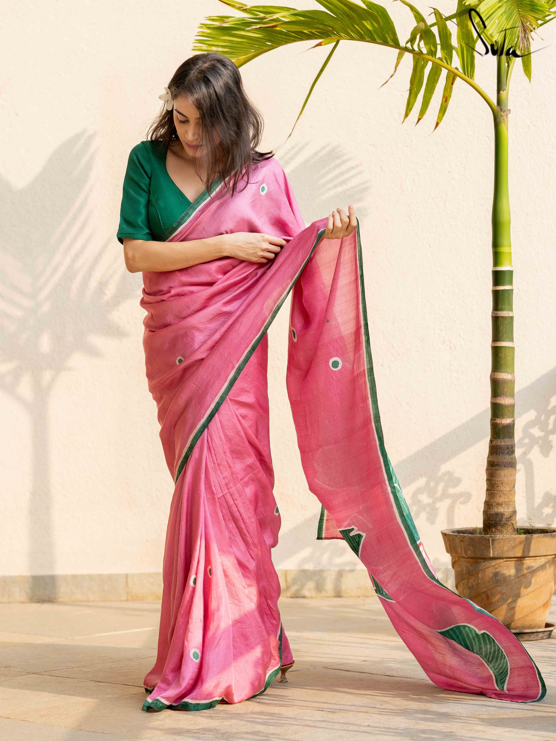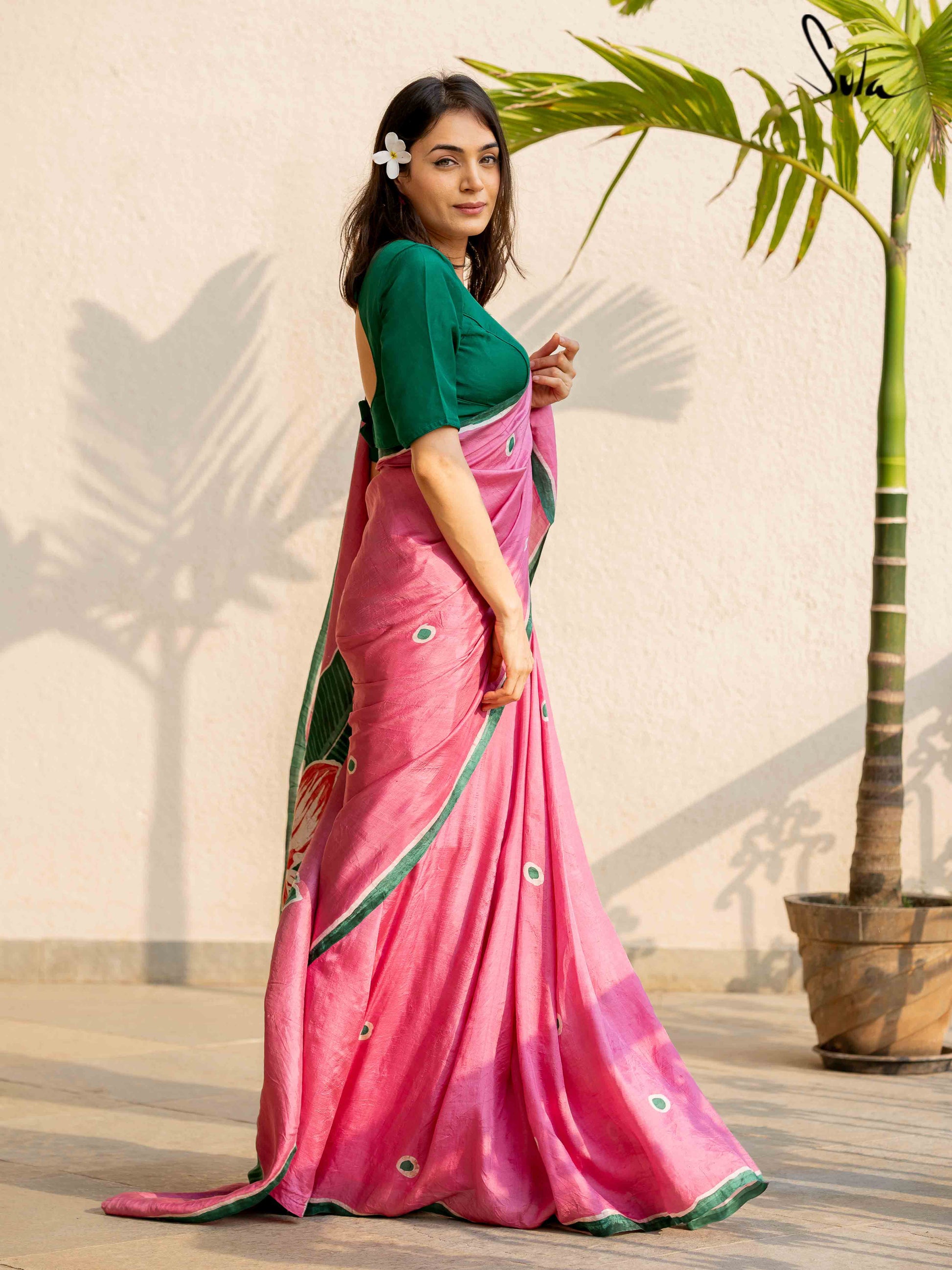 This is a stunning pink handcrafted batik saree in soft handloom mulberry silk.