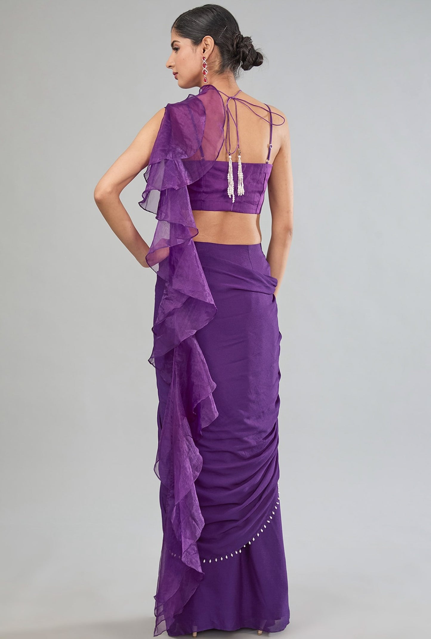 Chinnon Chiffon Pre draped saree with pearl hanging detail and double ruffle pallu. Paired with corset style blouse with halter neck flap attached to it