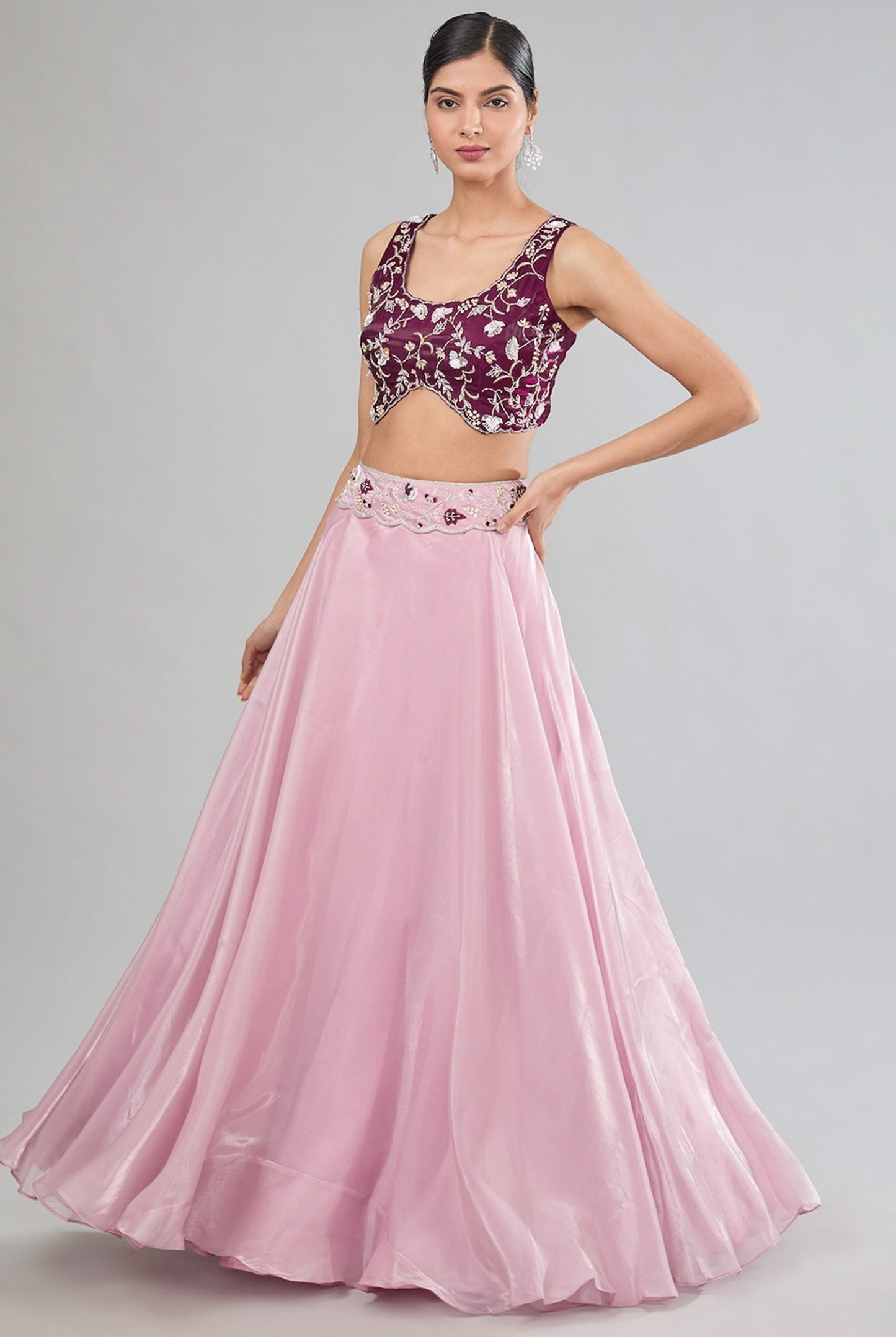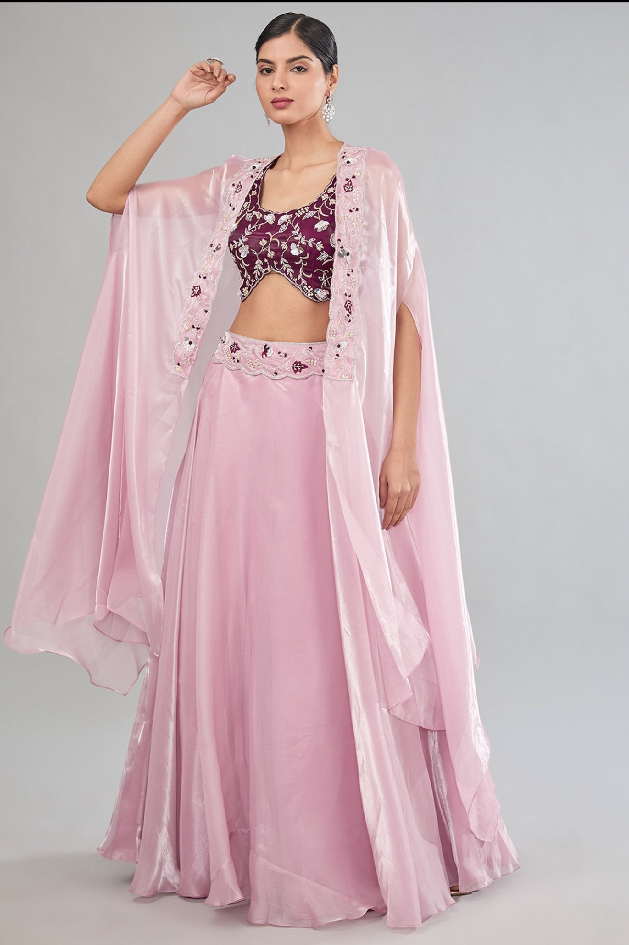 Italian Satin organza skirt with scallop detail embroidered belt. Paired with contrast plum embroidered blouse and cape
