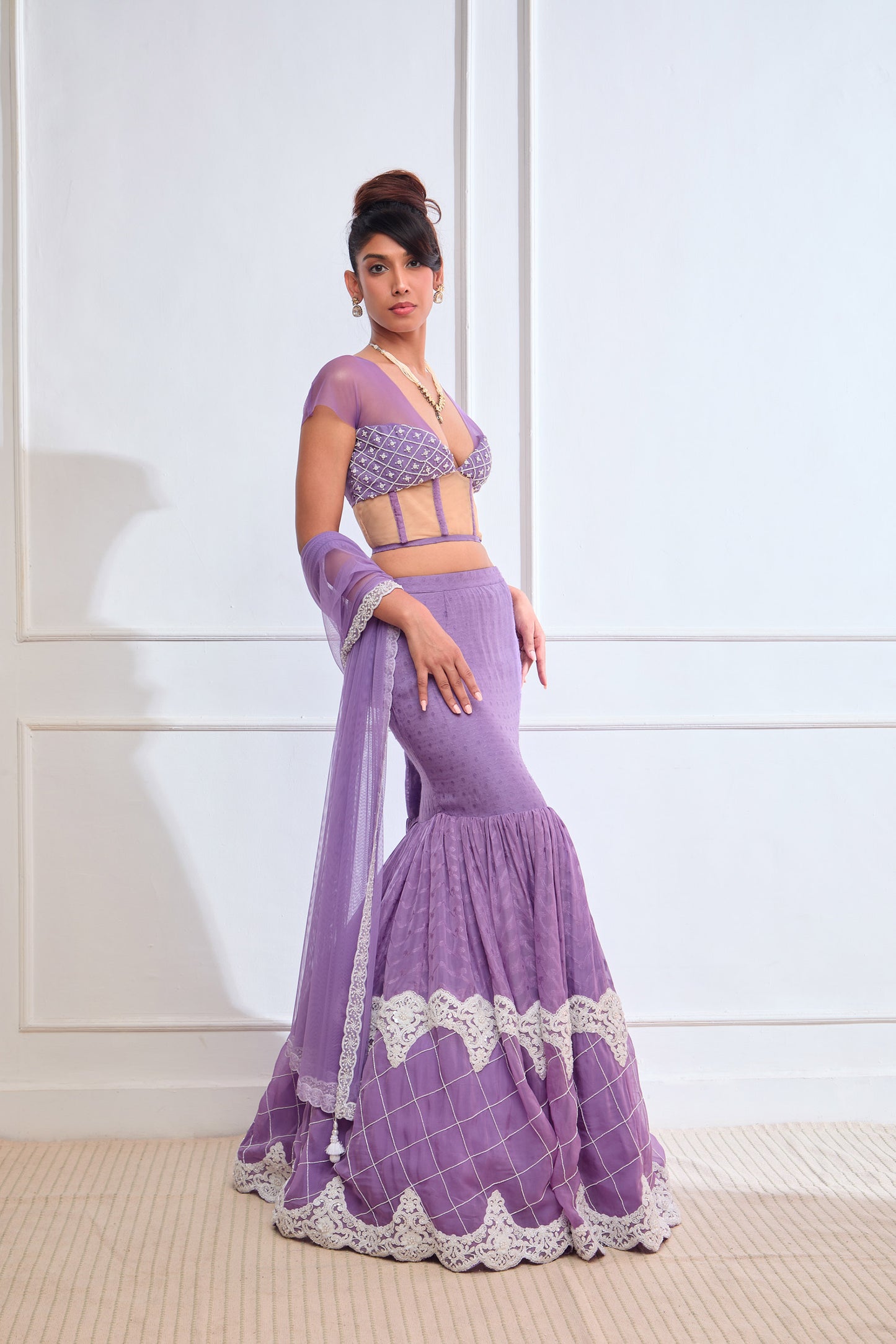 Purple Organza jamdani corset blouse and fish cut lehenga set