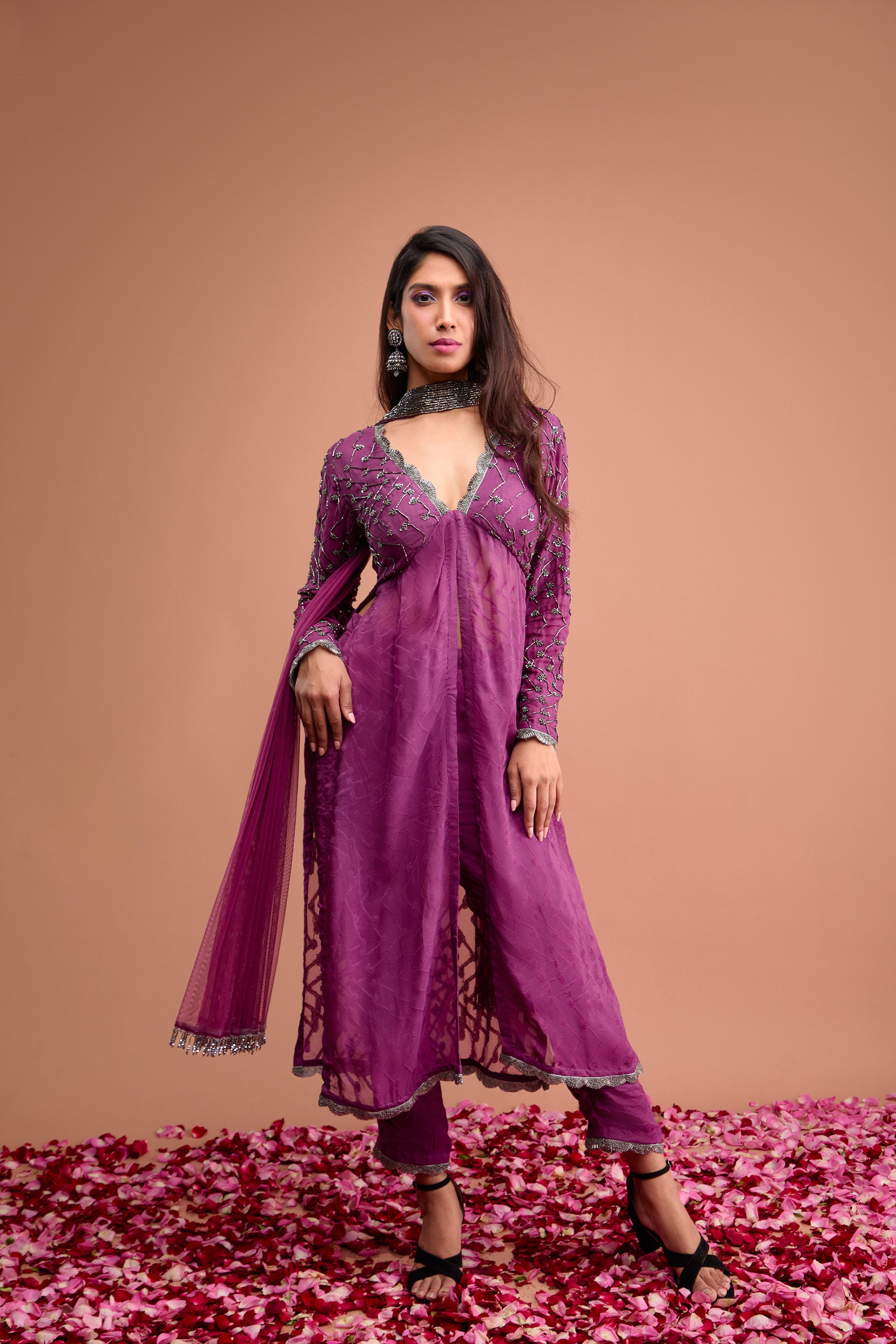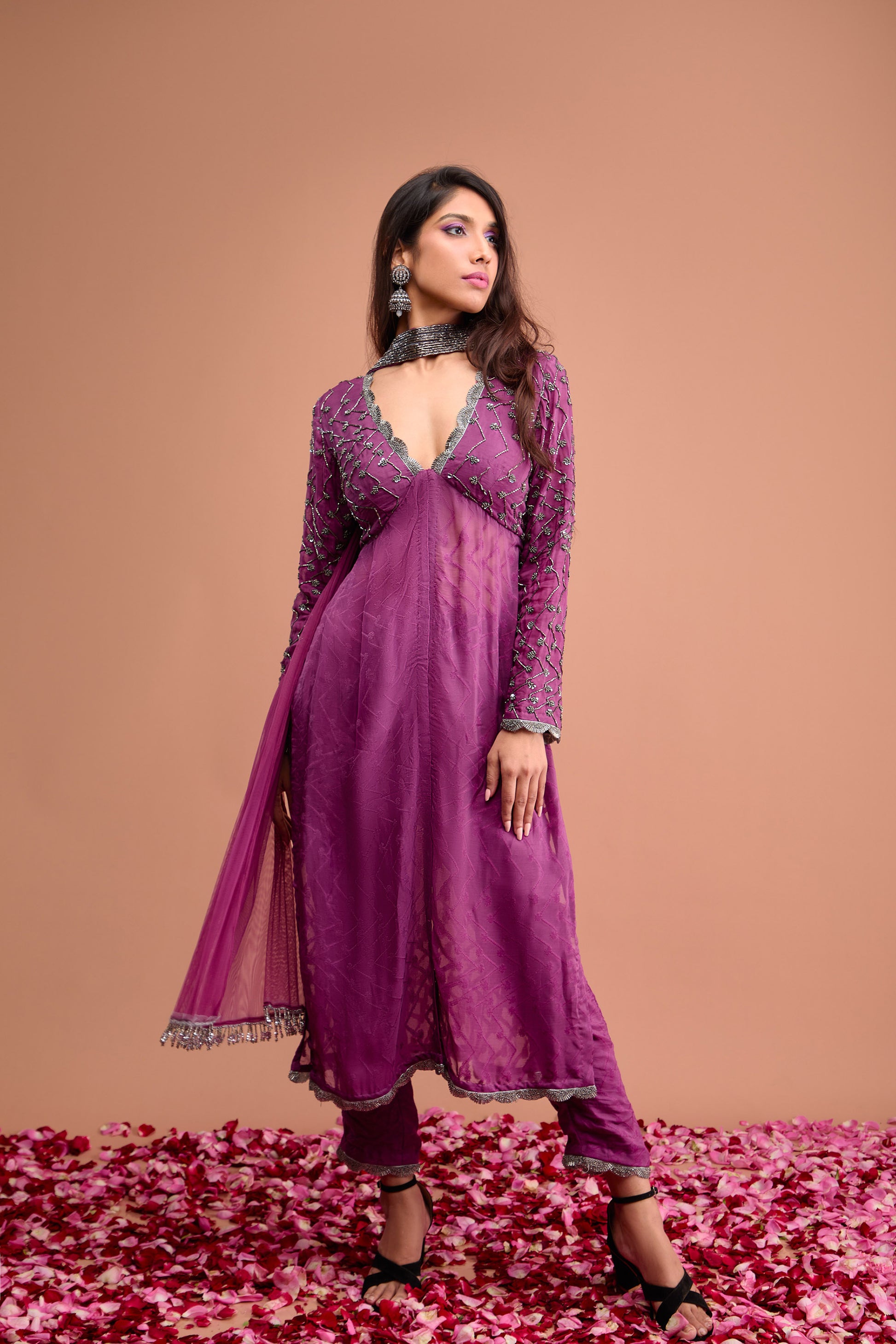 Full sleeved empire line straight fit embellished kurta with a center and side slits with embellished trousers and choker dupatta.