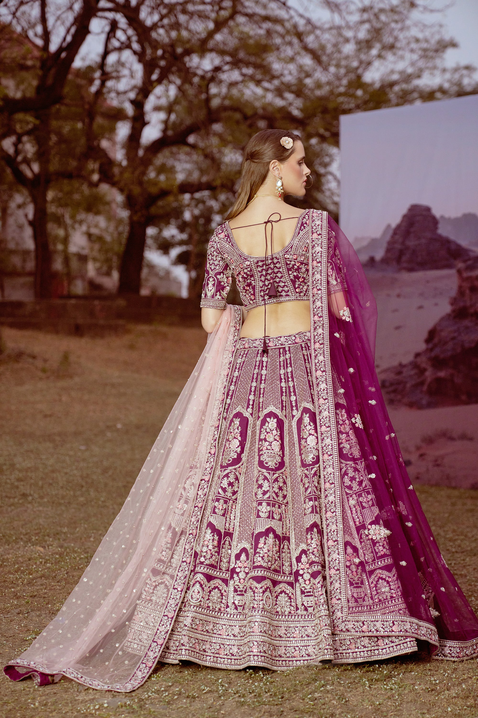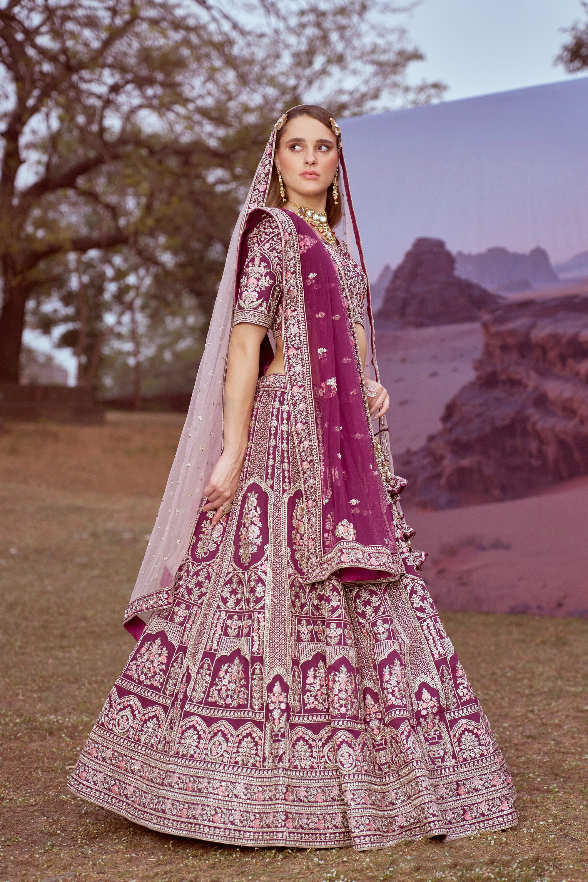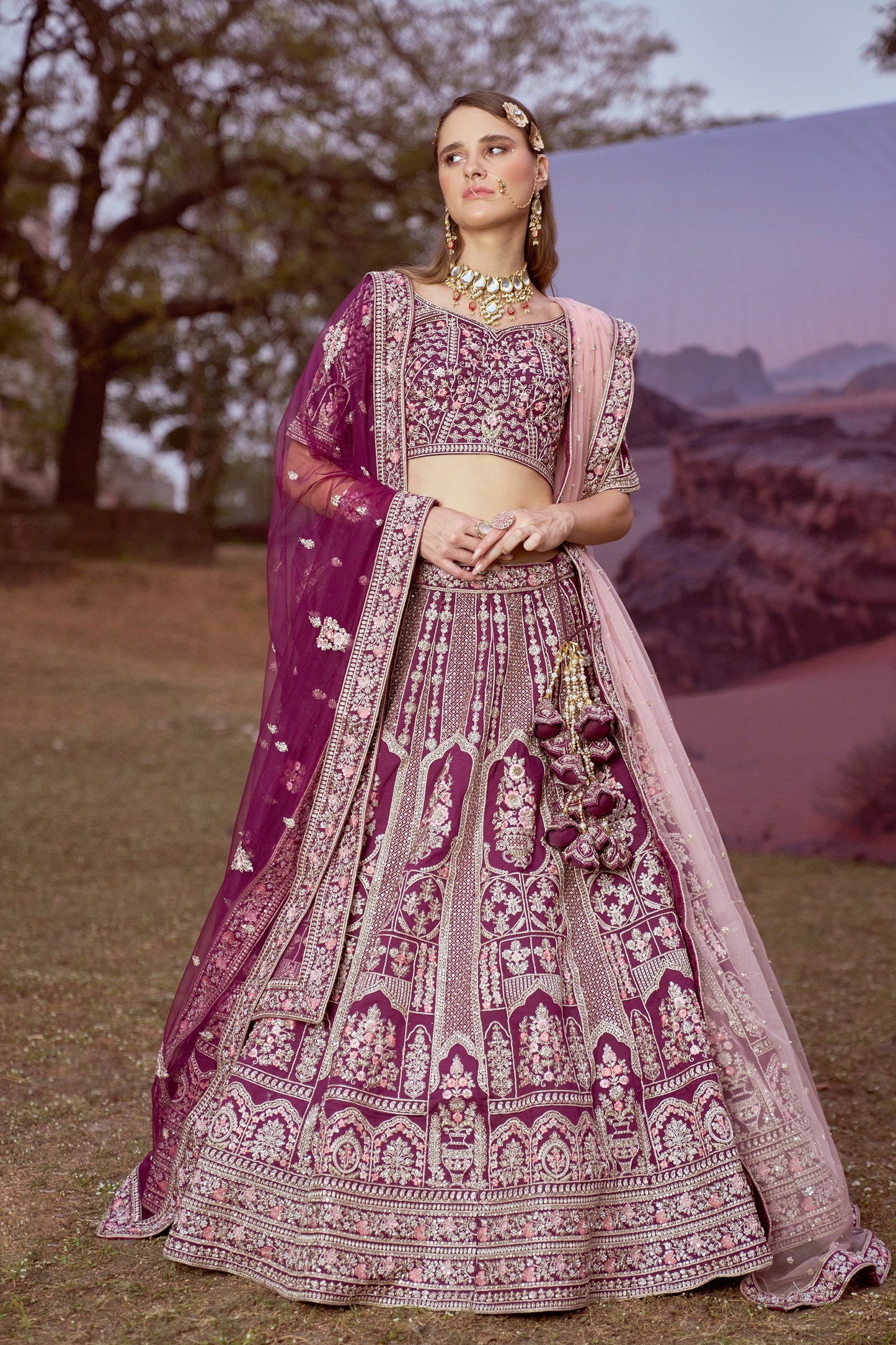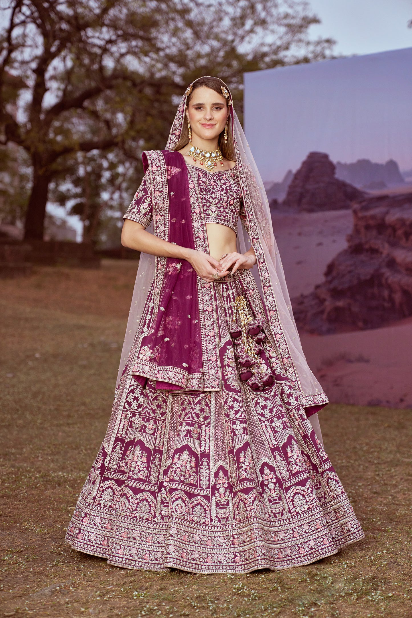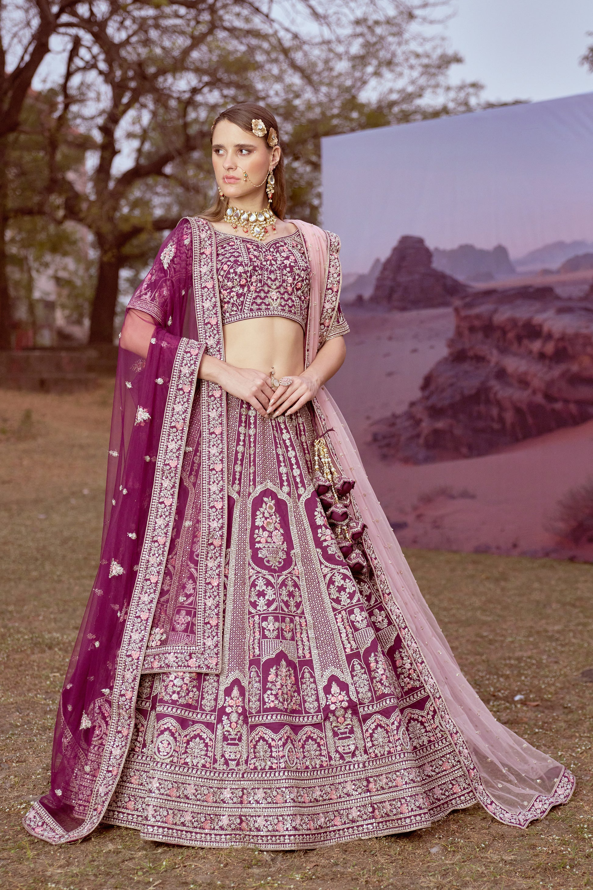 Purple Pure silk Moti, Sequins embroidery Bridal Lehenga