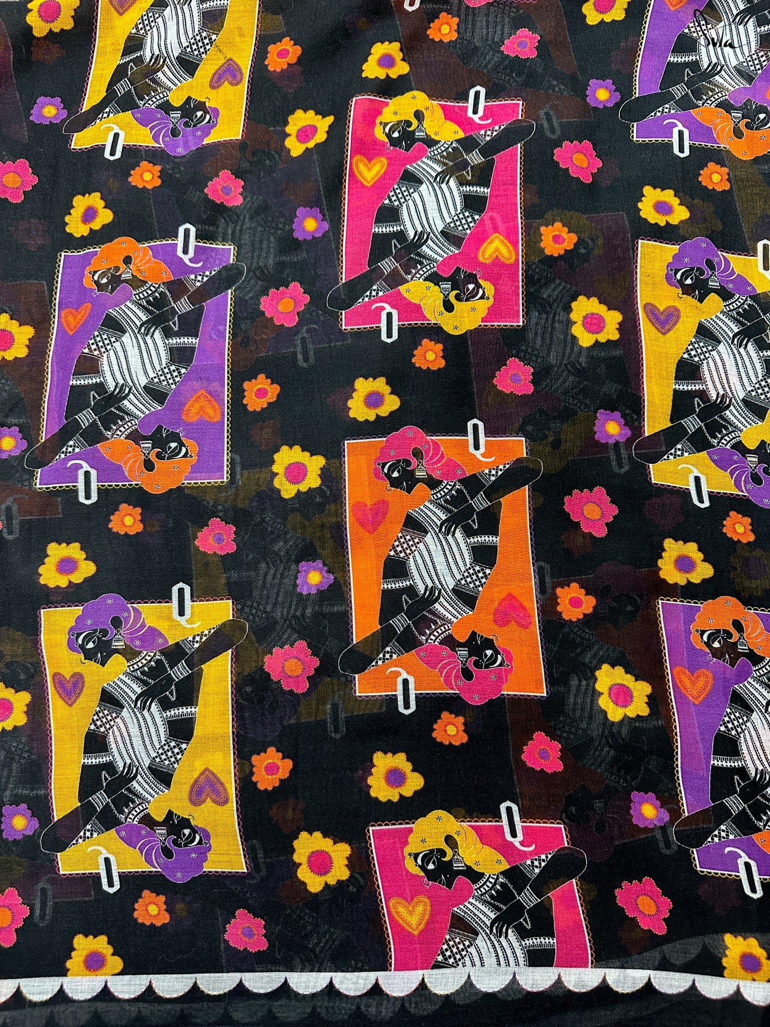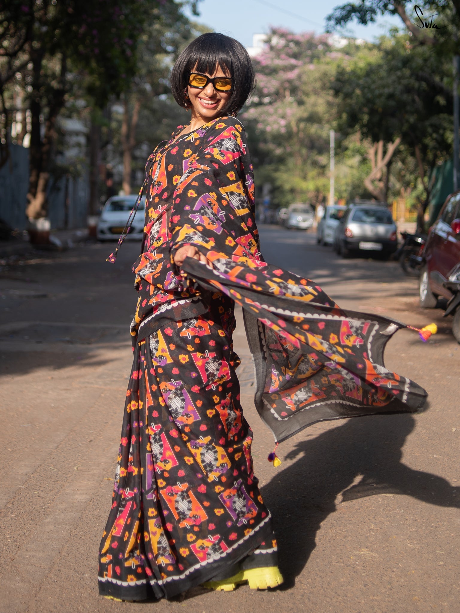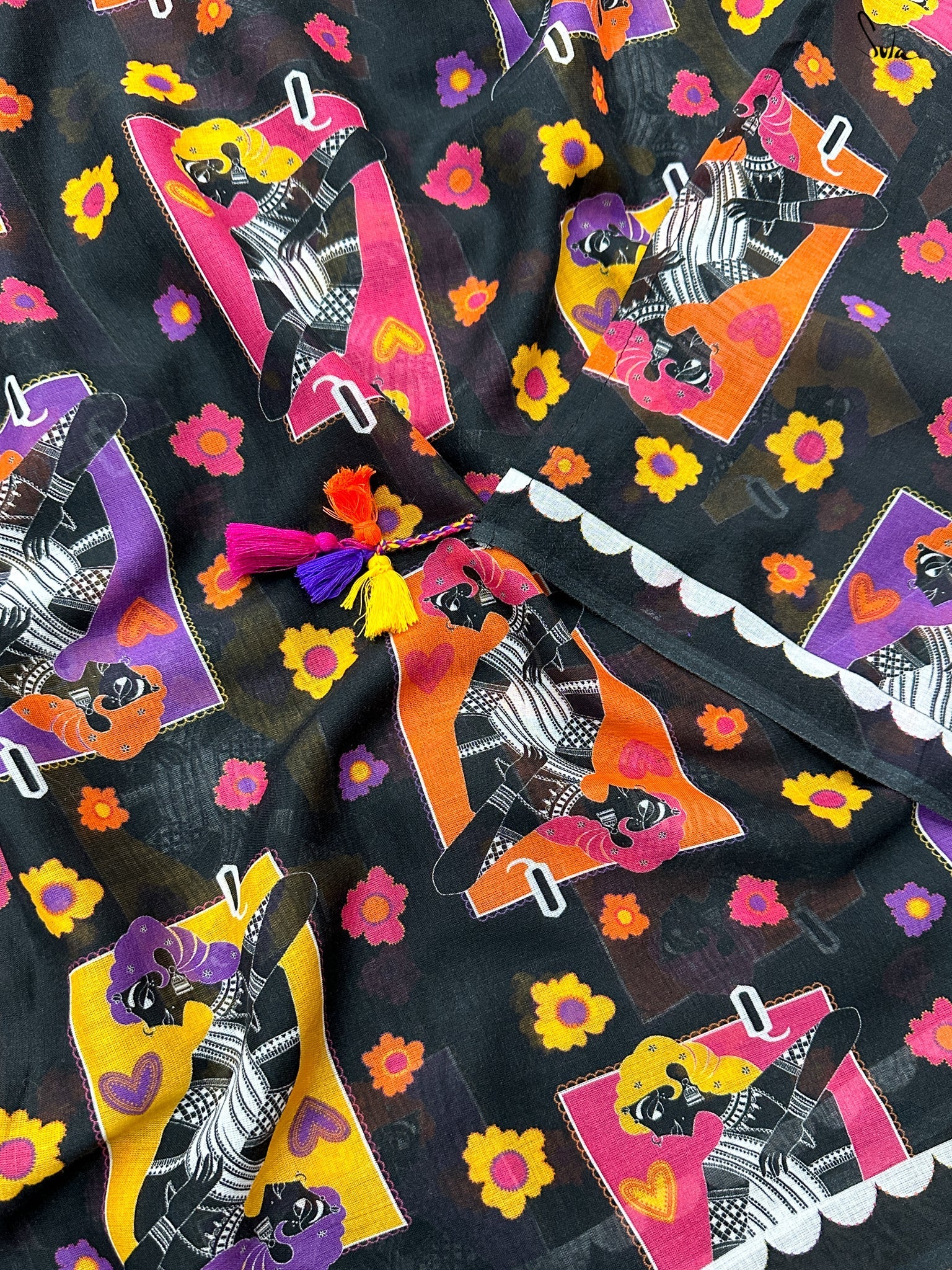 Rule hearts and rule minds, when you wear this stunning cotton-viscose saree with a playing cards-inspired print.