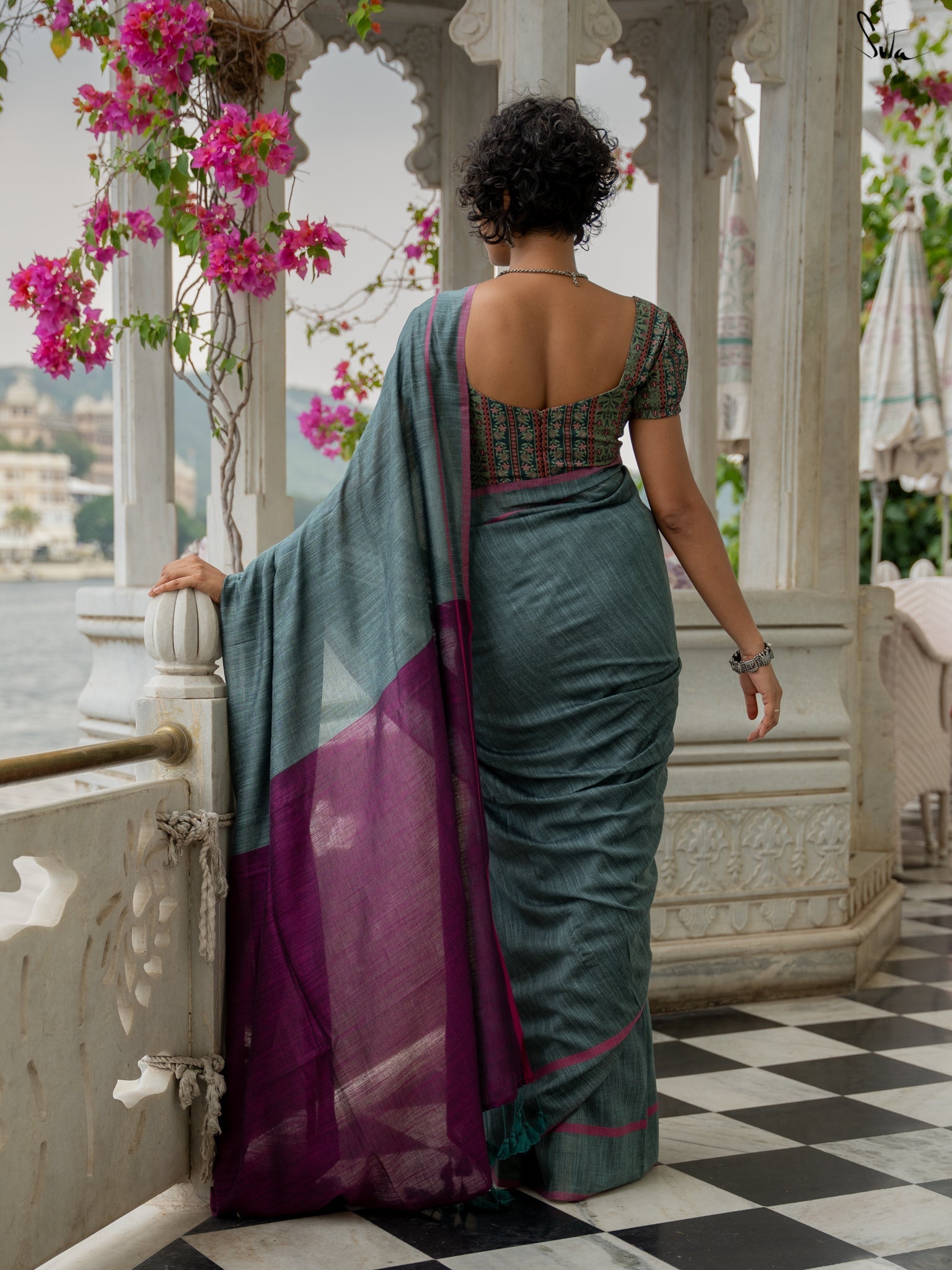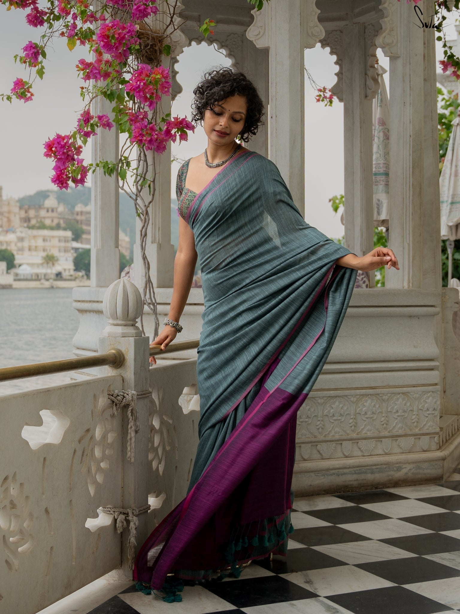 Introducing Quiet Qissa, a saree as soothing as a winter night’s hush! Woven from smooth cotton slub, its serene teal hue beautifully contrasts with a vibrant magenta border and pallu, adding a playful pop. Whether it’s a formal affair or a festive celebration, Quiet Qissa lets your calm charisma do all the talking. Draped elegance, redefined!