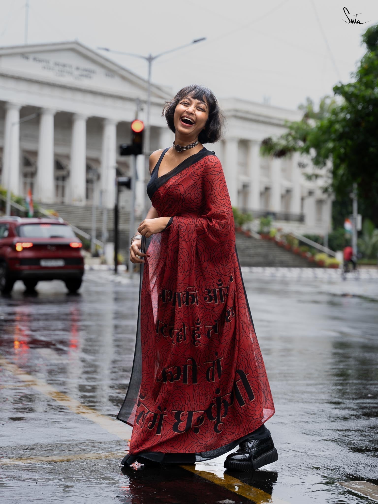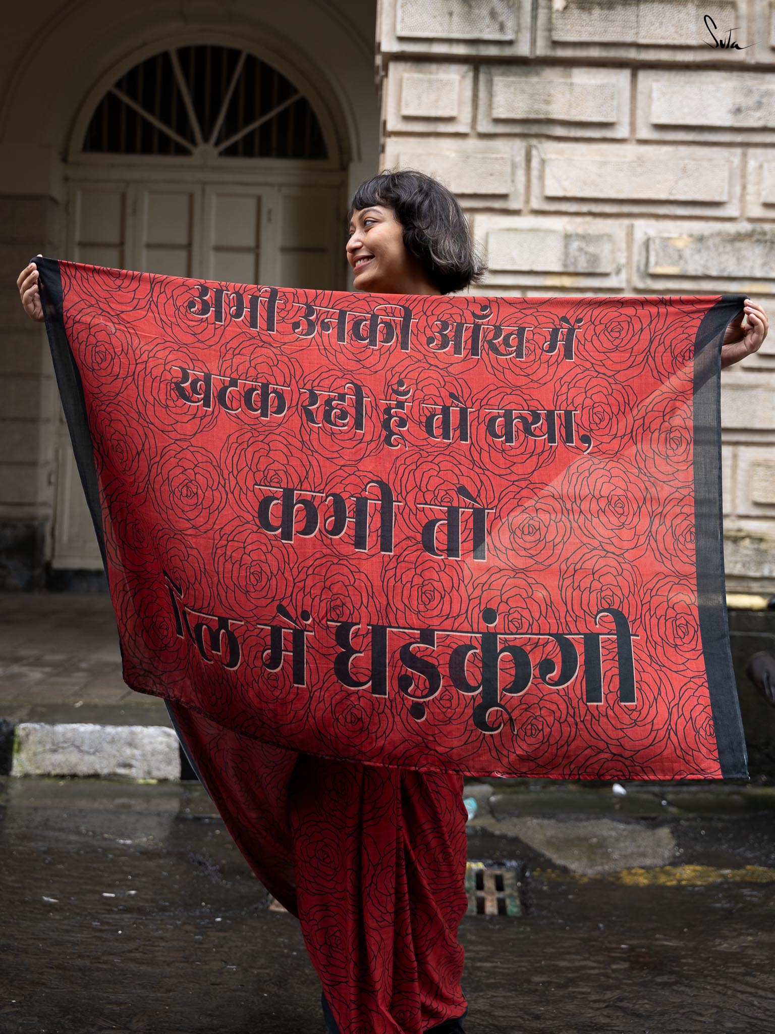 Suta's Mul Cotton sarees are a lovely blend of comfort and style. Crafted from lightweight Mul Cotton fabric, these sarees offer a soft, flowy drape. Presenting the Taapsee × Suta collection, capturing love and passion in every thread. The 'Raat Ka Gulaab' is a captivating maroon digitally printed saree, woven from buttery-soft Mul Cotton, featuring a black rose pattern across the body, a solid black border, and a pallu that reads, “Abhi Unki Aankh Mein Khatak Rahi Hu Toh Kya, Kabhi Toh Dil Mein Dhadkungi.” Designed to add grace to your look, make space in your wardrobe for this Raat Ka Gulaab Mul Cotton saree.