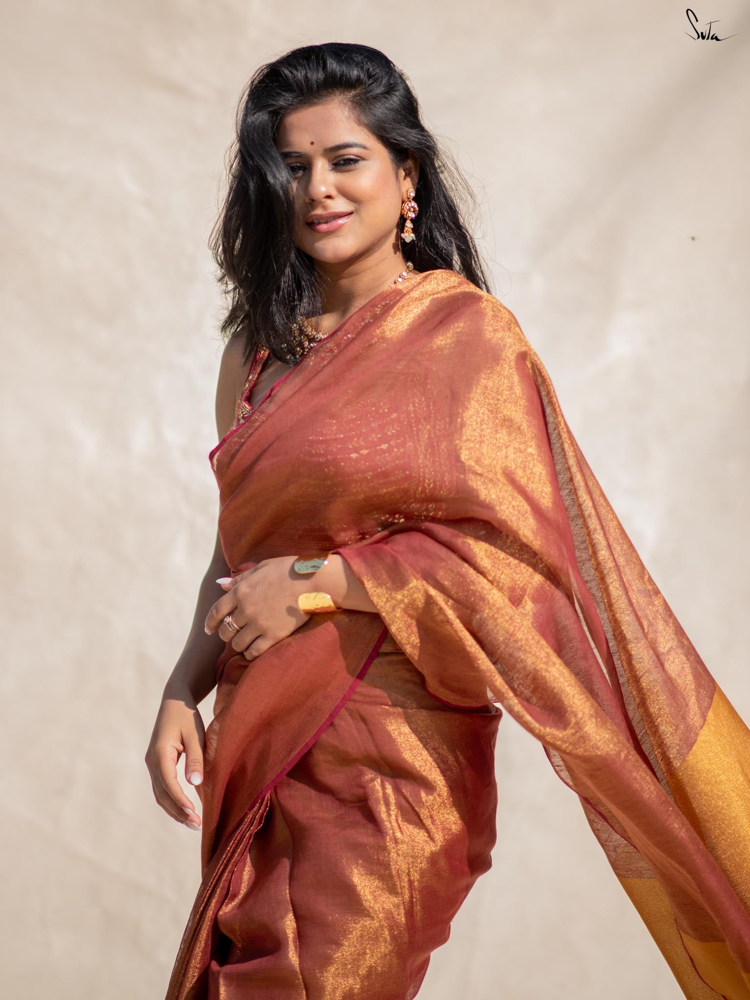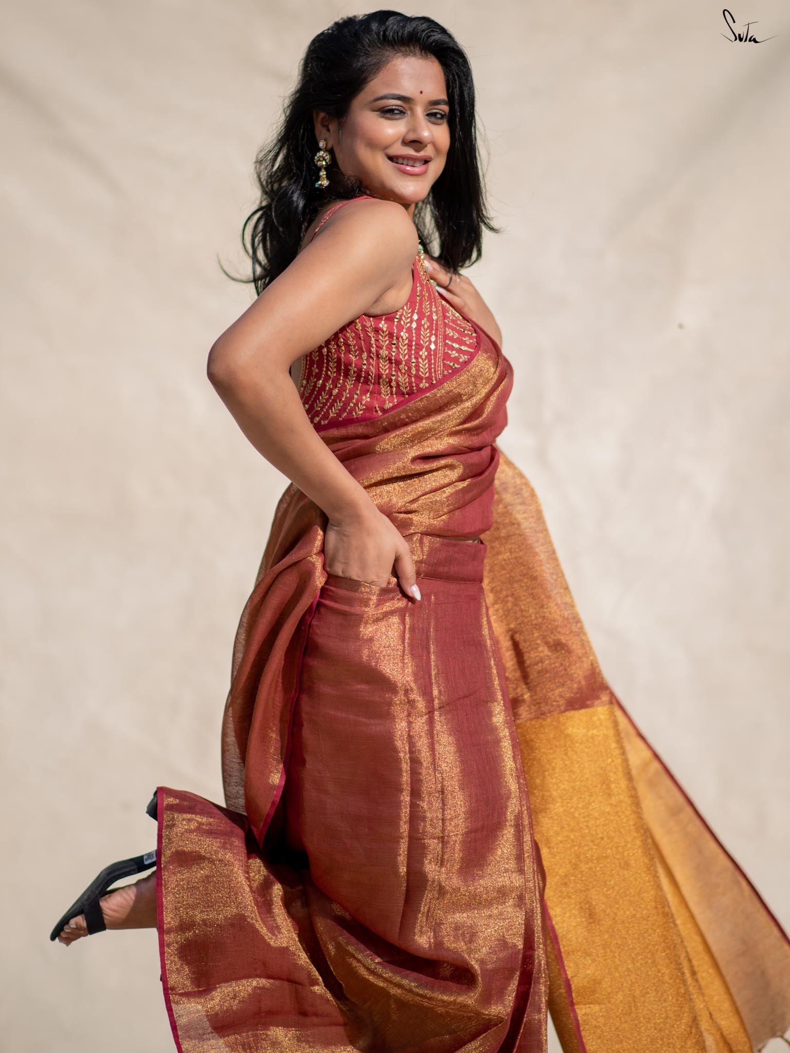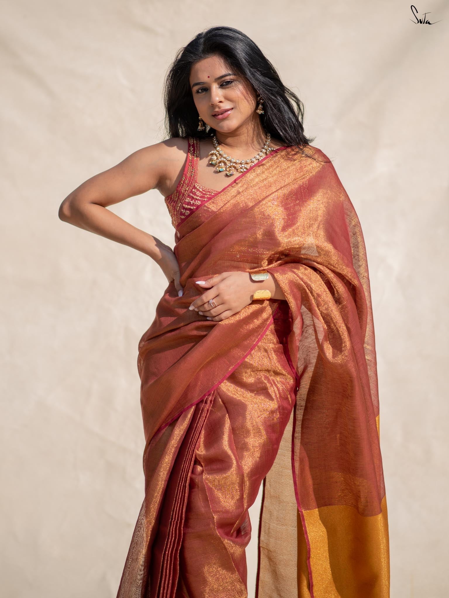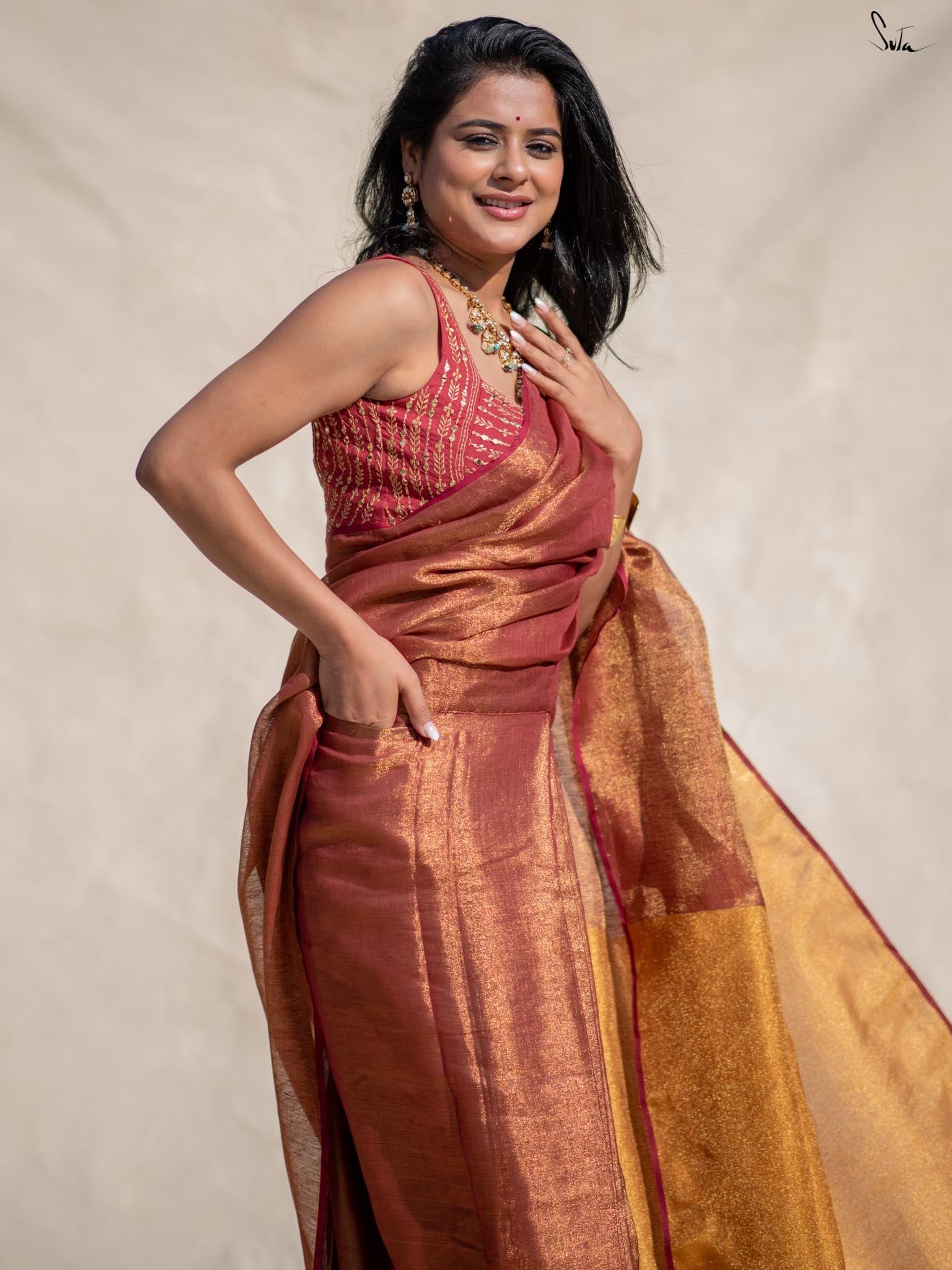 Raga Todi, a beautiful pink saree made from lightweight linen zari, features a contrasting gold pallu that adds sophistication. With built-in adjustable loops, a matching lining, and a small pocket, this saree offers ultimate comfort, ready to wear in under 30 seconds for any occasion.