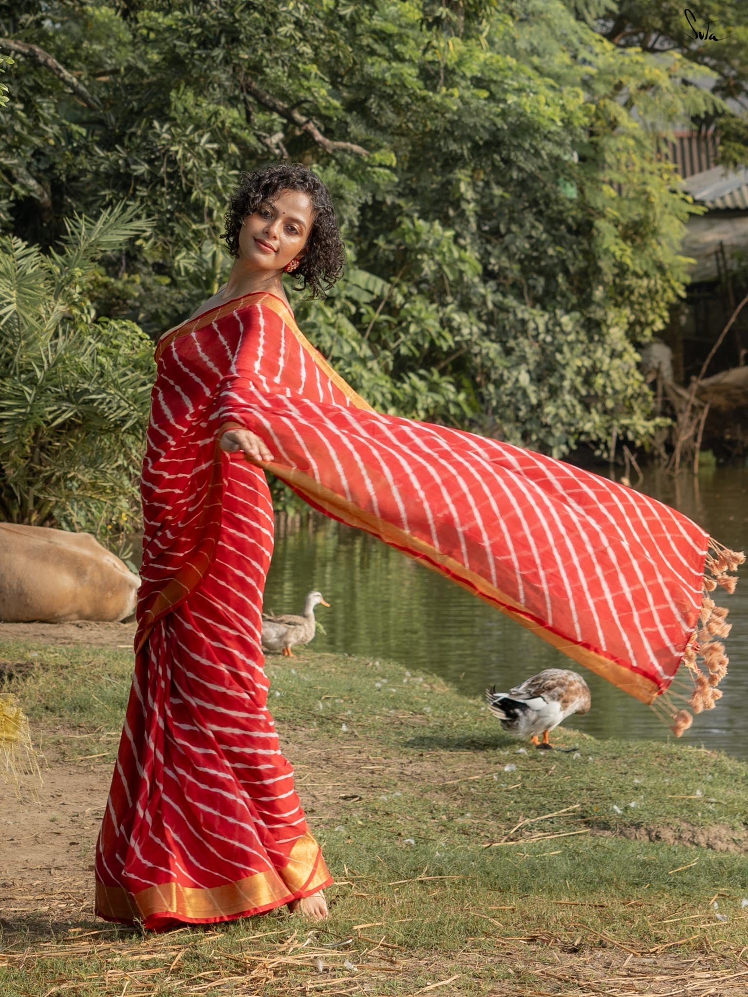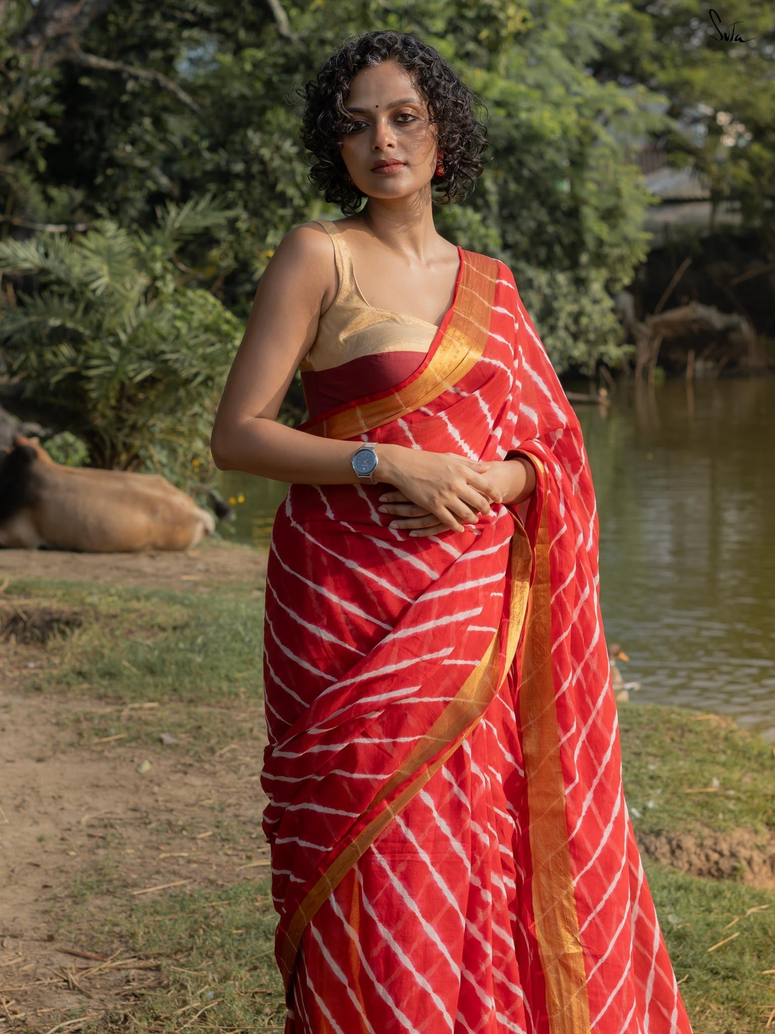 Inspired by the Sanskrit word rakta, meaning "red," Raktika is a vibrant celebration of love and passion. The feather-light mul cotton saree showcases a bold red hue with white leheriya, crafted using the traditional tie-and-dye method. Add a whimsical charm to your wardrobe with Raktika, a saree that exudes simplicity and vibrancy in every fold.