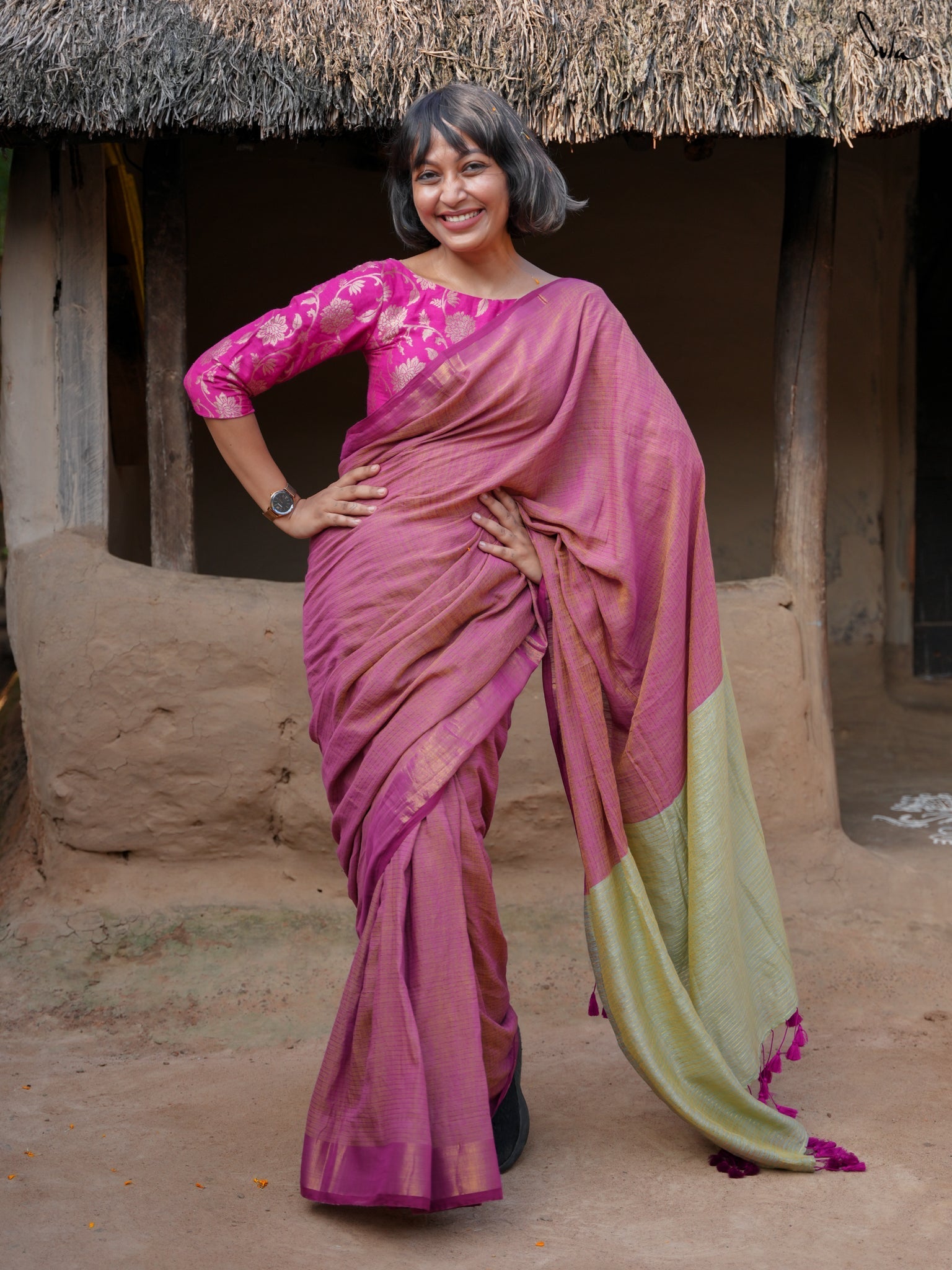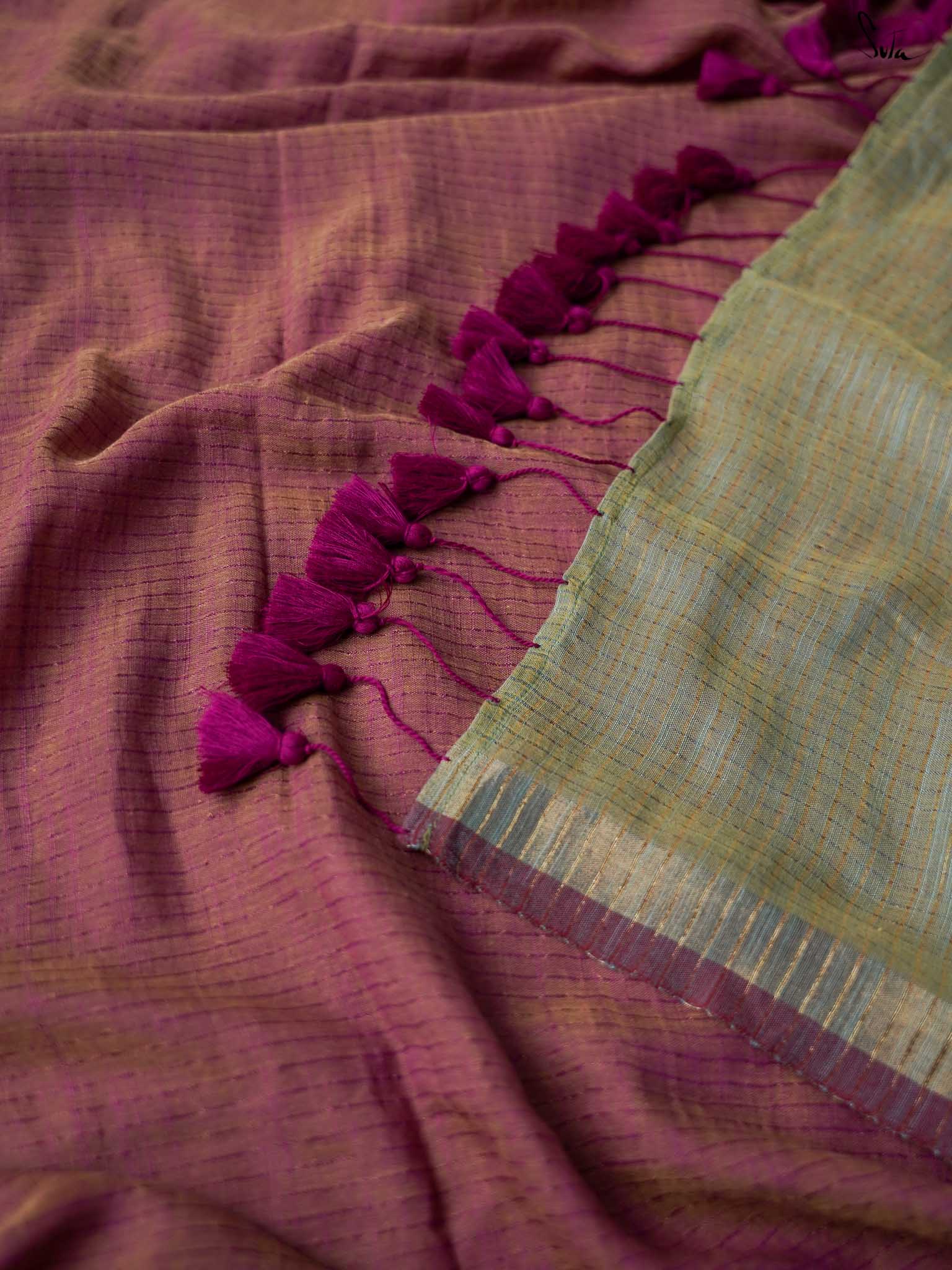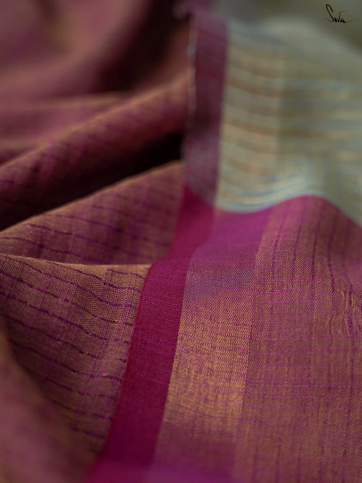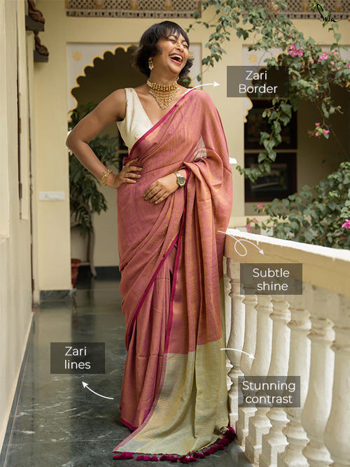 Embrace the beauty within as you drape yourself in this heavenly Rangeen Aasman, a cotton slub saree adorned with zari stripes throughout the drape. This dual-colored saree is intricately crafted with a yellow warp and a magenta weft featuring a zari border and a contrastingdual-color pallu that adds the golden hour charm to your look.