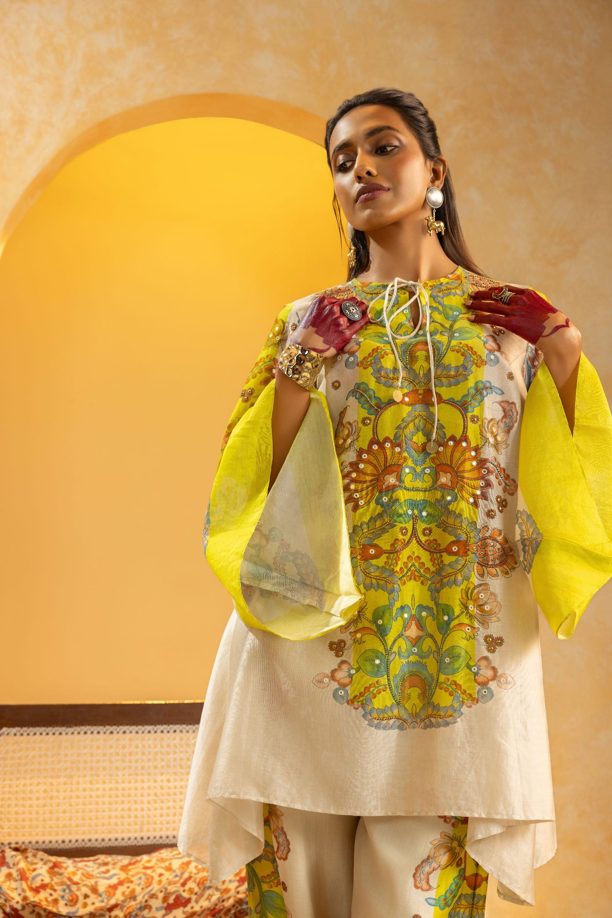 Off-white Rangtara embellished kurta with fllaired sleeves, paired with printed straight pants in chanderi.