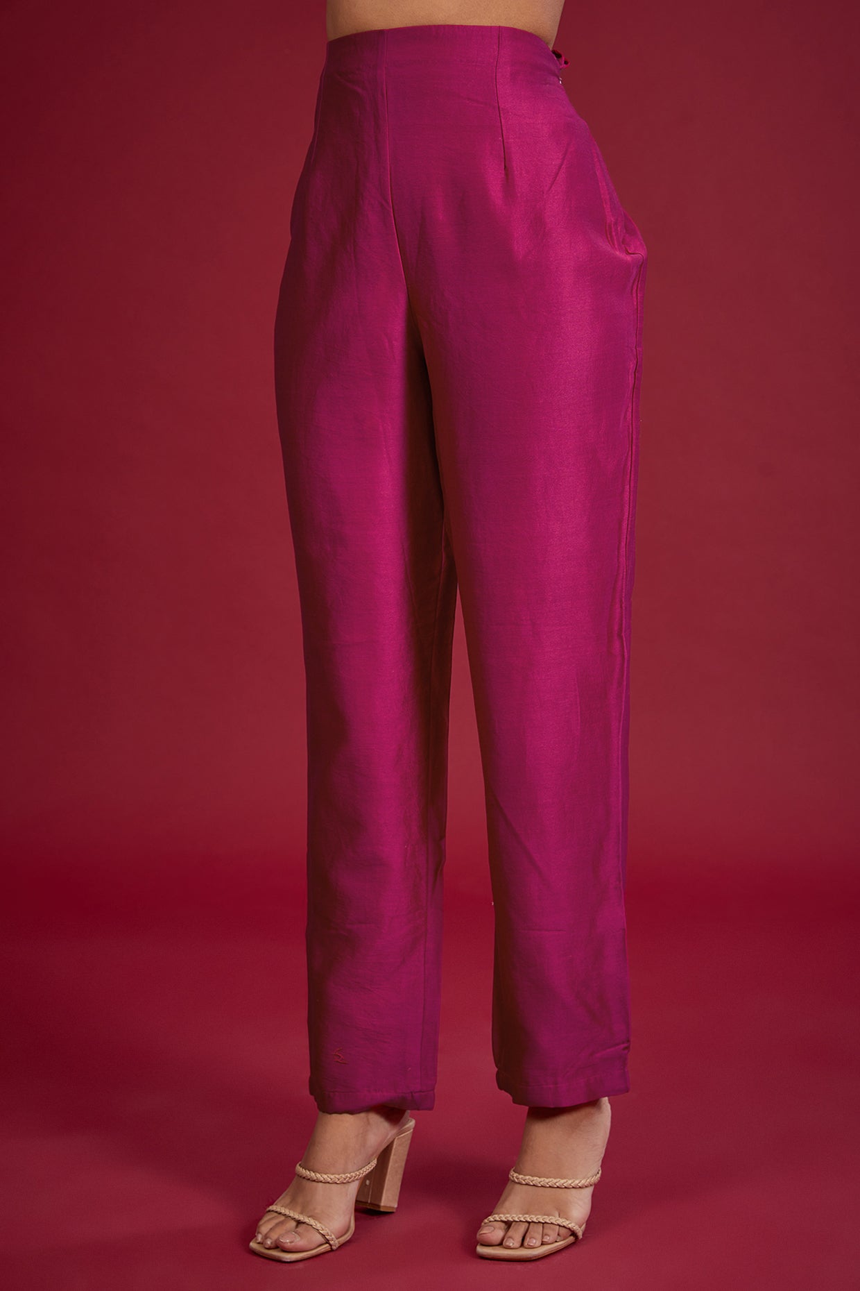 Featuring A Rani Pink High-Low Kurta In Chanderi Base With Sequins, Cutdana, Hand And Machine Embroidery. It Is Paired With Pants. Perfect Wear For Festive Occasions Or Wedding Ceremony.