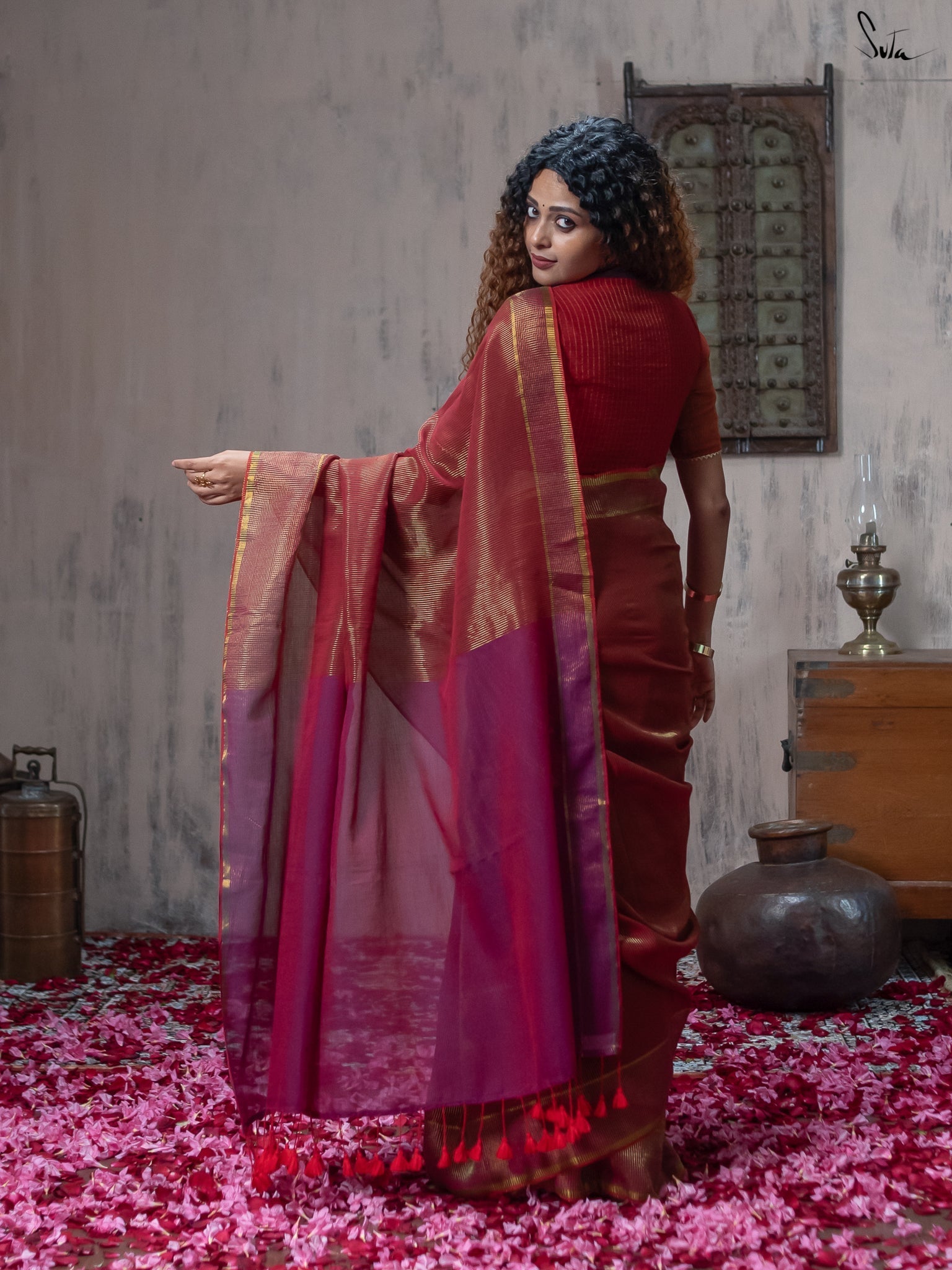 Be your own true inspiration in this elegant maroon and magenta-hued saree thats made of light-as-air mul-mul cotton and infused with shimmering zari.