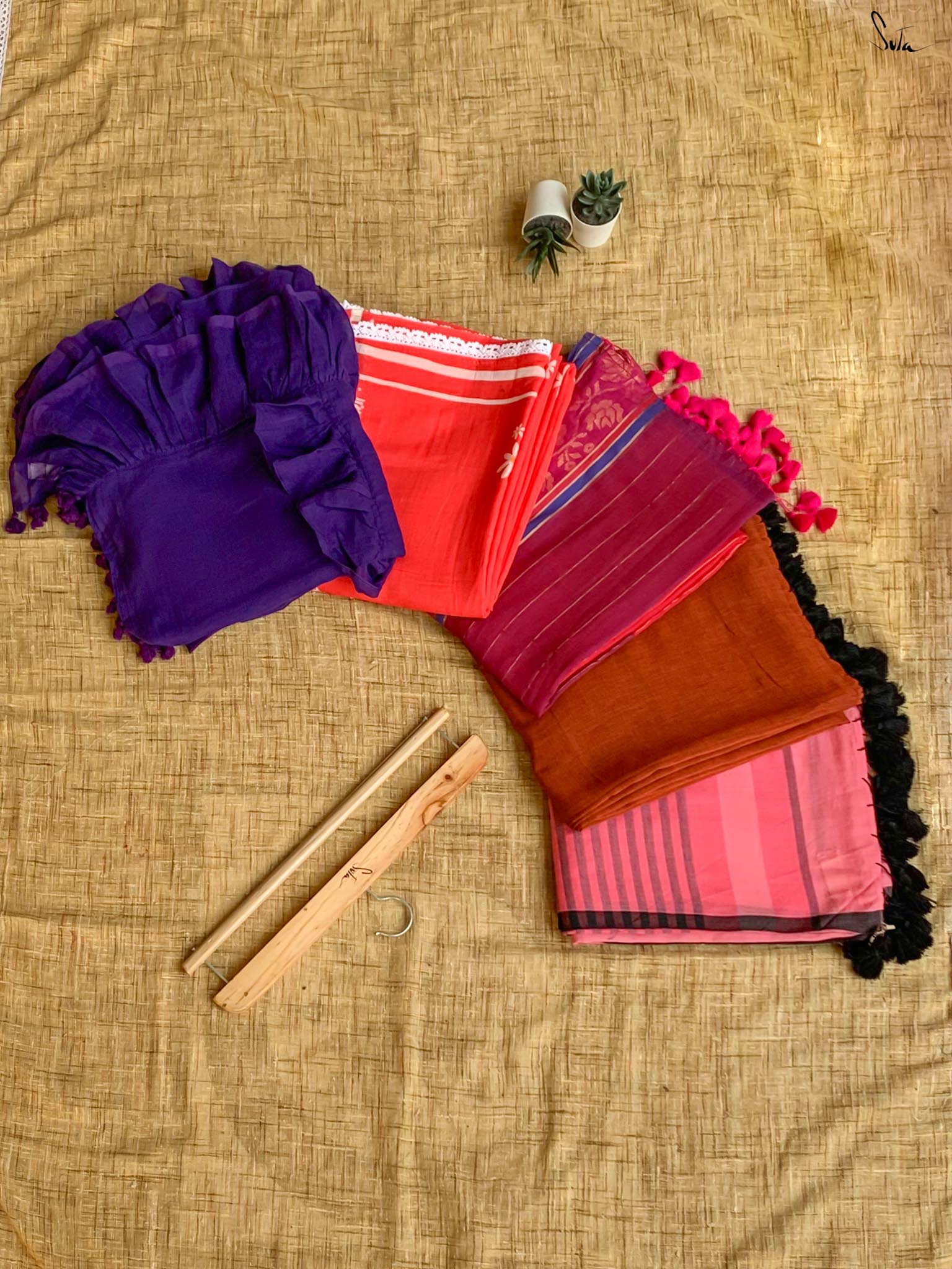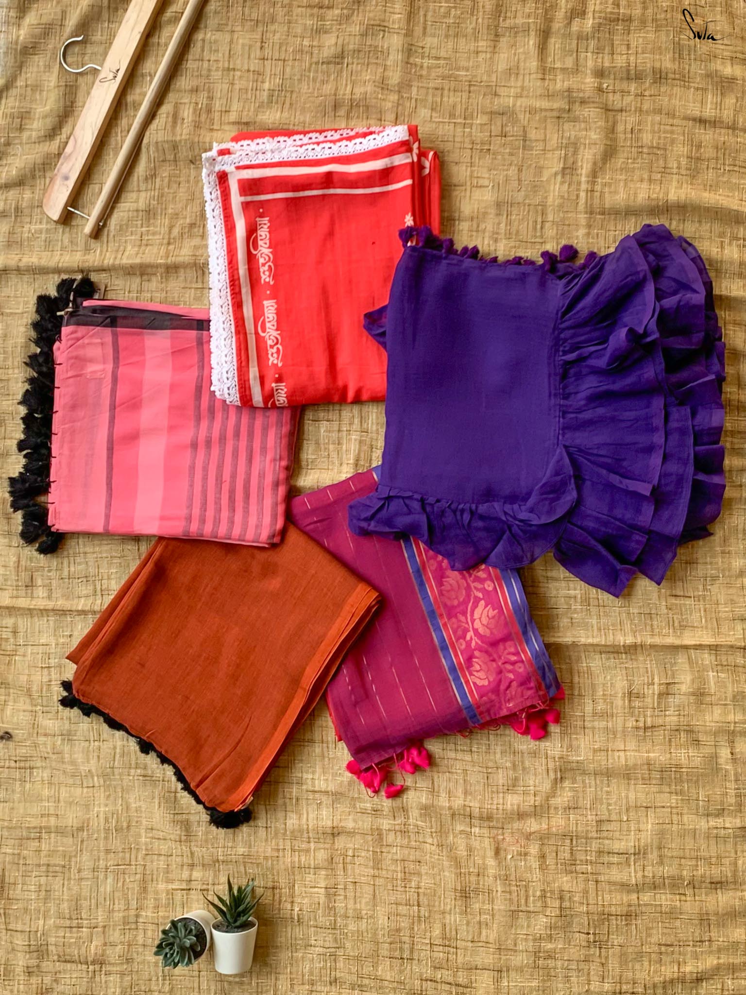 Radiate confidence and elegance with Ray of Pride. This combo includes sarees like Rustic, Songs of Stardust, Shiuli Shokal, Gulabi Chidiya, and Raw Ink Koochi. Bold, vibrant colors and intricate designs make these sarees an ideal choice for making a statement wherever you go, with the perfect mix of tradition and contemporary flair.